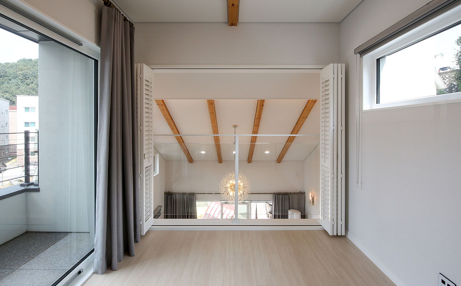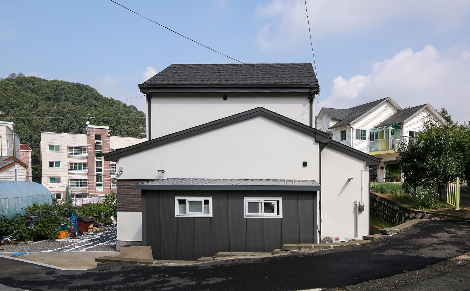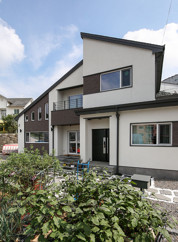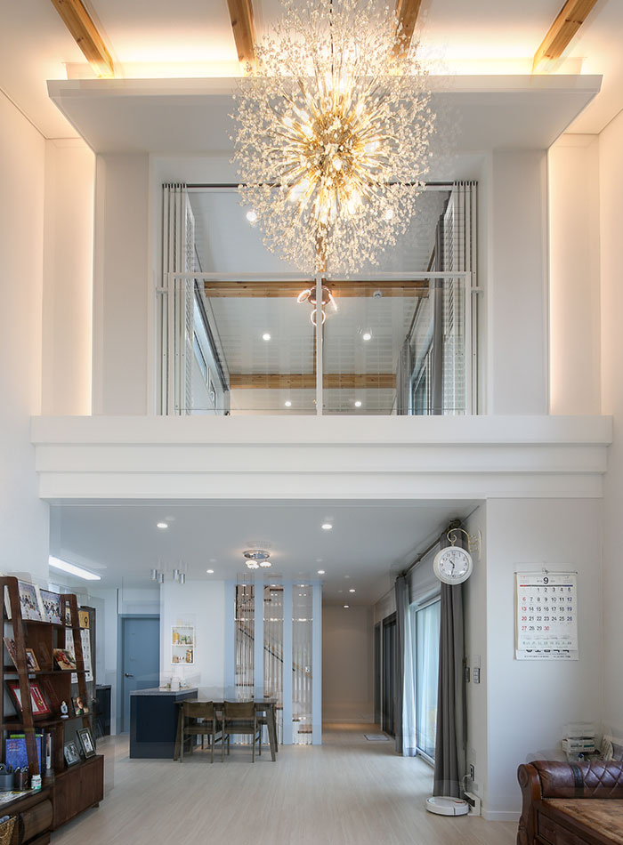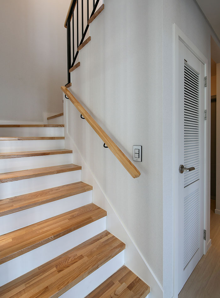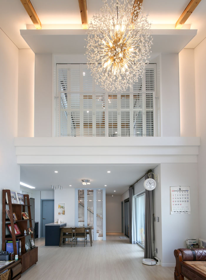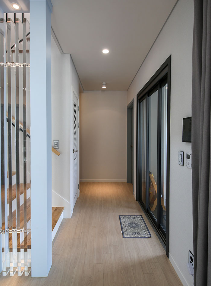 경기 파주, 도심지에 가까운 위치에 지어진 주택은 수려한 자연을 벗 삼은 전원주택은 아니지만, 일상의 즐거움을 누리기 부족함이 없는 편안함을 담고 있다. 36py 중목구조 주택으로 지어진 주택은 박스 형태의 매스에 사선적 요소를 가미하여 경쾌하고 세련된 이미지를 연출하였다. 내부로 들어서면 좌측 매스의 사선 지붕이 느껴지는 거실은 중목의 보를 자연스럽게 노출시켜 내추럴한 인테리어 효과를 더하였다. 거실과 마주하는 2층 가족실에는 유리 난간과 루버셔터를 설치해 시선의 방해 없이 두 공간이 마주할 수도 분리될 수도 있게 하였으며, 중목구조 주택의 장점을 살려 전반적으로 차분한 안정감이 느껴질 수 있는 공간을 연출하였다.