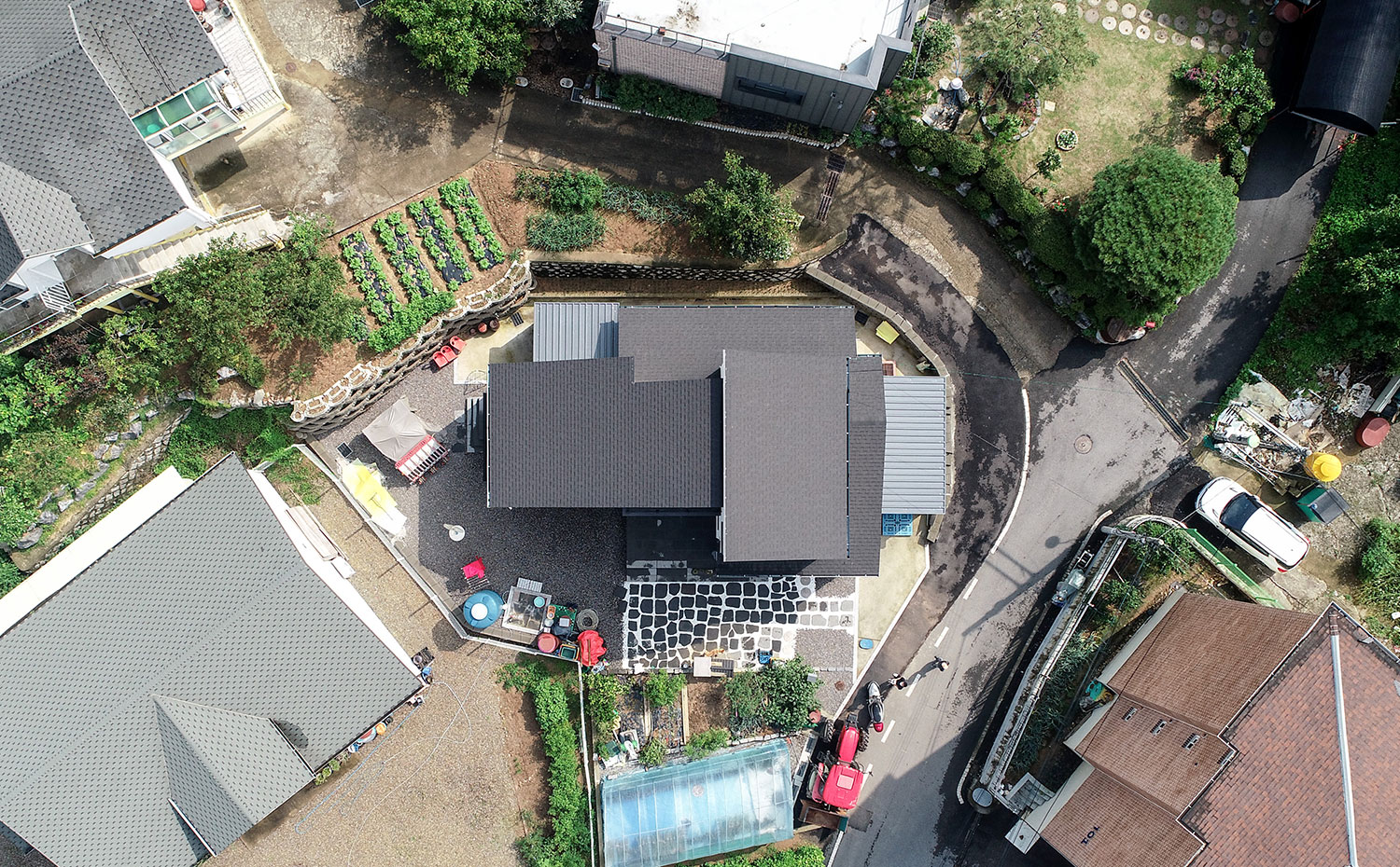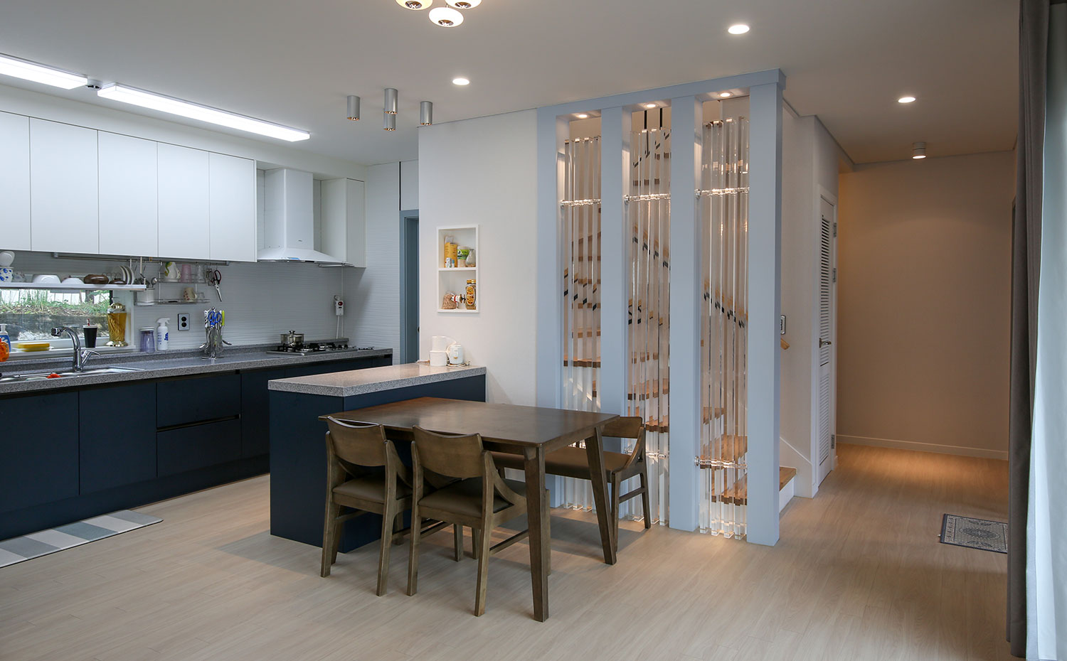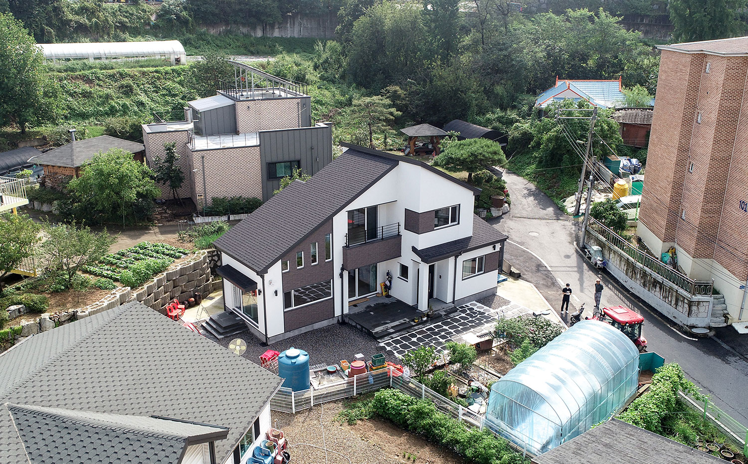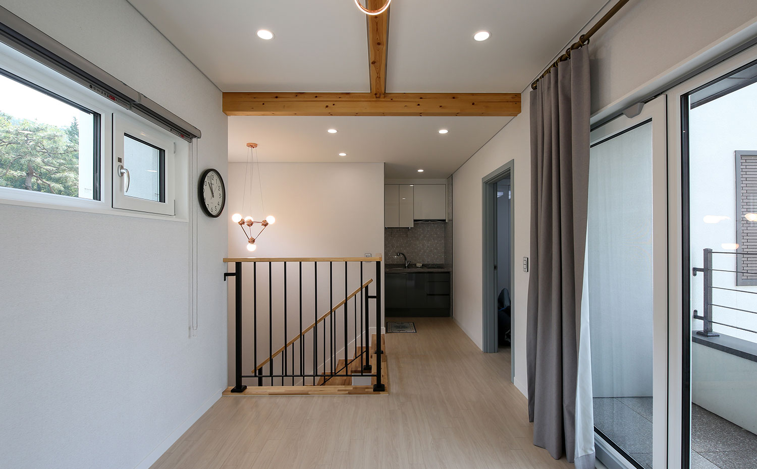 경기 파주, 도심지에 가까운 위치에 지어진 주택은 수려한 자연을 벗 삼은 전원주택은 아니지만, 일상의 즐거움을 누리기 부족함이 없는 편안함을 담고 있다. 36py 중목구조 주택으로 지어진 주택은 박스 형태의 매스에 사선적 요소를 가미하여 경쾌하고 세련된 이미지를 연출하였다. 내부로 들어서면 좌측 매스의 사선 지붕이 느껴지는 거실은 중목의 보를 자연스럽게 노출시켜 내추럴한 인테리어 효과를 더하였다. 거실과 마주하는 2층 가족실에는 유리 난간과 루버셔터를 설치해 시선의 방해 없이 두 공간이 마주할 수도 분리될 수도 있게 하였으며, 중목구조 주택의 장점을 살려 전반적으로 차분한 안정감이 느껴질 수 있는 공간을 연출하였다.