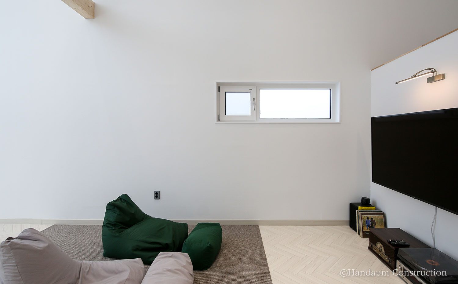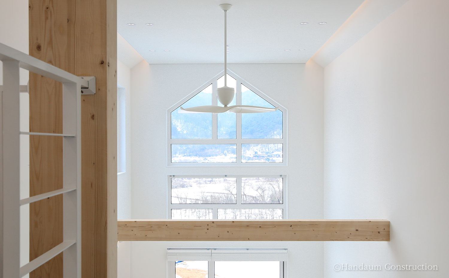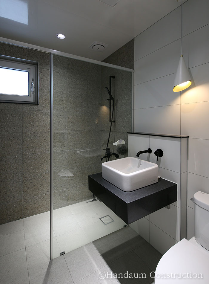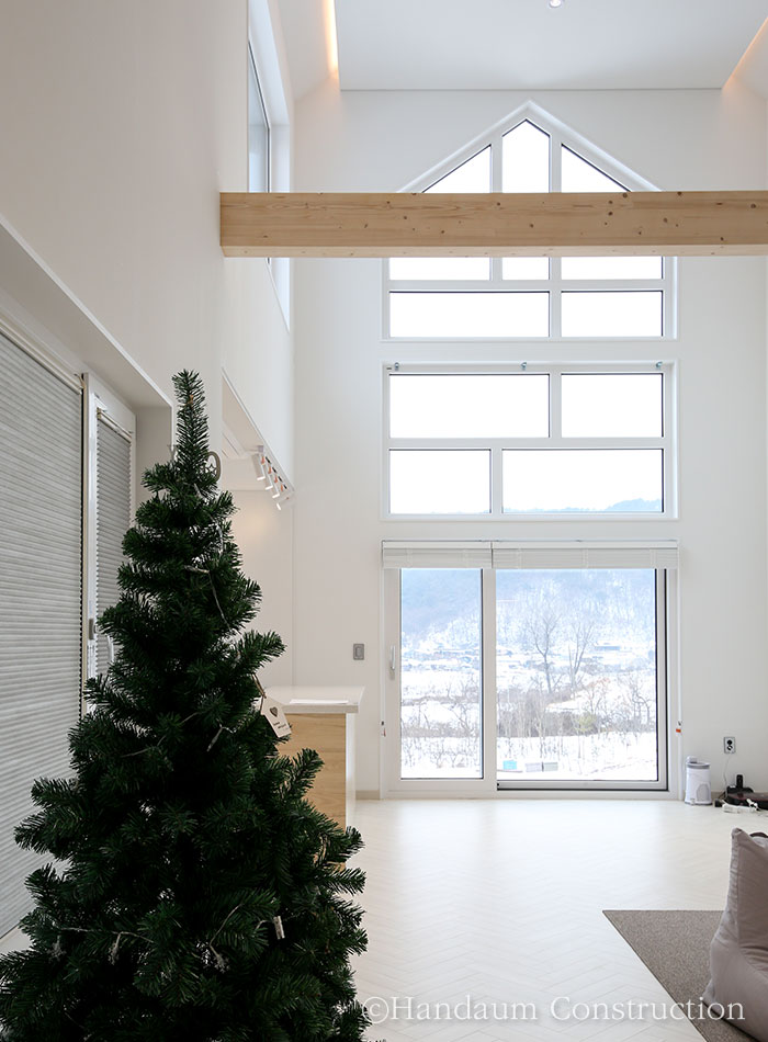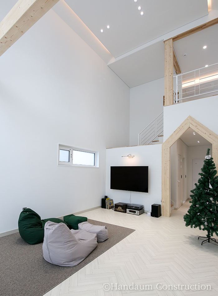 전원주택의 입면 형태에서 지붕의 모양은 전반적인 주택의 이미지를 좌, 우하기도 한다. 그중에서도 박공지붕은 전원주택 하면 흔하게 떠올리는 이미지라 할 수 있을 만큼 익숙하고 편안한 이미지를 느낄 수 있는 기본적인 지붕의 형태이기도 하다. 30평대로 시공된 이번 주택은 이런 박공의 형태를 내, 외부의 포인트 요소로 활용한 디자인과 설계가 돋보이는 사례로 일직선상으로 길게 펼쳐진 평면가지고 있지만 보는 측면에 따라 주택의 이미지가 달라진다. 특히 진입로 방향에서의 높낮이가 다른 2개의 박공지붕의 깔끔한 이미지 외에도 진입로 반대쪽의 매스 디자인을 살린 창을 통해 또 다른 분위기를 느낄 수 있다. 이러한 디자인 포인트는 내부에서도 독특한 디자인 요소로 작용하는데 주택 내, 외부의 포인트를 일관성 있게 적용하여 그 개성을 더욱 뚜렷하게 드러낸다. 1~2인 가족 구성원에 초점을 맞춘 공간구성과 편안함을 느낄 수 있는 인테리어가 어우러진 주택은 다른 주택들과 다른 개성을 담백하게 잘 표현해내었다.