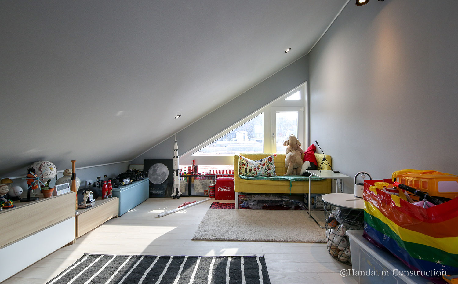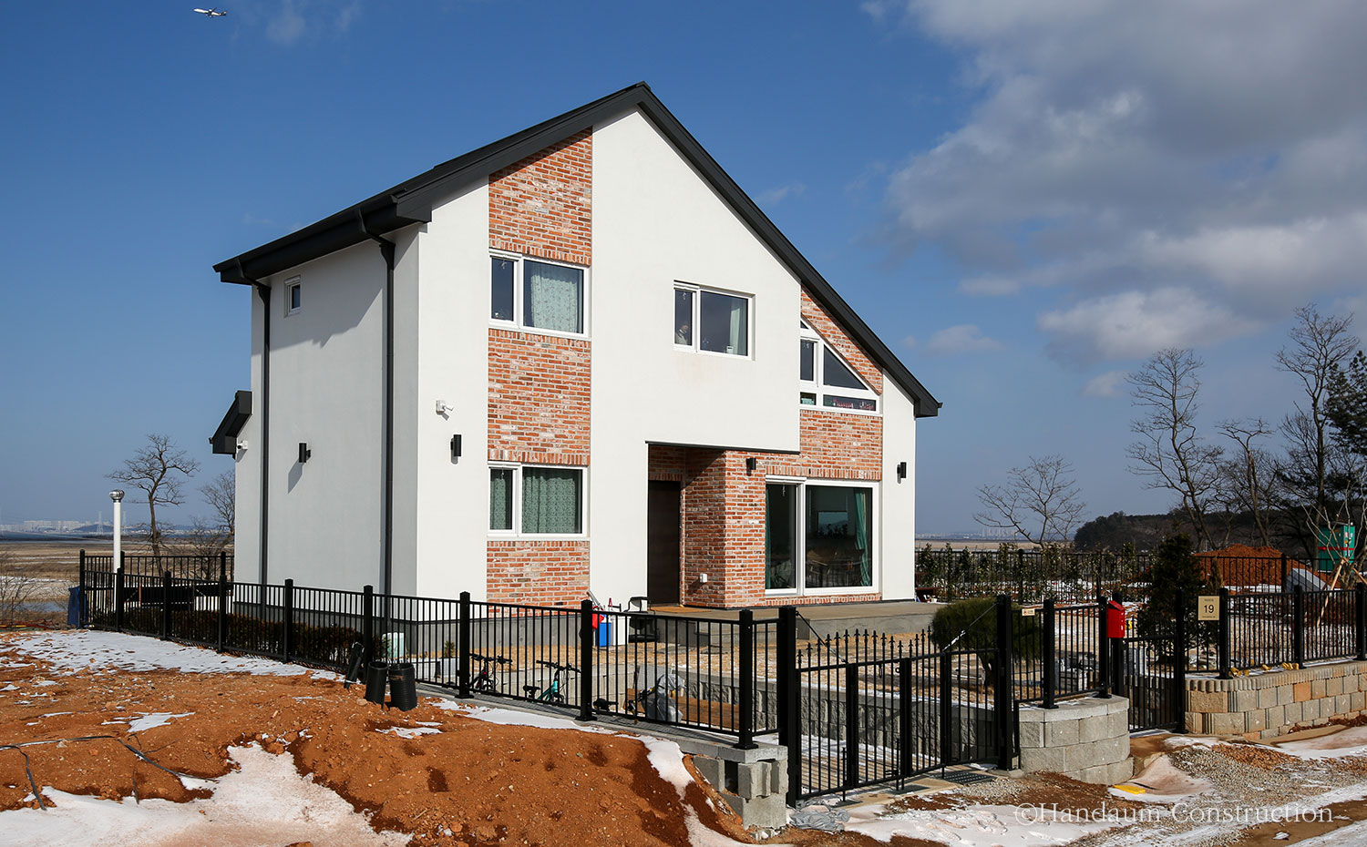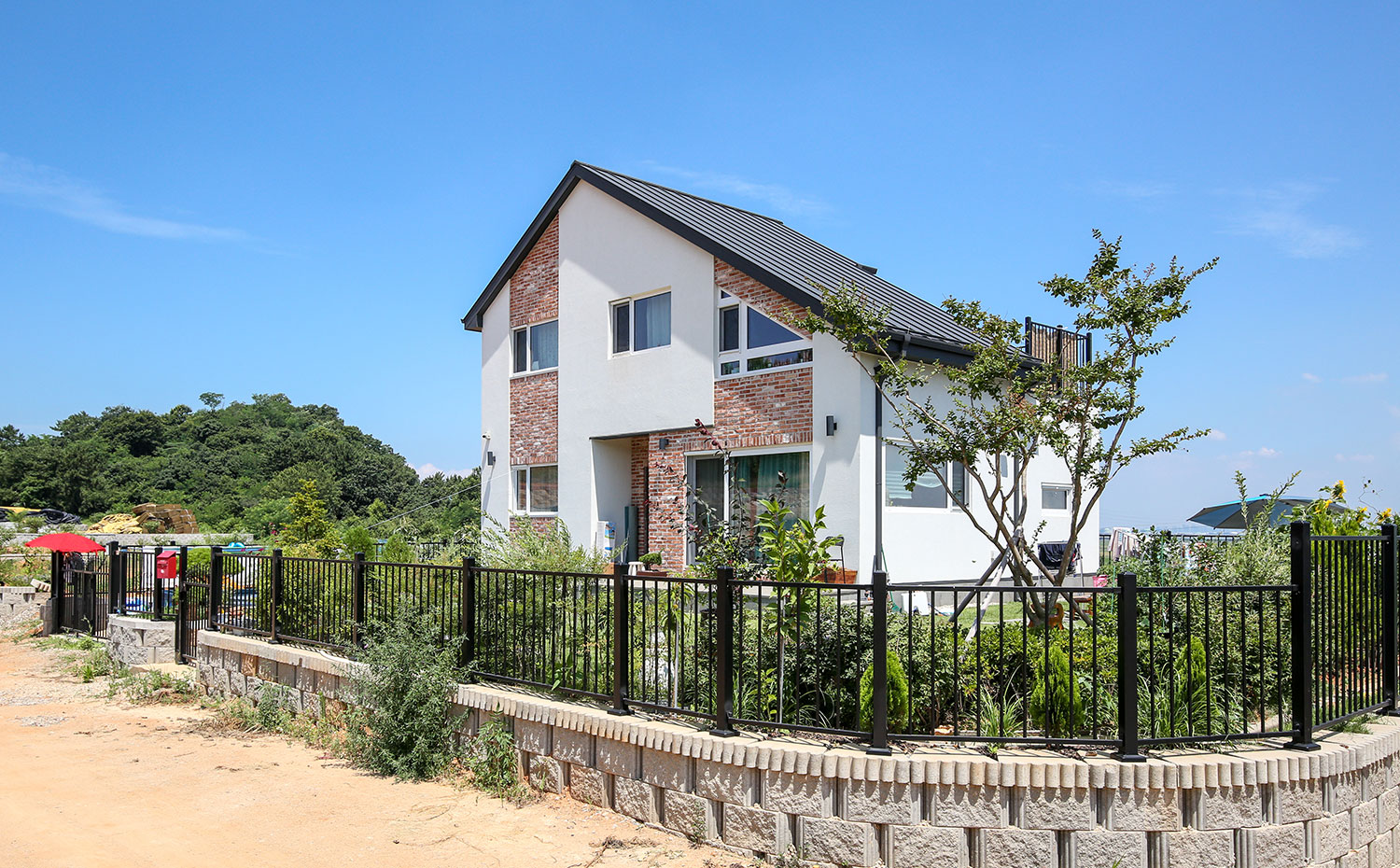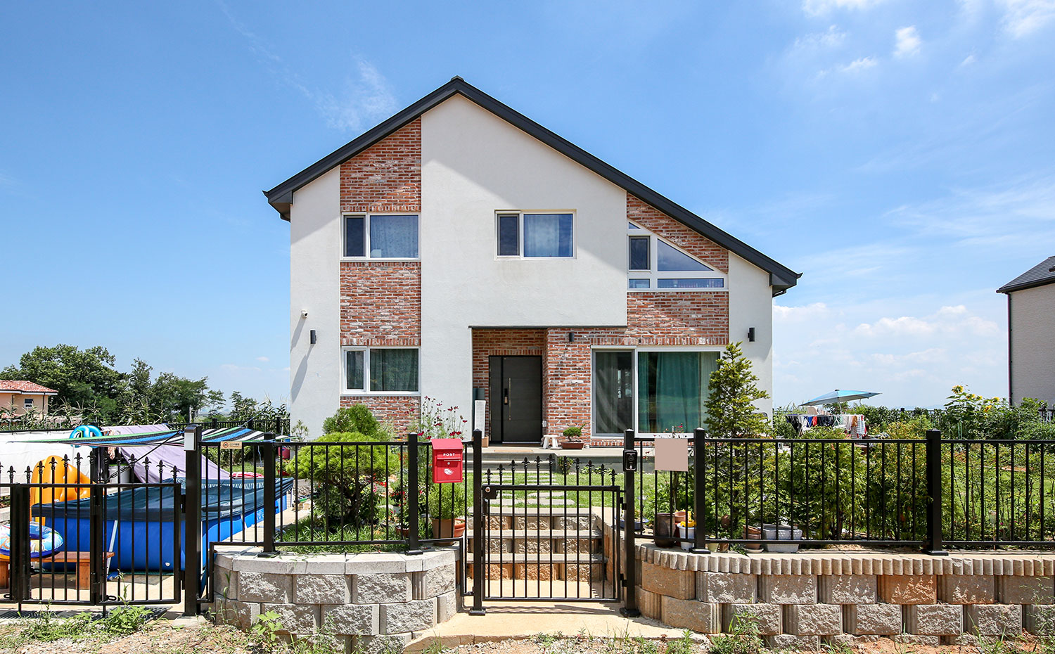눈에 띄는 큰 요철 없이 깔끔한 입면 그리고 밝고 경쾌한 색감의 외장재를 입힌 주택은 어린 자녀를 둔 4인 가족이 거주할 보금자리이다. 화이트 컬러의 스타코플렉스에 빨간 파벽돌로 포인트를 살린 정면부는 심플하지만 단순하지만은 않은 요소들이 눈을 즐겁게 한다. 30평대이지만 부부와 아이를 위한 공간을 알차게 담아낸 주택은 거실 층고를 높이지 않는 대신 거실 상부에 다락을 두어 아이의 놀이공간으로 사용할 수 있게끔 하였고, 2층 침실은 아치형 문을 두어 두 공간을 자유롭게 사용할 수 있는 아이디어를 더하였다. 남향을 바라보는 좋은 향에 지어진 주택인 만큼 어디서든 집 안 곳곳 빛이 들어와 밝은 햇살이 비추는 주택은 가족들과 이 집을 방문하는 이들에게 편안하고 안정적인 느낌을 선사한다.