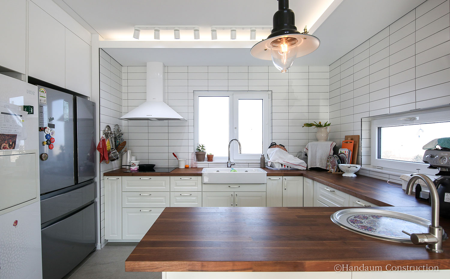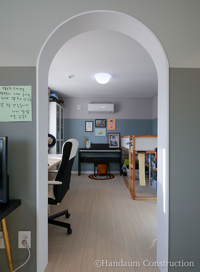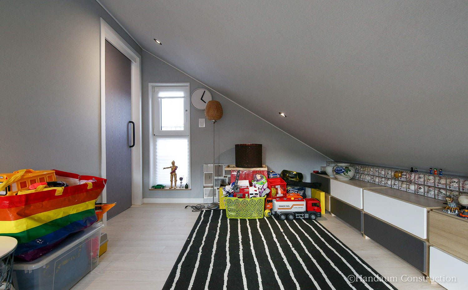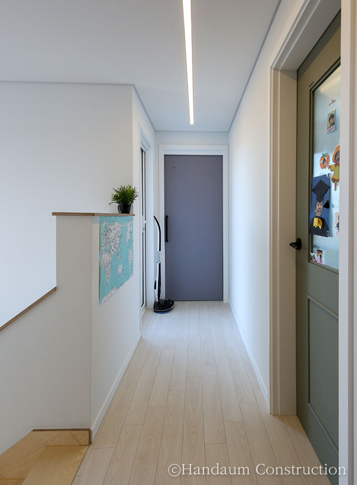 눈에 띄는 큰 요철 없이 깔끔한 입면 그리고 밝고 경쾌한 색감의 외장재를 입힌 주택은 어린 자녀를 둔 4인 가족이 거주할 보금자리이다. 화이트 컬러의 스타코플렉스에 빨간 파벽돌로 포인트를 살린 정면부는 심플하지만 단순하지만은 않은 요소들이 눈을 즐겁게 한다. 30평대이지만 부부와 아이를 위한 공간을 알차게 담아낸 주택은 거실 층고를 높이지 않는 대신 거실 상부에 다락을 두어 아이의 놀이공간으로 사용할 수 있게끔 하였고, 2층 침실은 아치형 문을 두어 두 공간을 자유롭게 사용할 수 있는 아이디어를 더하였다. 남향을 바라보는 좋은 향에 지어진 주택인 만큼 어디서든 집 안 곳곳 빛이 들어와 밝은 햇살이 비추는 주택은 가족들과 이 집을 방문하는 이들에게 편안하고 안정적인 느낌을 선사한다.