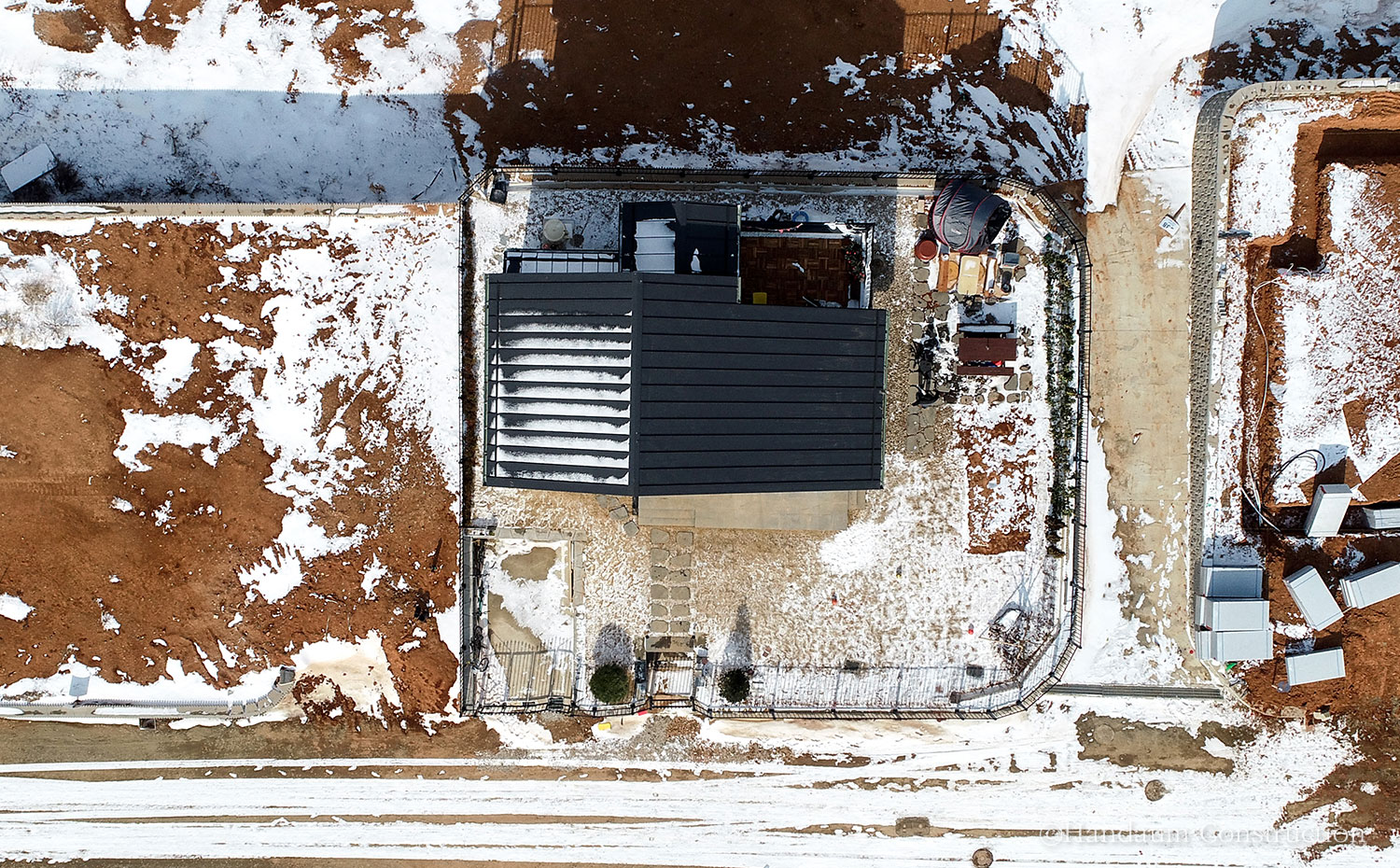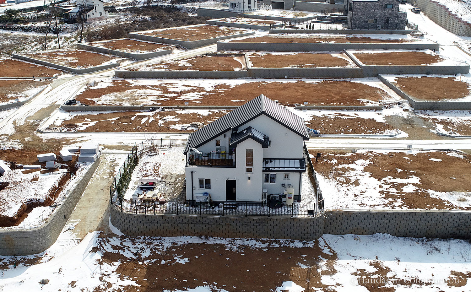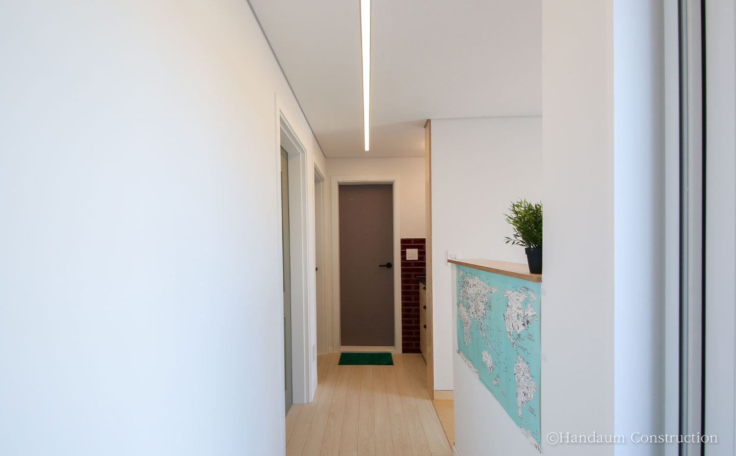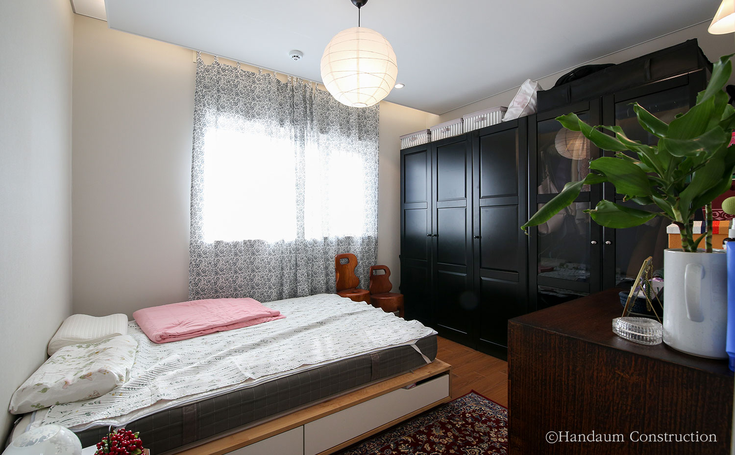 눈에 띄는 큰 요철 없이 깔끔한 입면 그리고 밝고 경쾌한 색감의 외장재를 입힌 주택은 어린 자녀를 둔 4인 가족이 거주할 보금자리이다. 화이트 컬러의 스타코플렉스에 빨간 파벽돌로 포인트를 살린 정면부는 심플하지만 단순하지만은 않은 요소들이 눈을 즐겁게 한다. 30평대이지만 부부와 아이를 위한 공간을 알차게 담아낸 주택은 거실 층고를 높이지 않는 대신 거실 상부에 다락을 두어 아이의 놀이공간으로 사용할 수 있게끔 하였고, 2층 침실은 아치형 문을 두어 두 공간을 자유롭게 사용할 수 있는 아이디어를 더하였다. 남향을 바라보는 좋은 향에 지어진 주택인 만큼 어디서든 집 안 곳곳 빛이 들어와 밝은 햇살이 비추는 주택은 가족들과 이 집을 방문하는 이들에게 편안하고 안정적인 느낌을 선사한다.