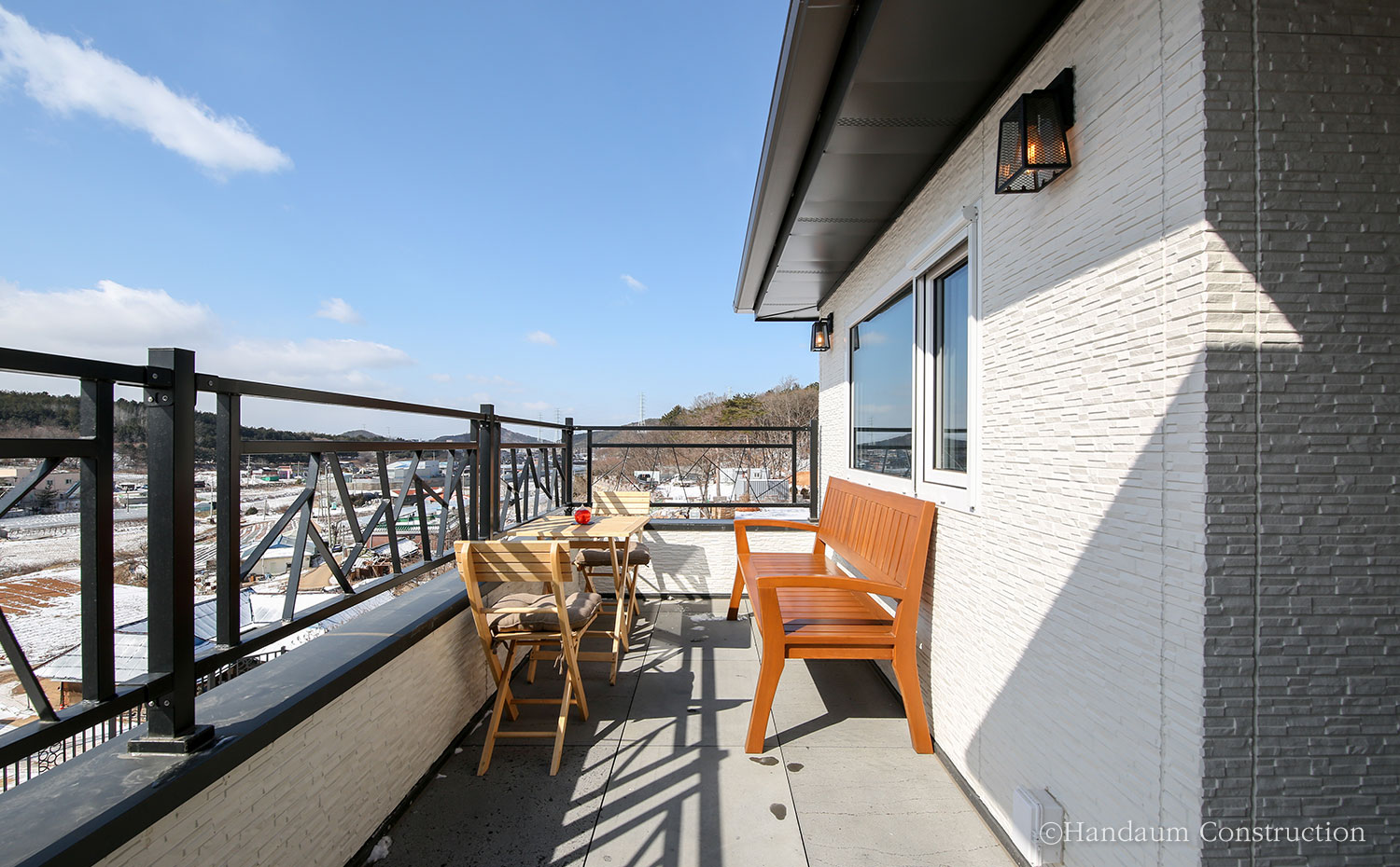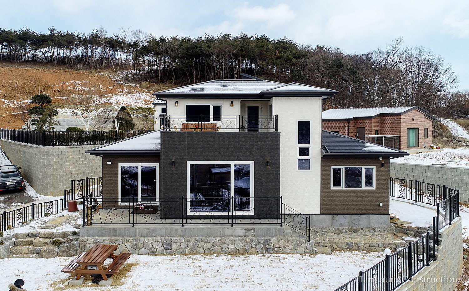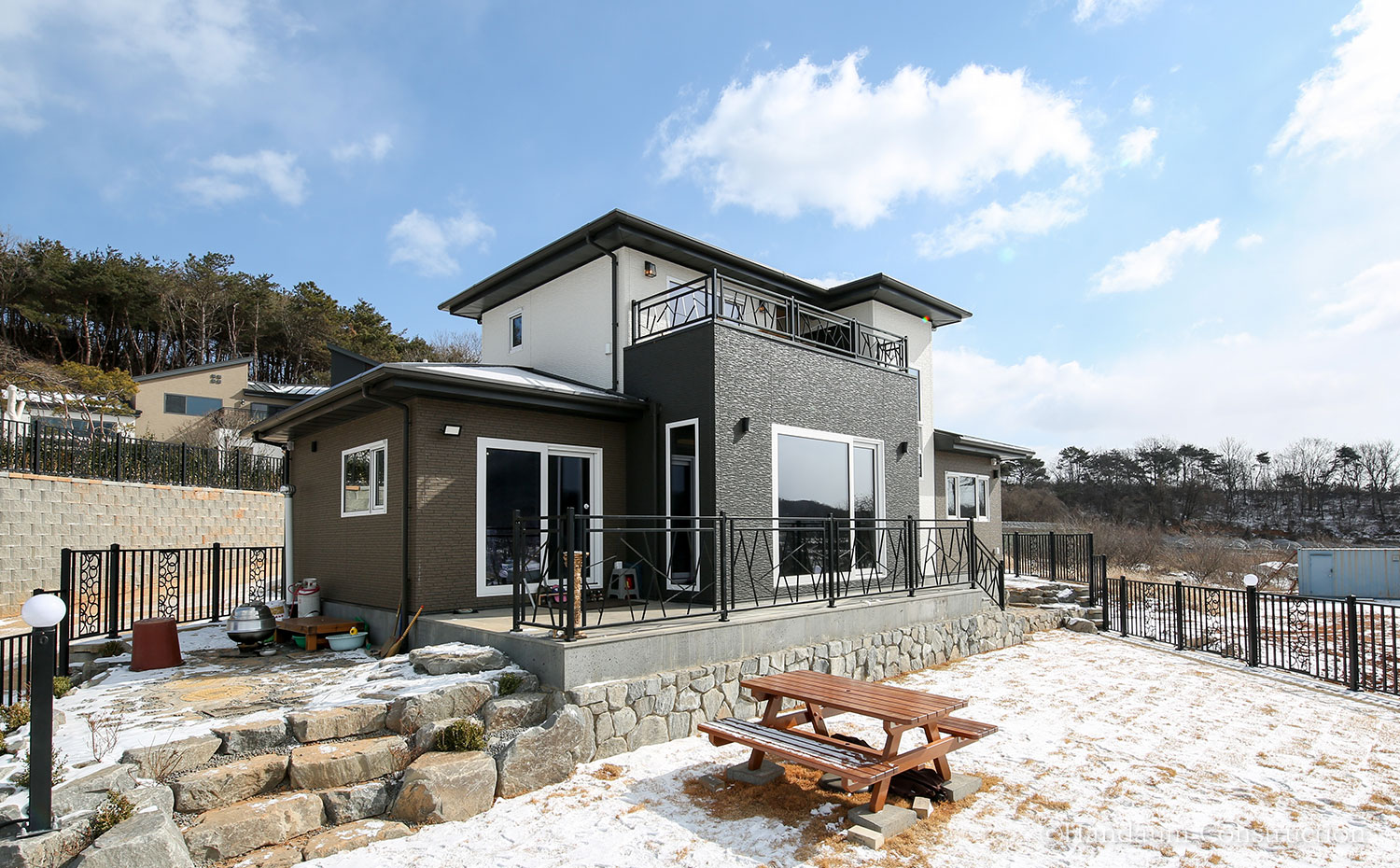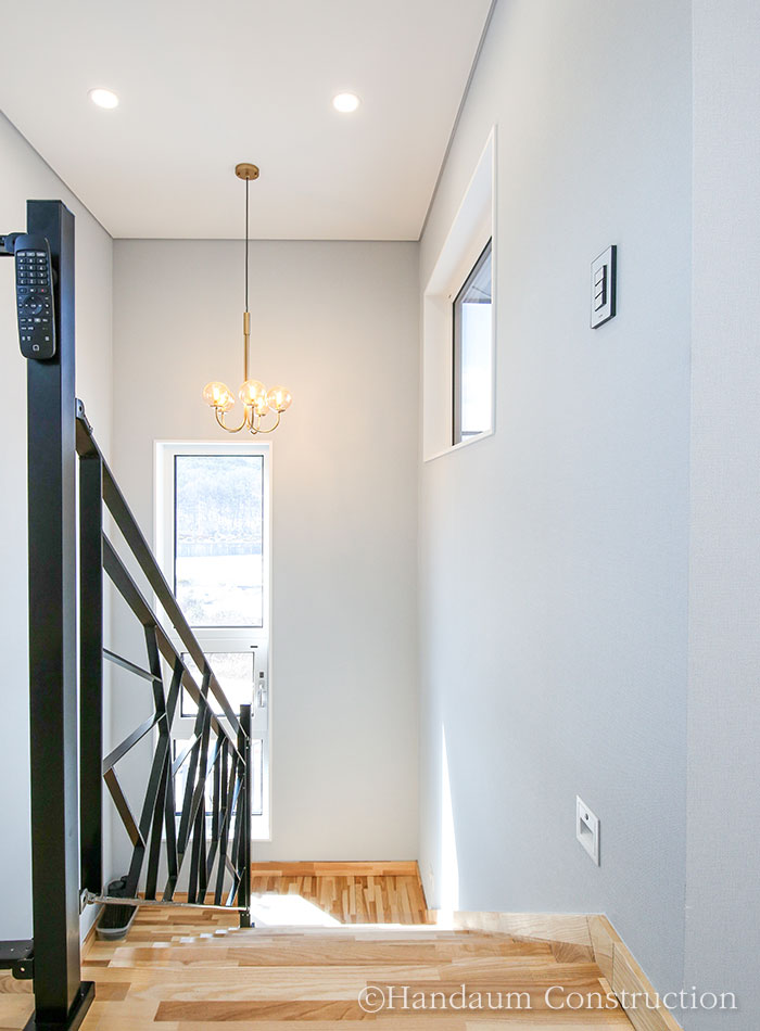 경기 안산에 완공된 WH-117 주택은 균형감있는 외부 디자인과 사계절의 다른 풍경을 담아내는 조망을 즐기기 좋은 알찬 공간을 담아낸 집이다. 남서 방향을 바라보는 대지는 진입로를 고려해 과감히 현관을 후면부에 배치하고 거실과 주방 파티오 도어를 통해 외부 공간으로의 연속성을 가질 수 있도록 하였으며, 거주자의 라이프스타일에 맞도록 거실을 층고를 오픈하지 않는 대신 2층의 가족실을 두어 공간의 활용도를 높였다. 주택 앞으로 펼쳐지는 산등성이와 하늘 그리고 따스한 햇살과 바람이 스미는 집은 넓은 들판의 매력처럼 고즈넉한 여유가 깃들어 있다.