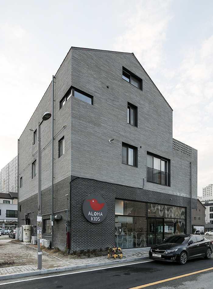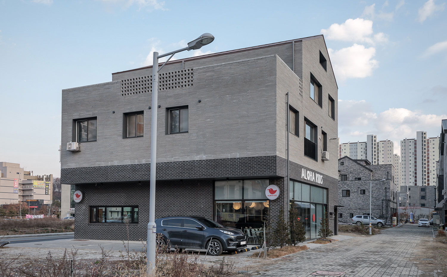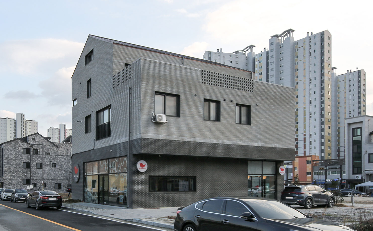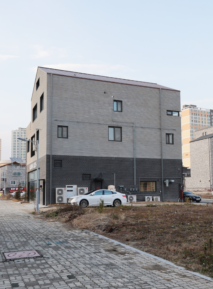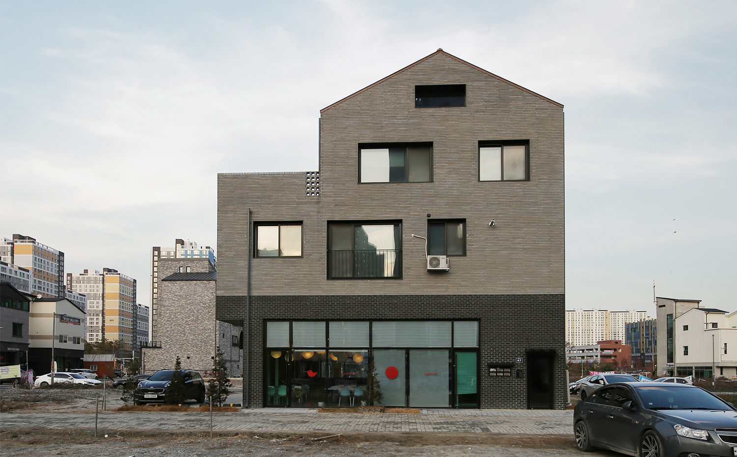 차분한 색채와 특유의 무게감이 멋스러운 마감재의 조화로 미니멀한 멋을 연출한 상가주택은 1층 근린생활시설과 두 가구의 임대세대 그리고 옥상정원, 다락을 연계한 주거공간으로 채워졌다. 박스 형태의 매스에 불필요한 디자인적 요소를 최소화시켰으며, 3층 주거공간의 지붕을 박공형태로 디자인하여 안정감을 더해주었다. 1층 근린생활시설은 전면과 후면부에 벽을 유리로 설계해 개방감을 느낄 수 있으며, 3층 옥상 정원의 일부 벽은 자연스럽게 빛이 투과될 수 있는 큐블록을 사용해 내부에서는 프라이버시를 보호하면서 답답함을 덜어내고 외부에서 보았을 때는 독특한 디자인 포인트가 될 수 있도록 하였다.