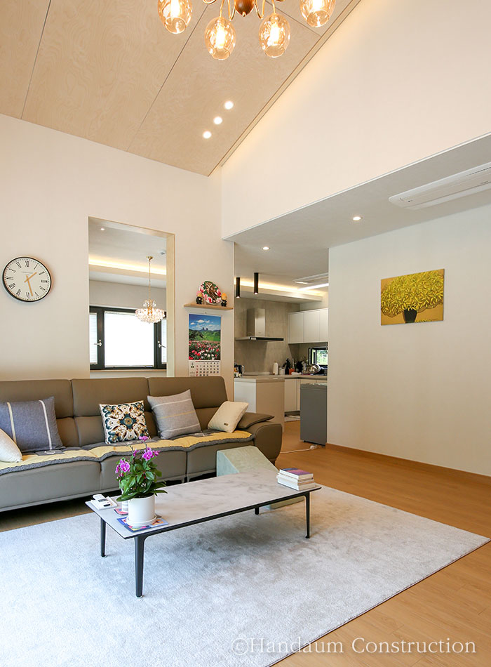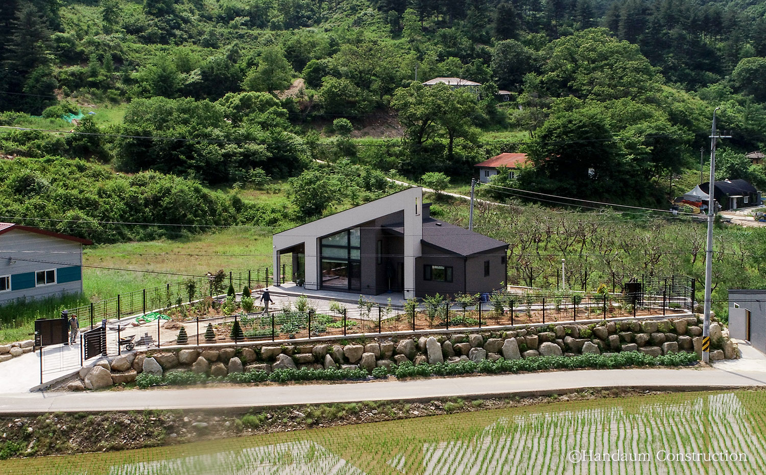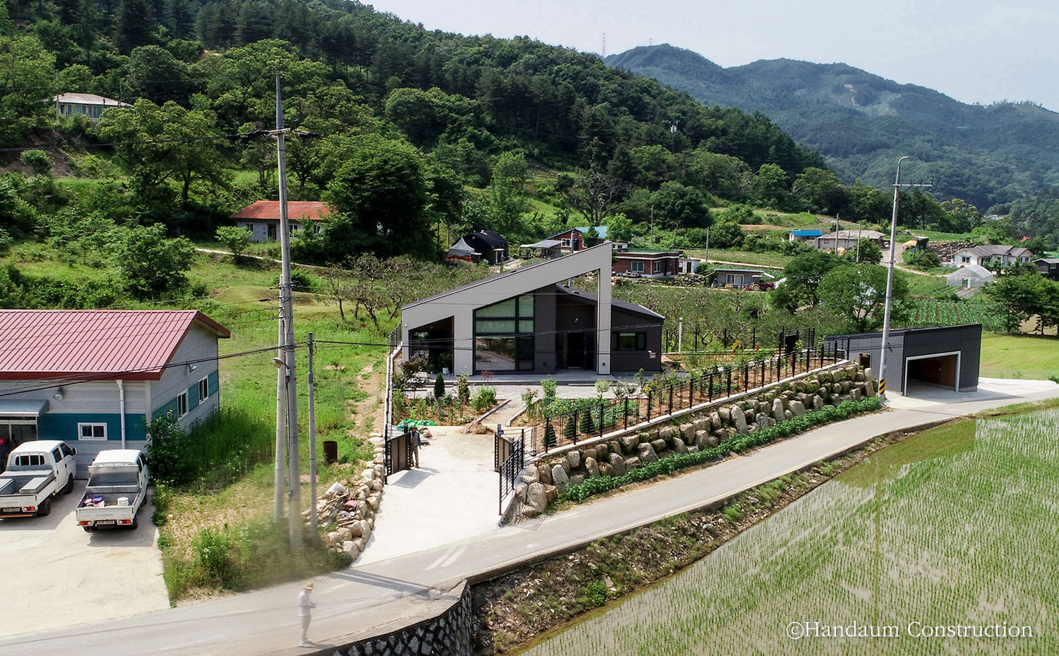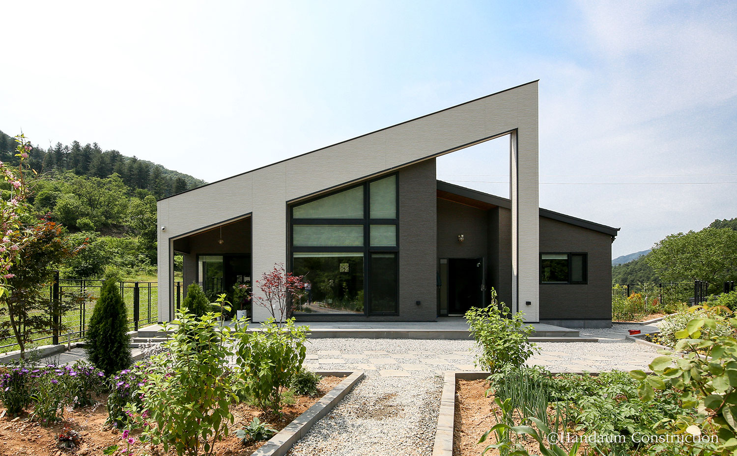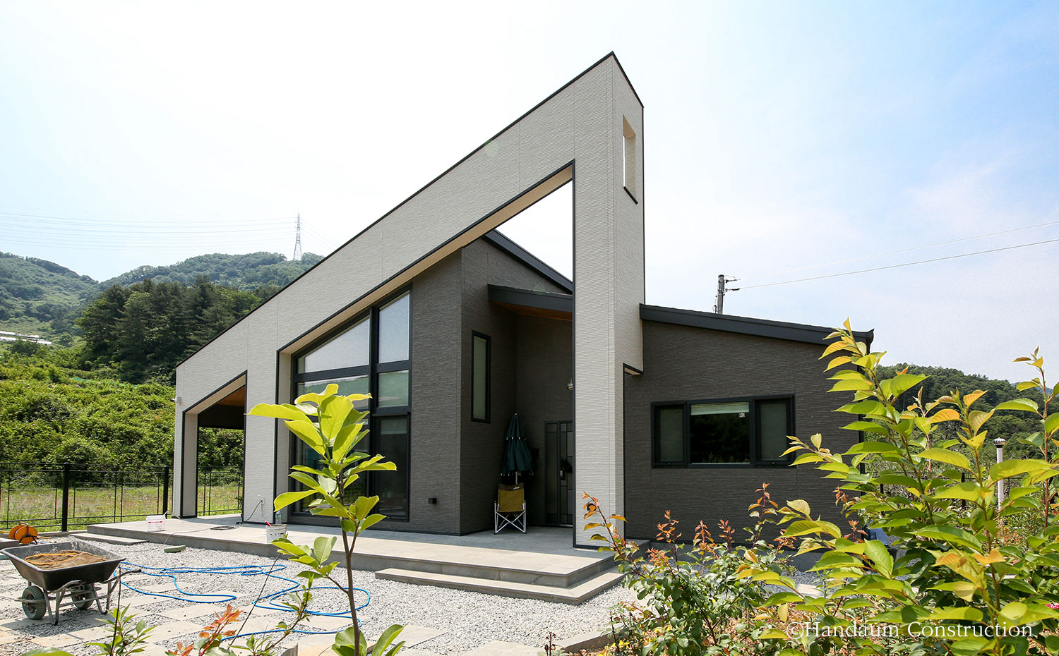 고즈넉한 홍천의 한 마을, 눈길을 사로잡는 주택 하나가 들어섰다. 주말 주택이자 친인척들과 함께 즐거운 추억을 나눌 수 있는 집을 짓고자 한 건축주께서는 크지 않더라도 예쁜 디자인의 주택이 지어지길 바라셨다. 그렇게 건축주의 바람을 담아 완성된 주택은 인근 어디에서도 볼 수 없는 독특한 디자인과 아늑한 공간을 담고 있다. 단층이지만 주택의 정면부에 가벽을 세워 독특한 디자인을 표현한 주택은 사선 지붕이 교차하며 생기는 여백을 통해 시시각각 달라지는 하늘의 풍경을 눈에 담을 수 있는 여유로움도 놓치지 않았다. 또 이 가벽을 따라 층고를 높인 거실은 화이트와 우드 톤의 마감재를 매치하여 따뜻하고 아늑한 공간감을 느낄 수 있다.