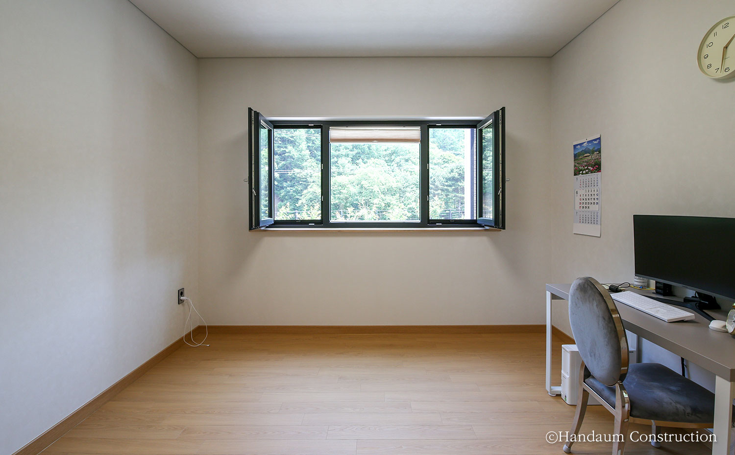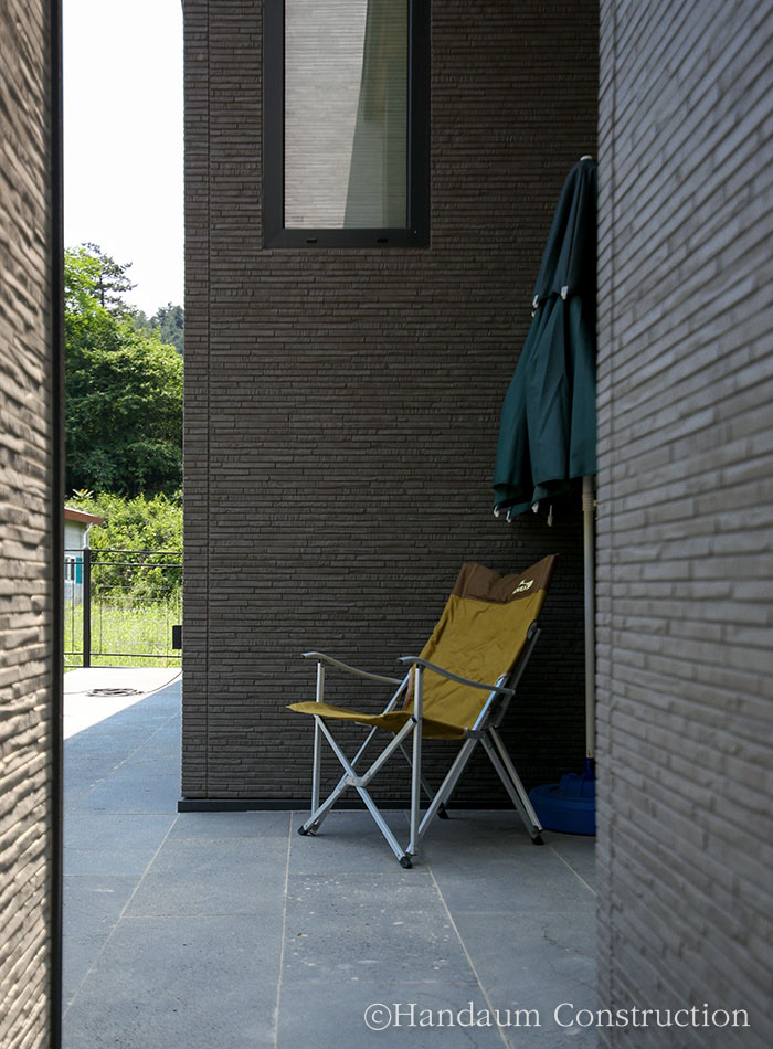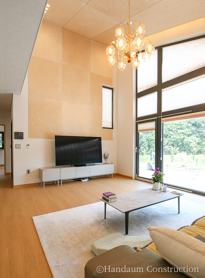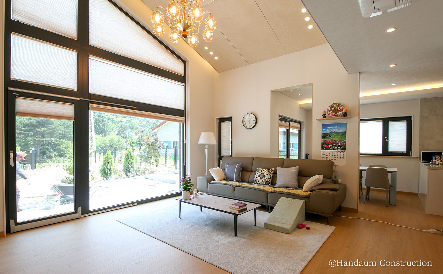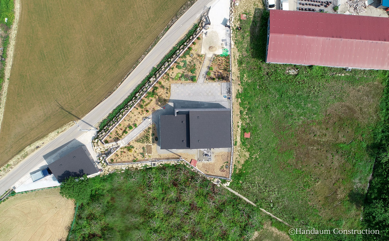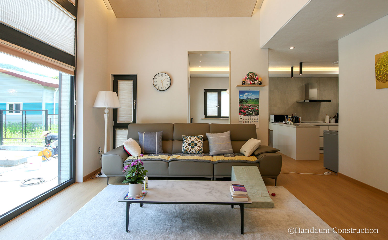 고즈넉한 홍천의 한 마을, 눈길을 사로잡는 주택 하나가 들어섰다. 주말 주택이자 친인척들과 함께 즐거운 추억을 나눌 수 있는 집을 짓고자 한 건축주께서는 크지 않더라도 예쁜 디자인의 주택이 지어지길 바라셨다. 그렇게 건축주의 바람을 담아 완성된 주택은 인근 어디에서도 볼 수 없는 독특한 디자인과 아늑한 공간을 담고 있다. 단층이지만 주택의 정면부에 가벽을 세워 독특한 디자인을 표현한 주택은 사선 지붕이 교차하며 생기는 여백을 통해 시시각각 달라지는 하늘의 풍경을 눈에 담을 수 있는 여유로움도 놓치지 않았다. 또 이 가벽을 따라 층고를 높인 거실은 화이트와 우드 톤의 마감재를 매치하여 따뜻하고 아늑한 공간감을 느낄 수 있다.