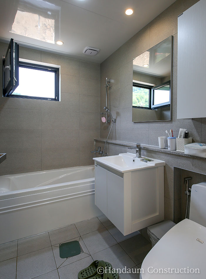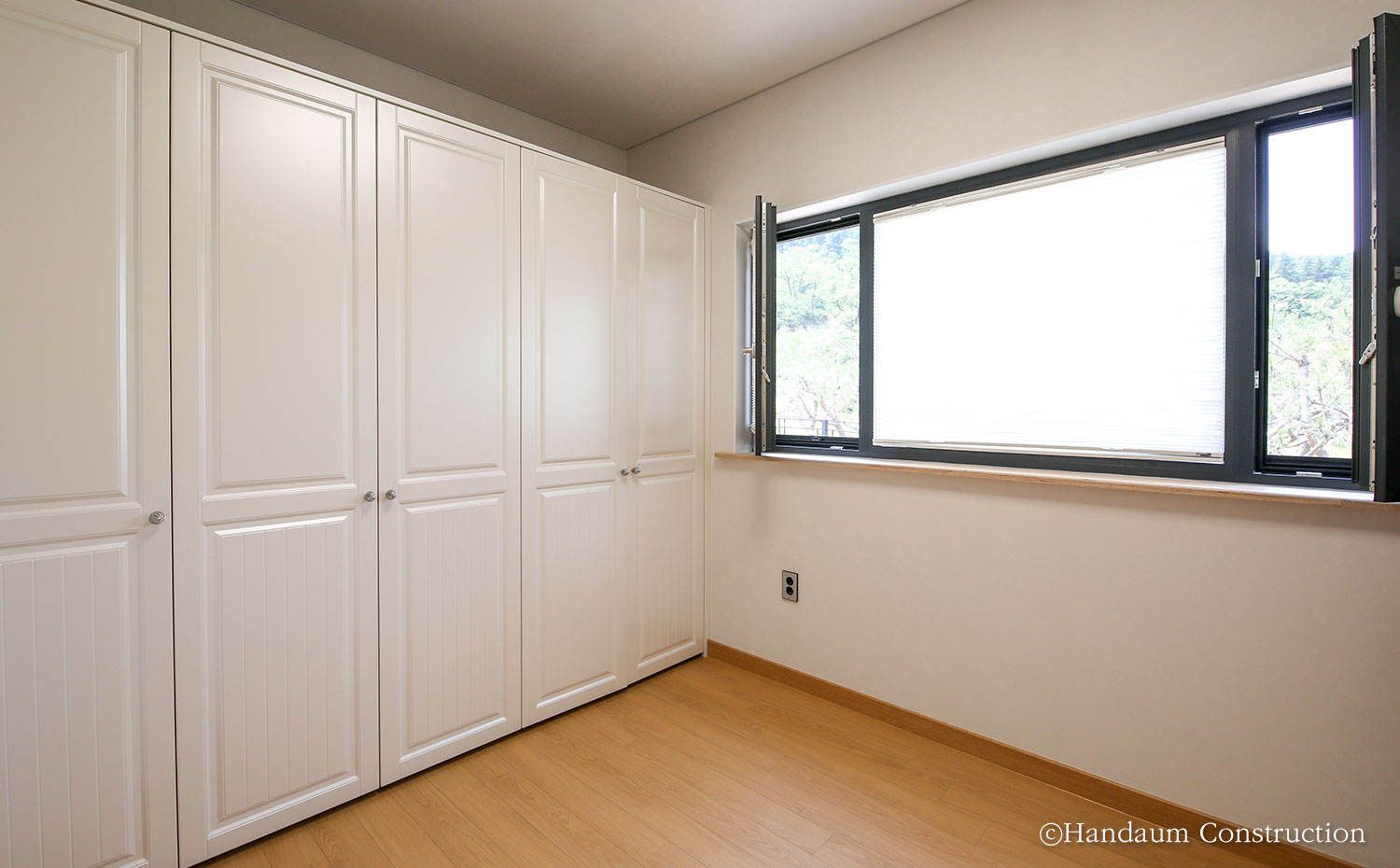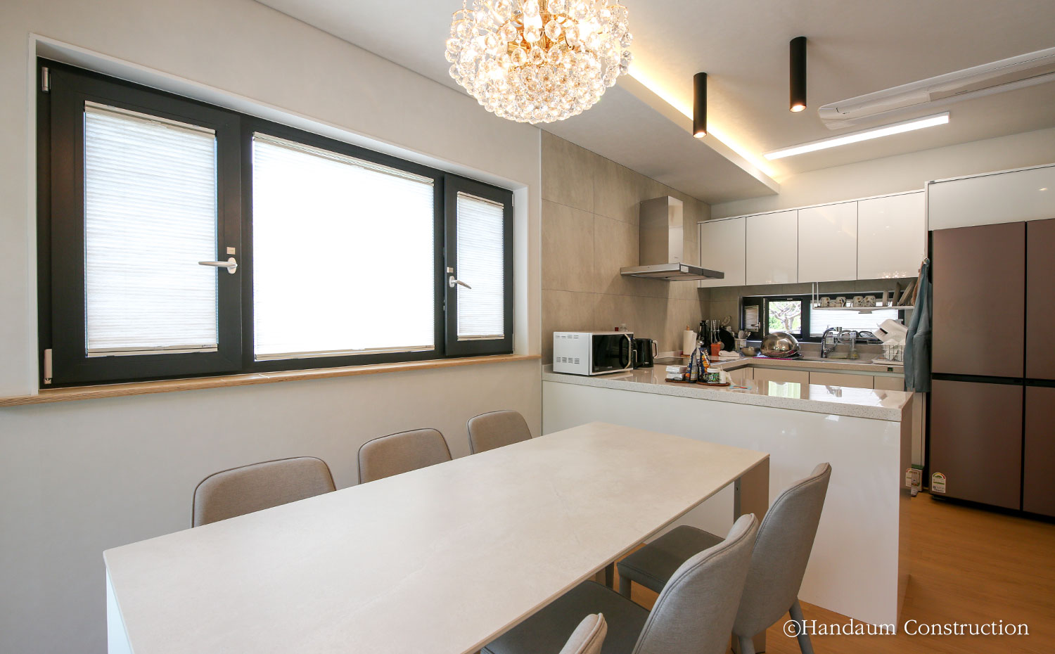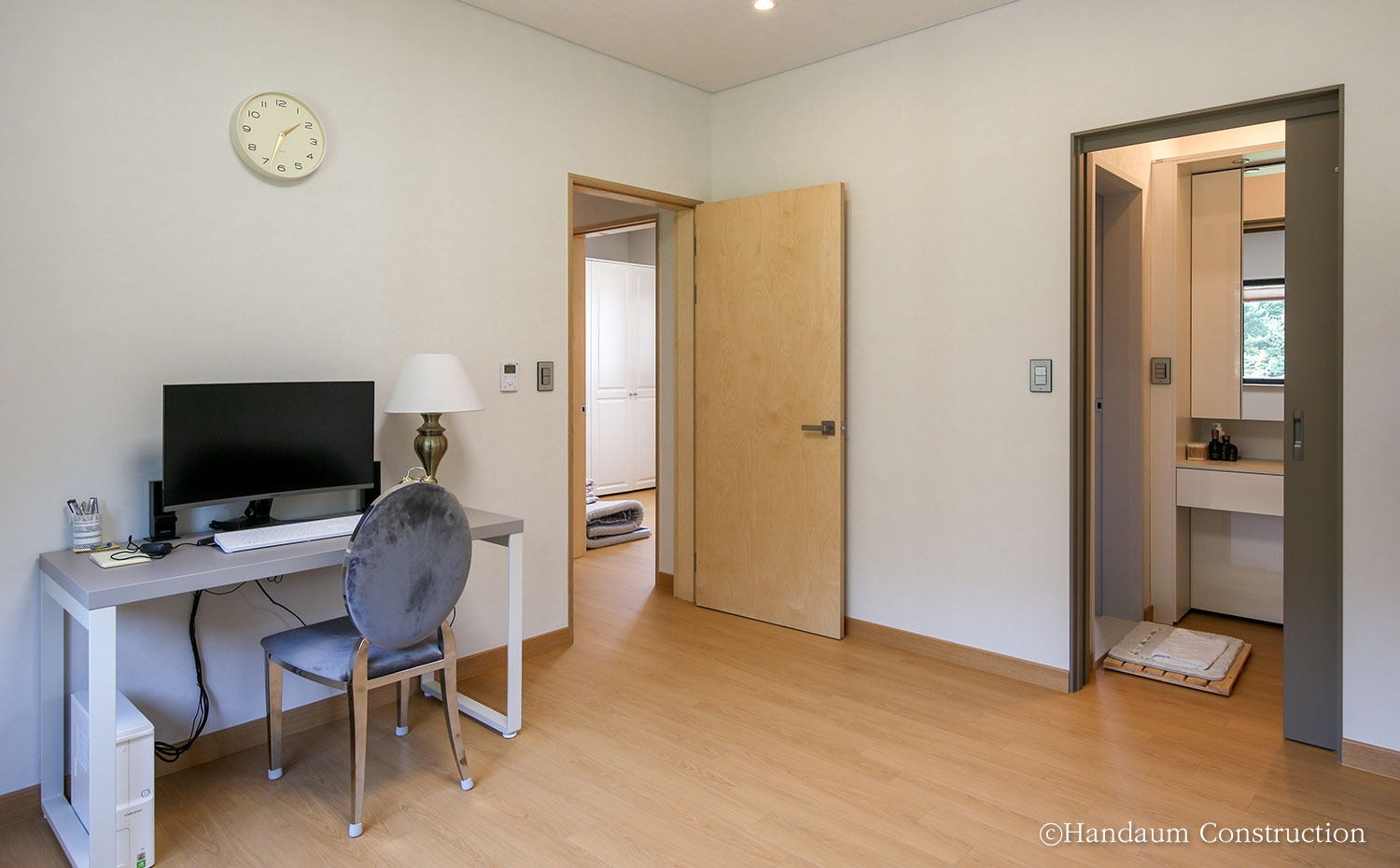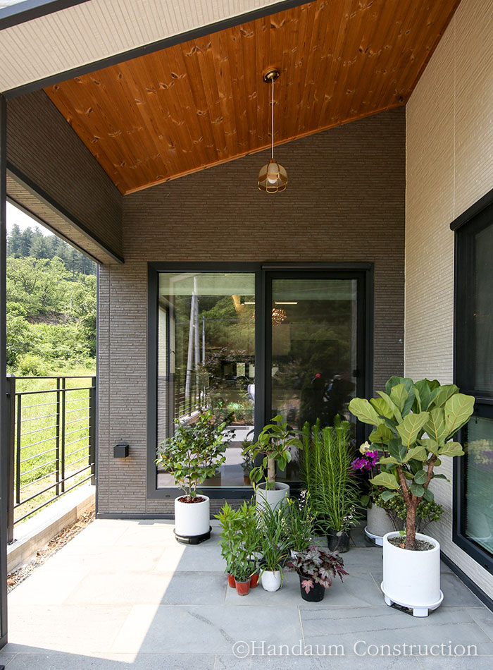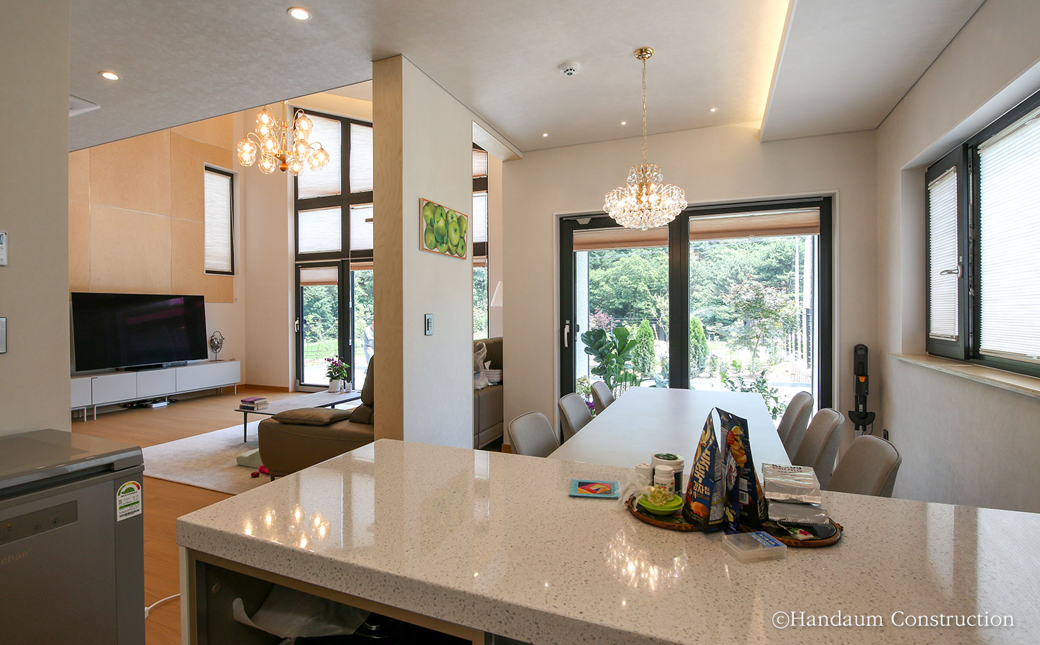 고즈넉한 홍천의 한 마을, 눈길을 사로잡는 주택 하나가 들어섰다. 주말 주택이자 친인척들과 함께 즐거운 추억을 나눌 수 있는 집을 짓고자 한 건축주께서는 크지 않더라도 예쁜 디자인의 주택이 지어지길 바라셨다. 그렇게 건축주의 바람을 담아 완성된 주택은 인근 어디에서도 볼 수 없는 독특한 디자인과 아늑한 공간을 담고 있다. 단층이지만 주택의 정면부에 가벽을 세워 독특한 디자인을 표현한 주택은 사선 지붕이 교차하며 생기는 여백을 통해 시시각각 달라지는 하늘의 풍경을 눈에 담을 수 있는 여유로움도 놓치지 않았다. 또 이 가벽을 따라 층고를 높인 거실은 화이트와 우드 톤의 마감재를 매치하여 따뜻하고 아늑한 공간감을 느낄 수 있다.