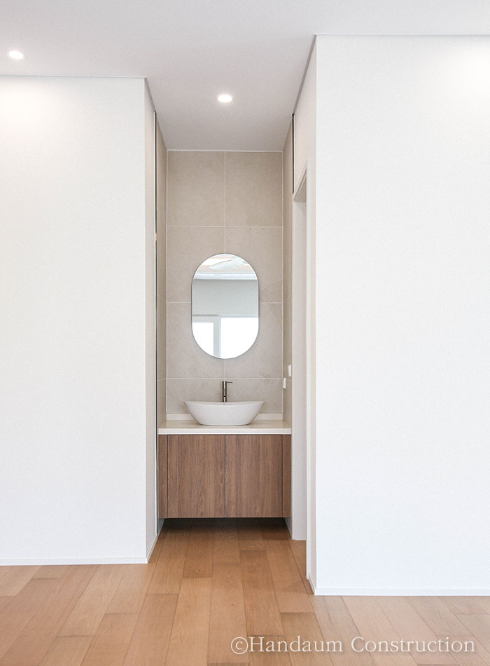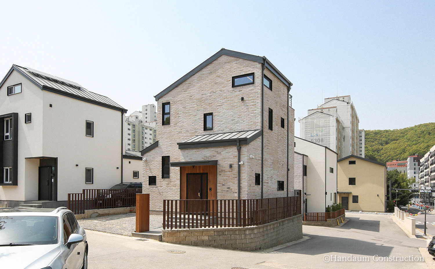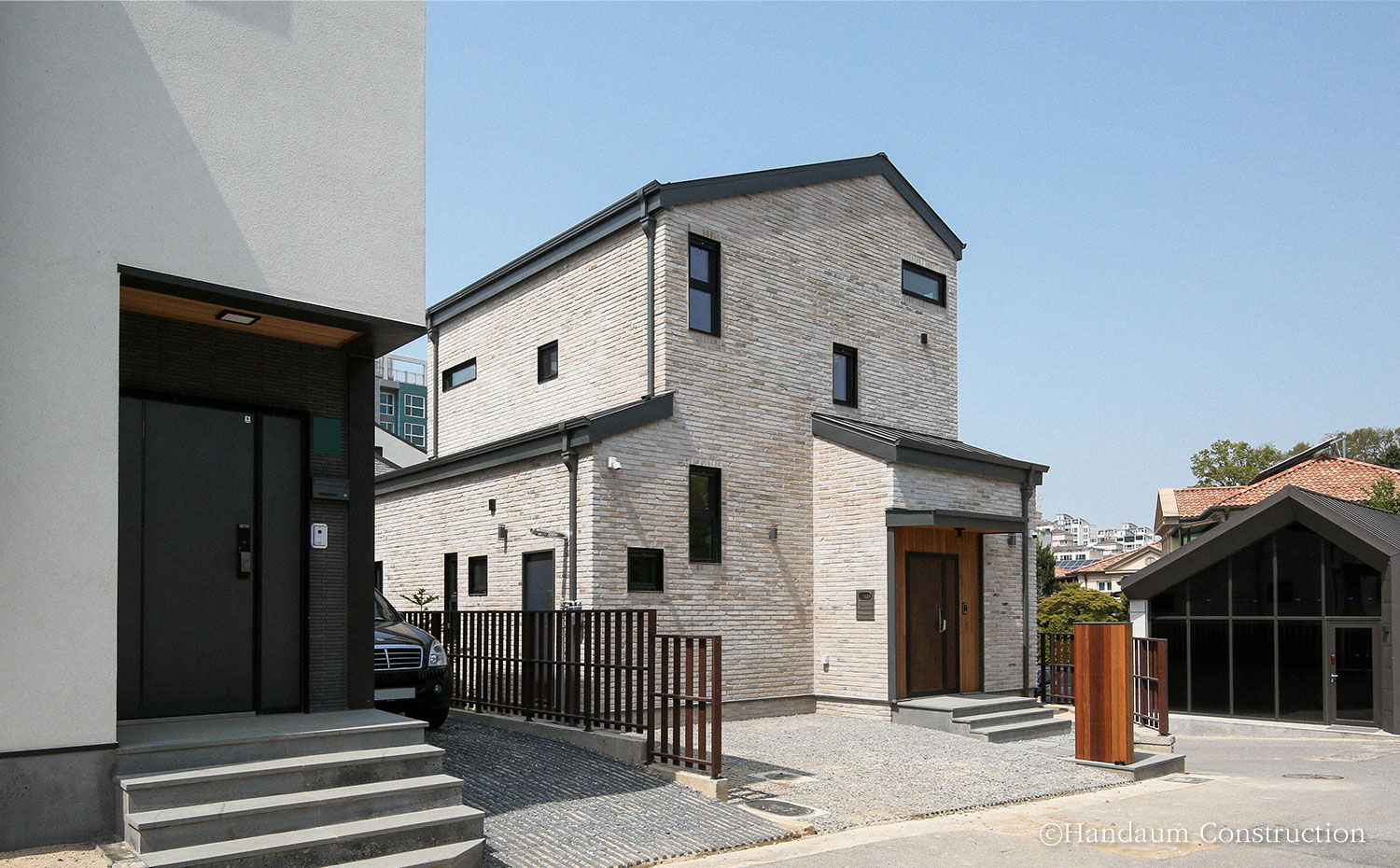 도심의 편의성을 누리며 개인의 취향을 담은 집을 꿈꾸는 사람들이 늘어나며 생겨나는 도심지 단독주택지는 필연적으로 땅의 제약이 생길 수밖에 없다. 이러한 특징을 가진 사례들이 늘어나며 1층에 거실, 침실, 안방이라는 다소 딱딱한 공식이 깨지고 있다. 위와 같은 공간 구성은 일반적인 사람들이 집이라는 구성을 그리며 생각하기 쉬운 형태이지만 대지나 가족 구성원의 니즈에 따라 이 틀 역시 충분히 달라질 수 있다. 약 40평이 조금 넘는 협소한 대지, 단지 내 모서리 땅에 위치한 주택은 가족에게 필요한 최소한의 면적을 적용한 30평대에 맞추되, 공간의 특성이 다른 실들을 층별로 분리하여 땅의 제약을 현실적으로 풀어내었다. 대신 부족한 실의 기능을 보완할 수 있는 다락을 두어 부족한 수납 및 휴식 공간을 마련하였다. 용인 코너(Corner) 집은 주변 주택들 사이 요란하게 자기 색을 드러내기보다는 자연스럽고 조화로운 이미지를 담고자 하였으며, 안정감을 주는 웜톤의 파벽돌을 활용해 심플한 형태를 잘 드러내고 있다.