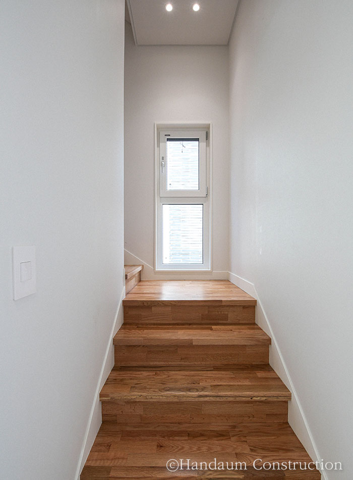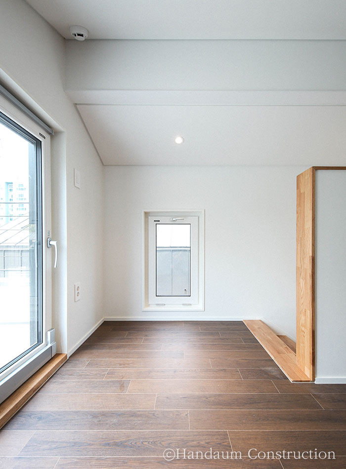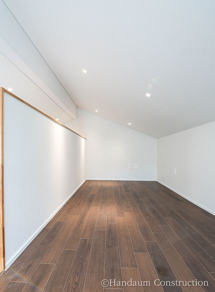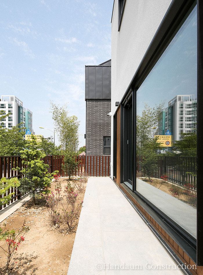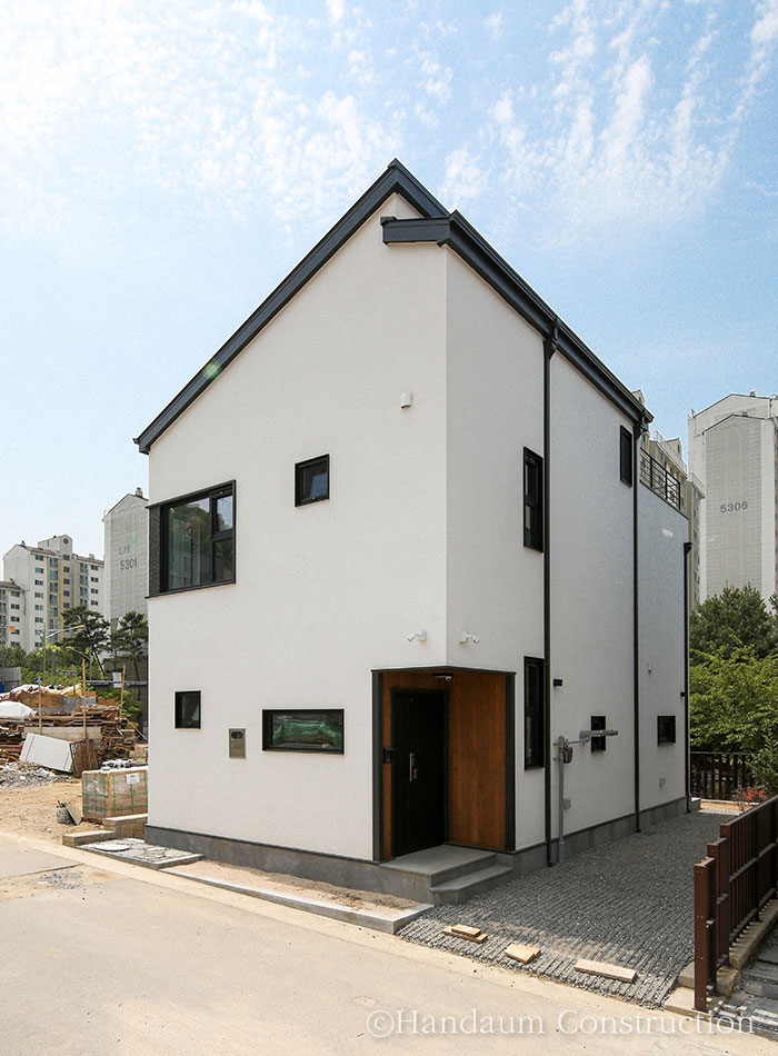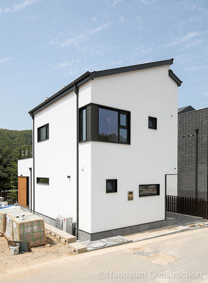 직사각형의 한정된 대지, 화이트 톤의 심플한 파사드가 눈길을 끄는 이 주택은 깔끔하면서 군더더기 없는 디자인을 담고자 한 건축주의 취향을 고스란히 녹여내었다. 대지 내 효율을 최대한으로 끌어올릴 수 있는 직사각형의 형태를 기본으로 현관 포치, 베란다를 잘라내는 느낌으로 입면을 계획한 주택은 다소 밋밋해 보일 수 있는 백색 사각 건물에 포인트를 살릴 수 있도록 창호 코너부위의 블랙 세라믹사이딩 그리고 현관 포치부의 적삼목으로 내추럴한 분위기를 강조하였다. 또 장식적 요소를 최대한 배제하고 데드스페이스 없는 공간 활용을 꾀한 내부는 공간마다 각각의 쓰임과 용도에 충실하되, 하나의 동선으로 무리 없이 연결되도록 했다.