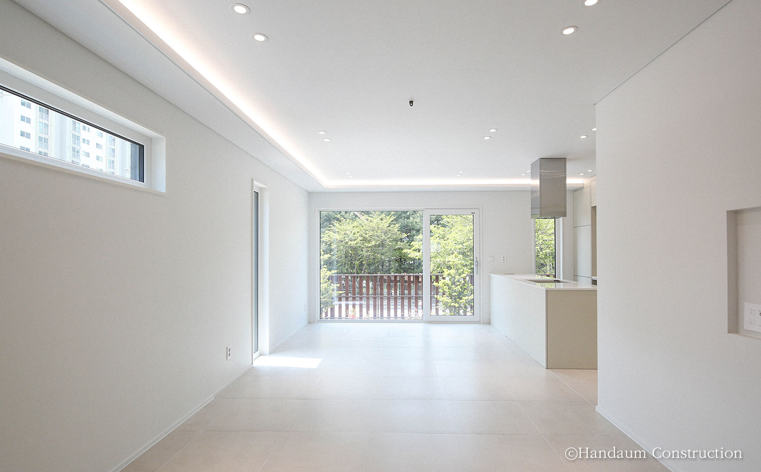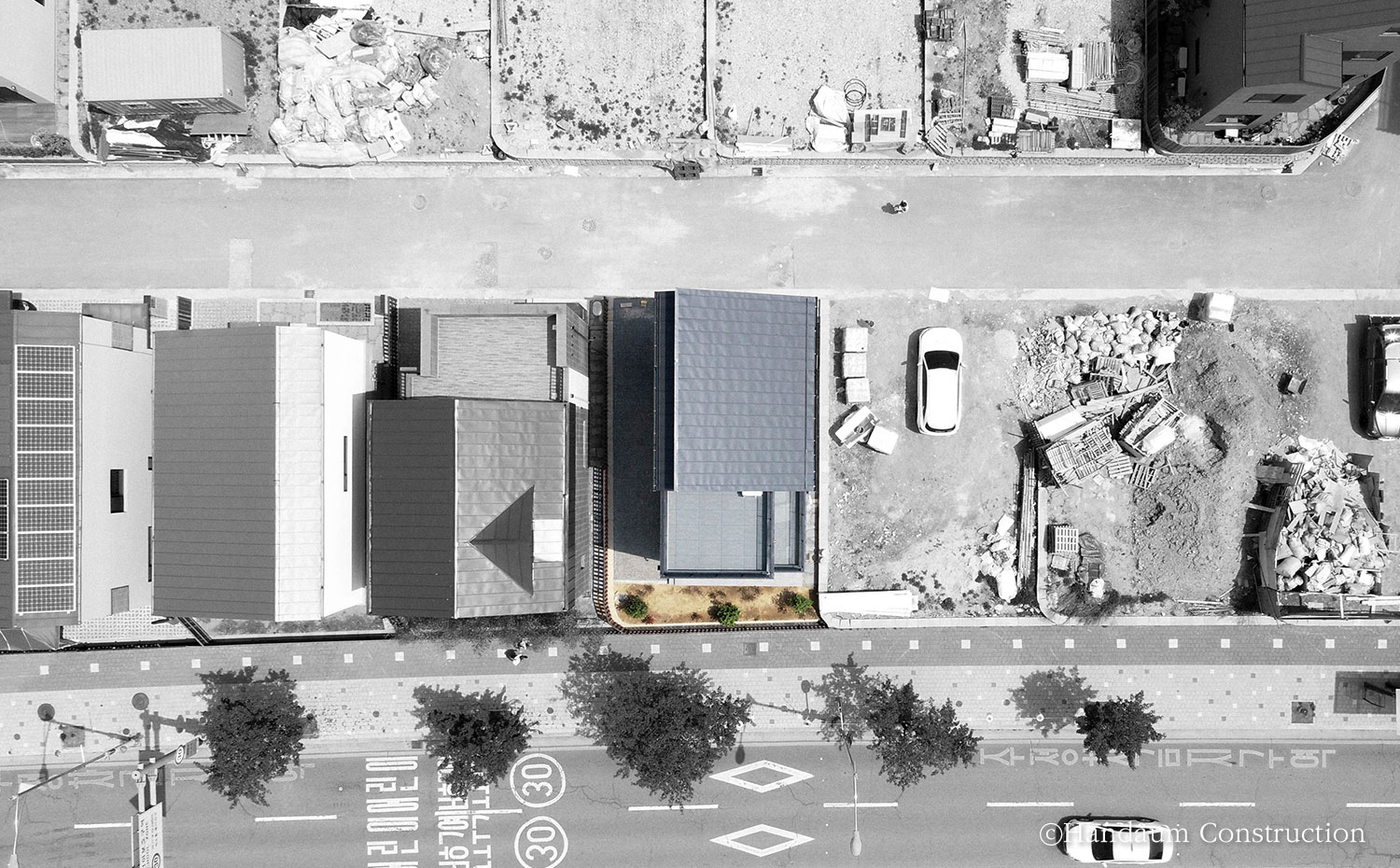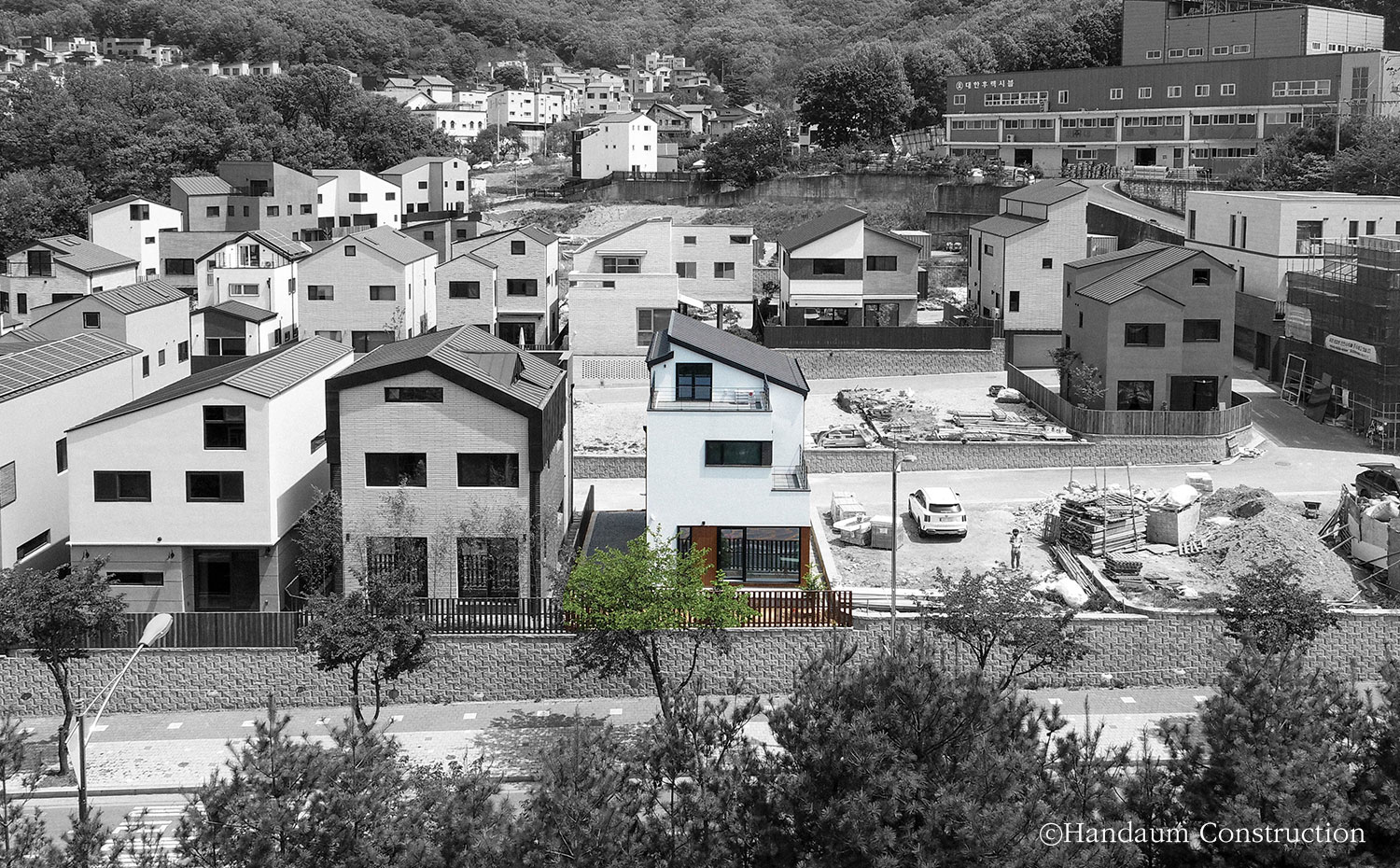 직사각형의 한정된 대지, 화이트 톤의 심플한 파사드가 눈길을 끄는 이 주택은 깔끔하면서 군더더기 없는 디자인을 담고자 한 건축주의 취향을 고스란히 녹여내었다. 대지 내 효율을 최대한으로 끌어올릴 수 있는 직사각형의 형태를 기본으로 현관 포치, 베란다를 잘라내는 느낌으로 입면을 계획한 주택은 다소 밋밋해 보일 수 있는 백색 사각 건물에 포인트를 살릴 수 있도록 창호 코너부위의 블랙 세라믹사이딩 그리고 현관 포치부의 적삼목으로 내추럴한 분위기를 강조하였다. 또 장식적 요소를 최대한 배제하고 데드스페이스 없는 공간 활용을 꾀한 내부는 공간마다 각각의 쓰임과 용도에 충실하되, 하나의 동선으로 무리 없이 연결되도록 했다.