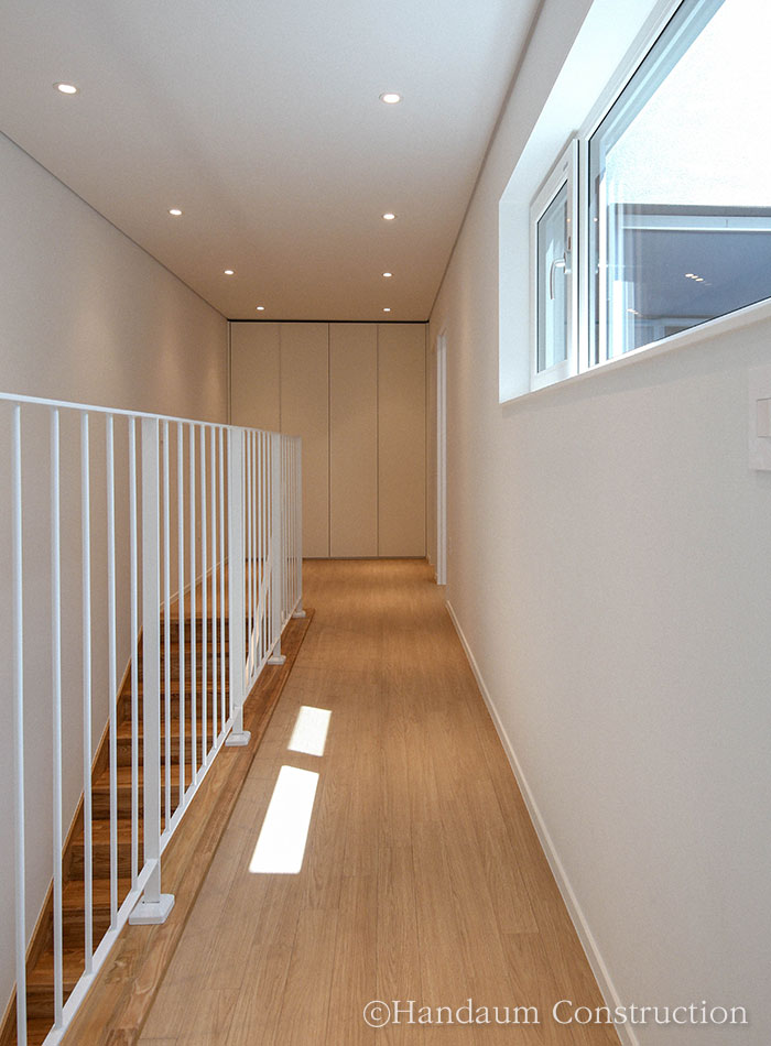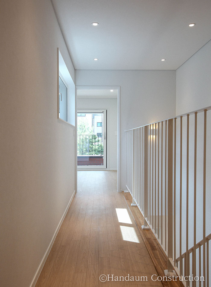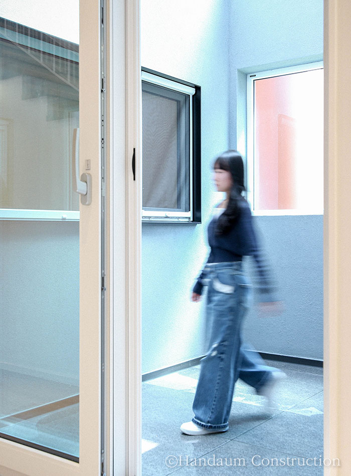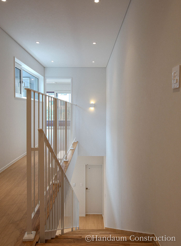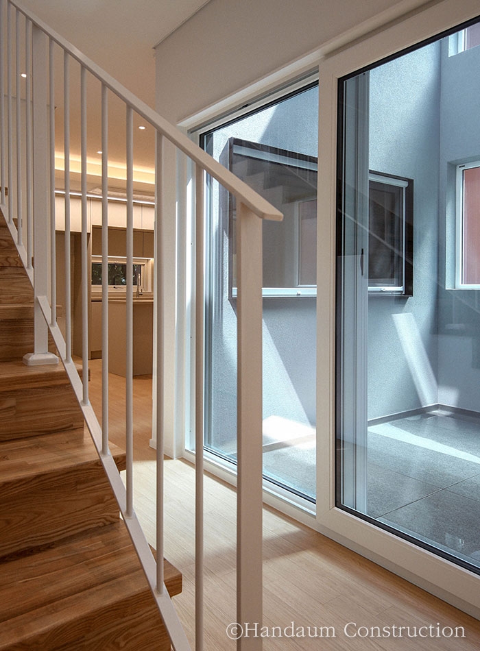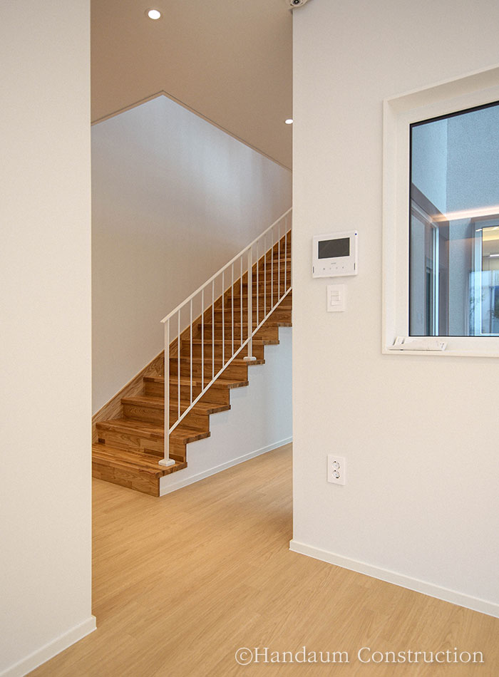 하나의 필지 안에 주거동과 임대동이 나란히 자리한 이번 주택의 임대동은 복층으로 구성된 30평대 목조주택으로 신혼부부나 1~2인 가구를 위한 공간 구성에 초점을 맞추고 있다. 약 100평의 대지 안에 2동의 주택이 자리한 만큼 주거동과 임대동이 가깝게 붙어 있기 때문에 세대별 프라이버시 확보를 위해 임대동의 우측 창에는 미스트 창을 적용하고 1층 거실과 주방 사이 중정을 두어 채광 확보 및 프라이빗한 휴식공간으로 활용할 수 있게끔 하였다.