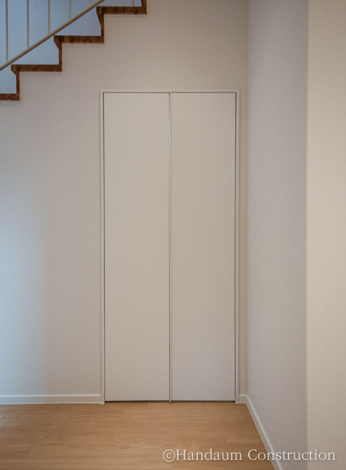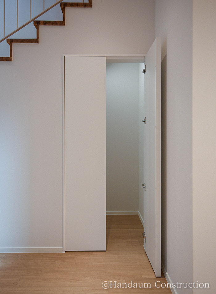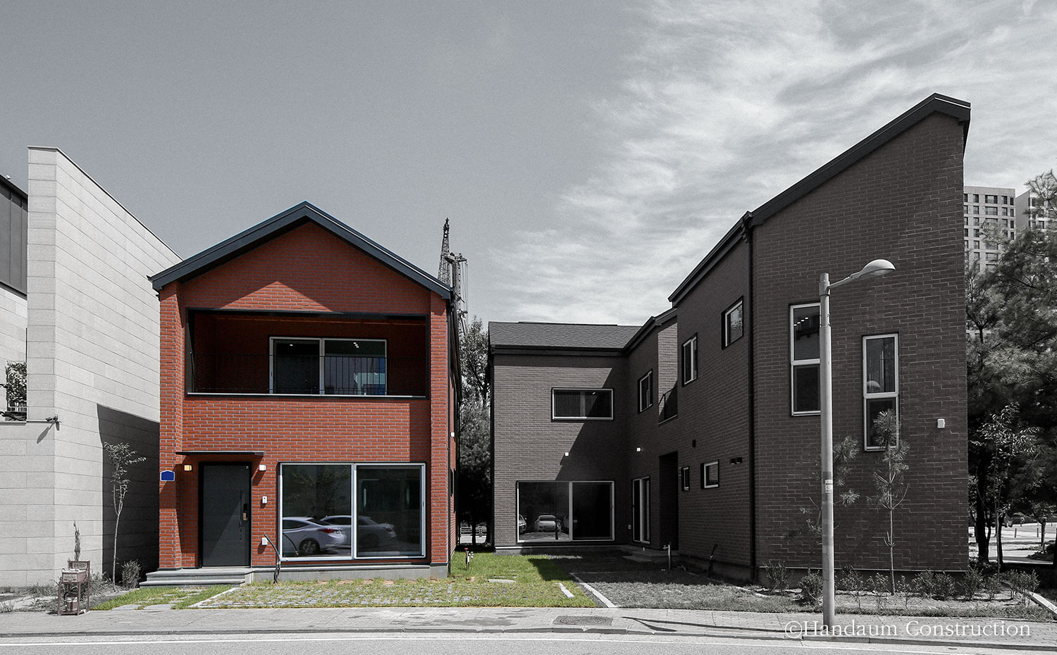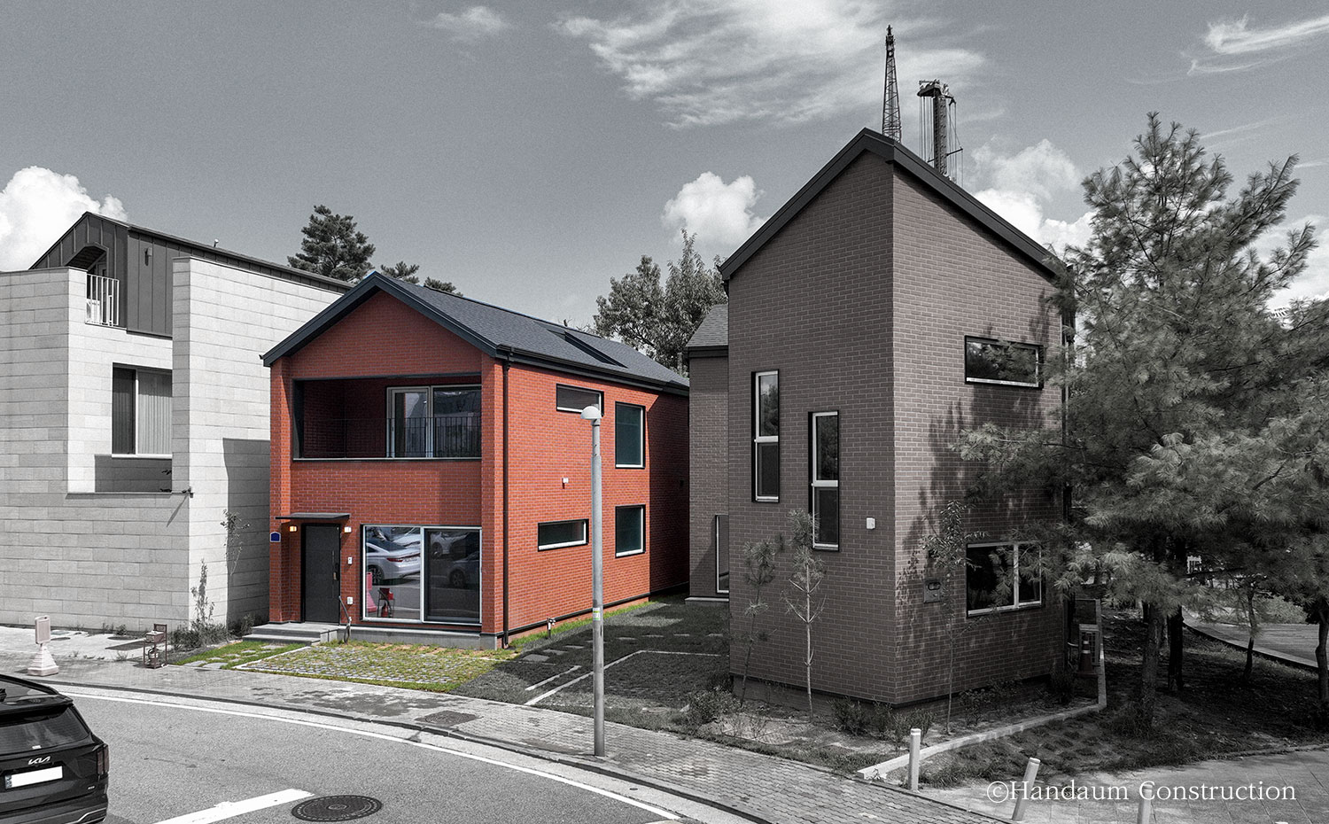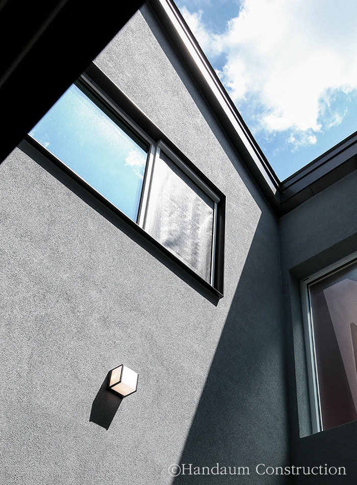 하나의 필지 안에 주거동과 임대동이 나란히 자리한 이번 주택의 임대동은 복층으로 구성된 30평대 목조주택으로 신혼부부나 1~2인 가구를 위한 공간 구성에 초점을 맞추고 있다. 약 100평의 대지 안에 2동의 주택이 자리한 만큼 주거동과 임대동이 가깝게 붙어 있기 때문에 세대별 프라이버시 확보를 위해 임대동의 우측 창에는 미스트 창을 적용하고 1층 거실과 주방 사이 중정을 두어 채광 확보 및 프라이빗한 휴식공간으로 활용할 수 있게끔 하였다.