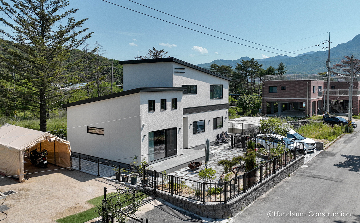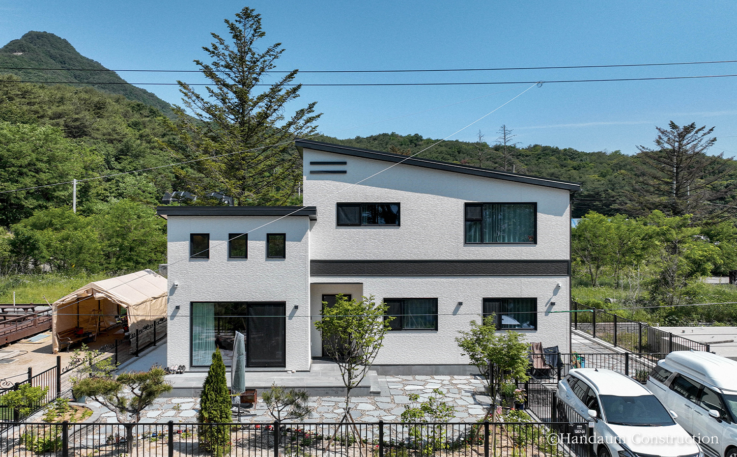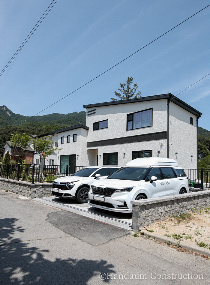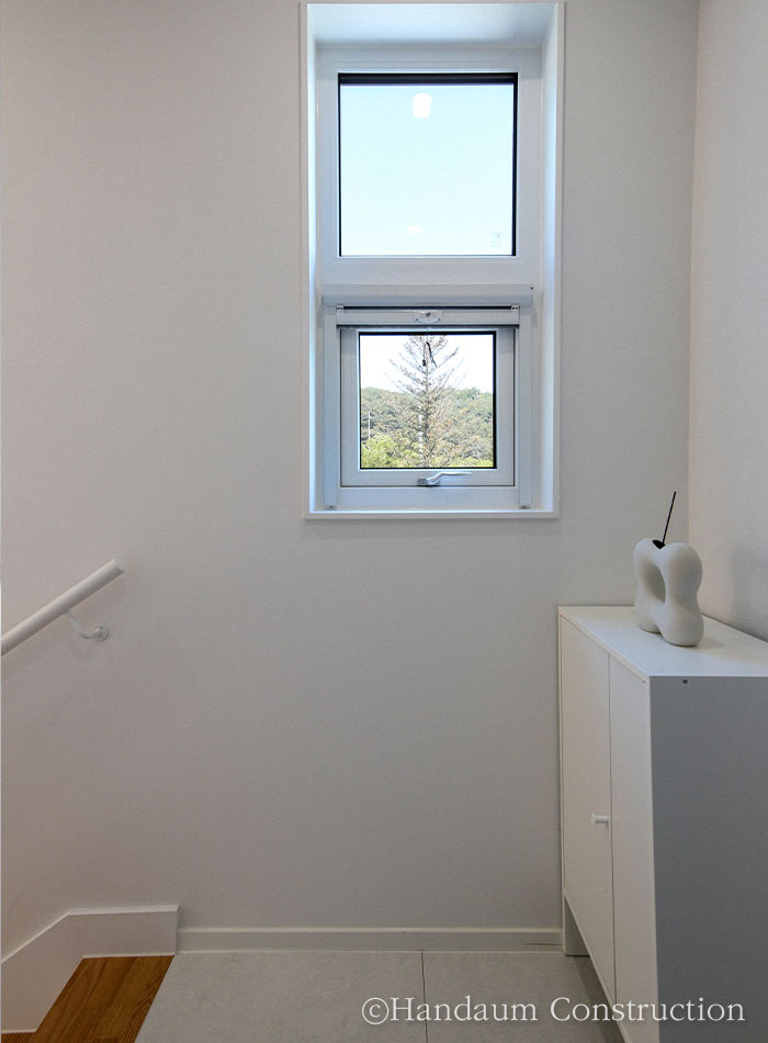 푸른 산세와 새의 예쁜 지저귐이 들려오는 주택가에 자리한 주택은 경량목구조 공법으로 설계된 40평대 주택이다. 심플한 입면이지만 사선지붕과 세라믹사이딩 외장 마감재로 포인트를 더해낸 주택은 자연 풍경과 어우러져 조화를 이뤄낸다. 내부에 빛을 고루 담길 바랐던 건축주 가족들의 바람에 따라 거실에 정면 큰 창과 1.5층 높이로 층고를 오픈하여 윗라인에도 세 개의 창을 계획하여 집 깊은 곳까지 빛이 들어오며 전체적으로 밝은 분위기를 채워넣었다. 거실과 주방을 오픈형으로 계획하여 가족들이 함께 시간을 보낼 수 있도록 공용공간을 계획했고 나머지 실들은 가족 구성원 개인의 취향을 담아 설계되었다. 둥근 아치로 포인트를 아늑함을 담아낸 실과 윈도우시트를 두어 풍경을 오롯이 즐기고자 했던 각자의 바람과 취향을 곳곳에 담아낸 공간으로 완성된 주택은 새로이 찾아올 추억들을 향해 품을 열어 두고 있다.