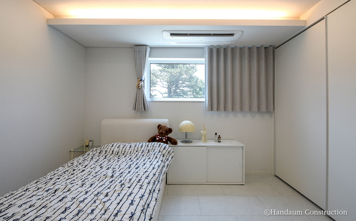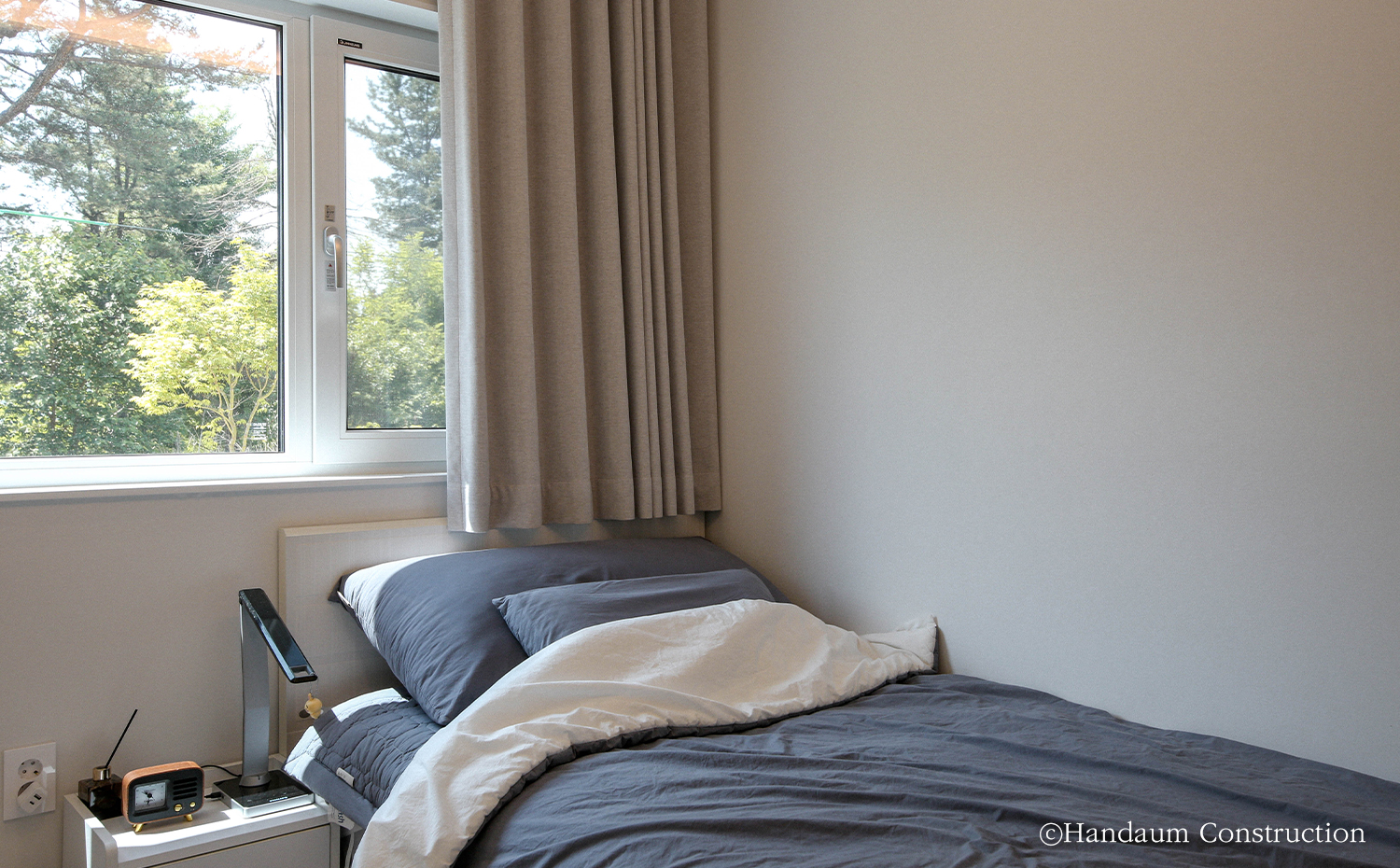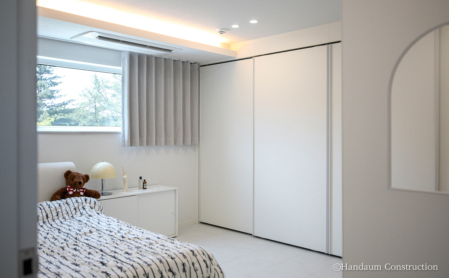 푸른 산세와 새의 예쁜 지저귐이 들려오는 주택가에 자리한 주택은 경량목구조 공법으로 설계된 40평대 주택이다. 심플한 입면이지만 사선지붕과 세라믹사이딩 외장 마감재로 포인트를 더해낸 주택은 자연 풍경과 어우러져 조화를 이뤄낸다. 내부에 빛을 고루 담길 바랐던 건축주 가족들의 바람에 따라 거실에 정면 큰 창과 1.5층 높이로 층고를 오픈하여 윗라인에도 세 개의 창을 계획하여 집 깊은 곳까지 빛이 들어오며 전체적으로 밝은 분위기를 채워넣었다. 거실과 주방을 오픈형으로 계획하여 가족들이 함께 시간을 보낼 수 있도록 공용공간을 계획했고 나머지 실들은 가족 구성원 개인의 취향을 담아 설계되었다. 둥근 아치로 포인트를 아늑함을 담아낸 실과 윈도우시트를 두어 풍경을 오롯이 즐기고자 했던 각자의 바람과 취향을 곳곳에 담아낸 공간으로 완성된 주택은 새로이 찾아올 추억들을 향해 품을 열어 두고 있다.