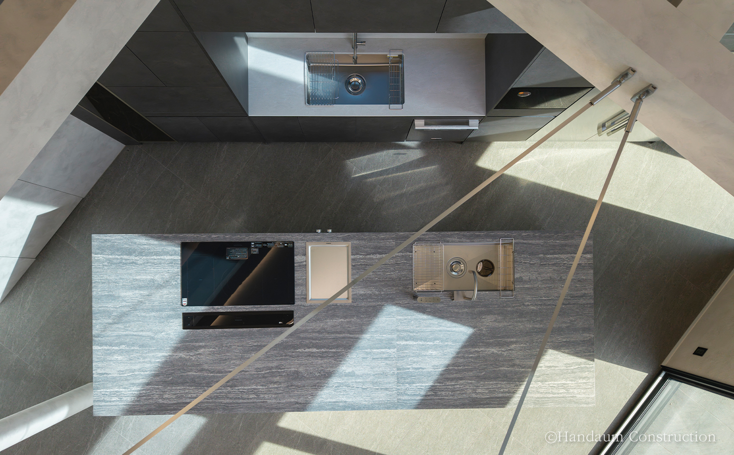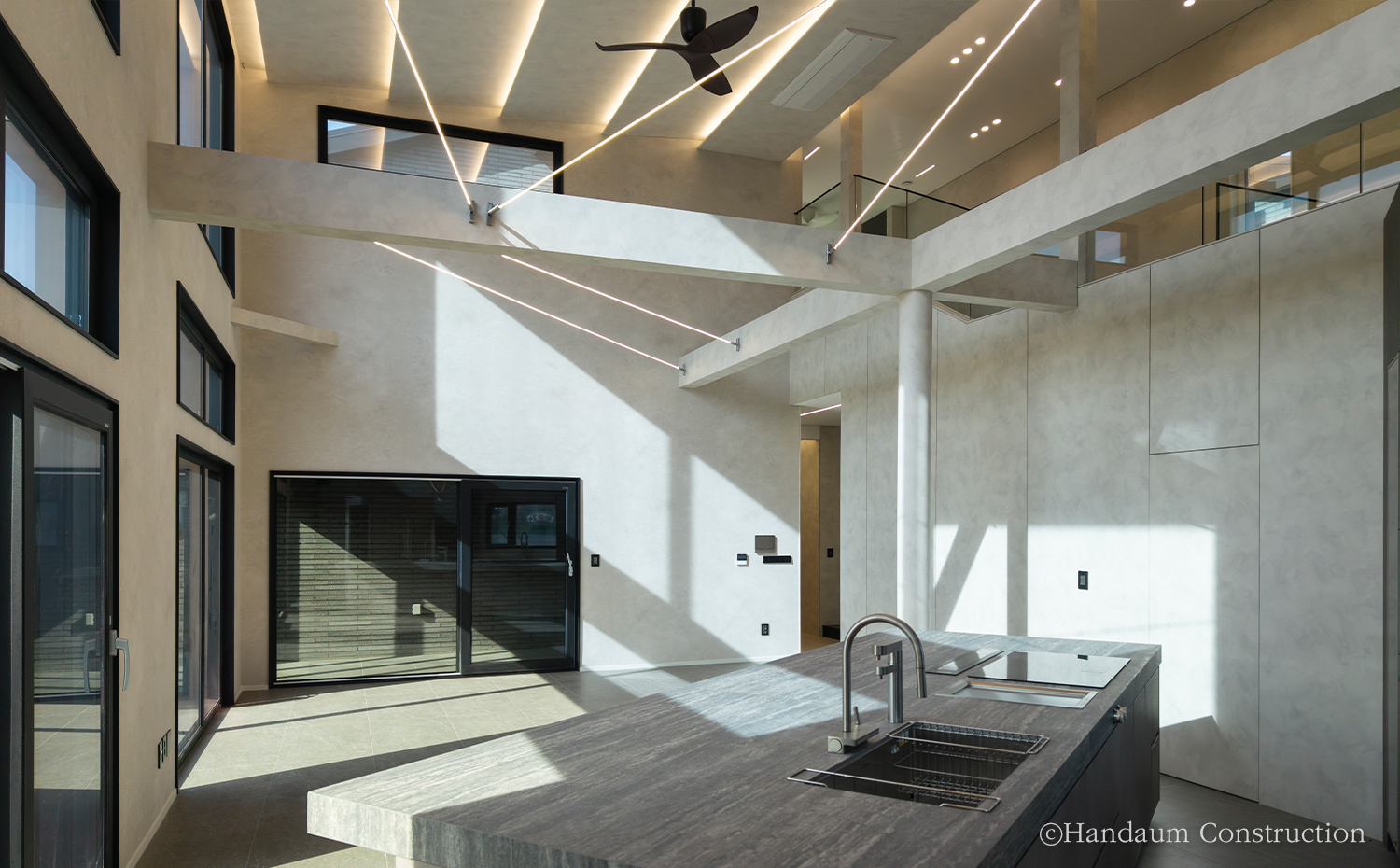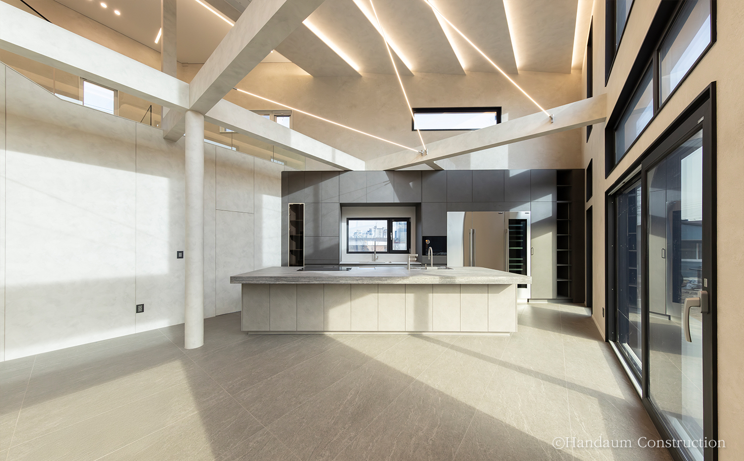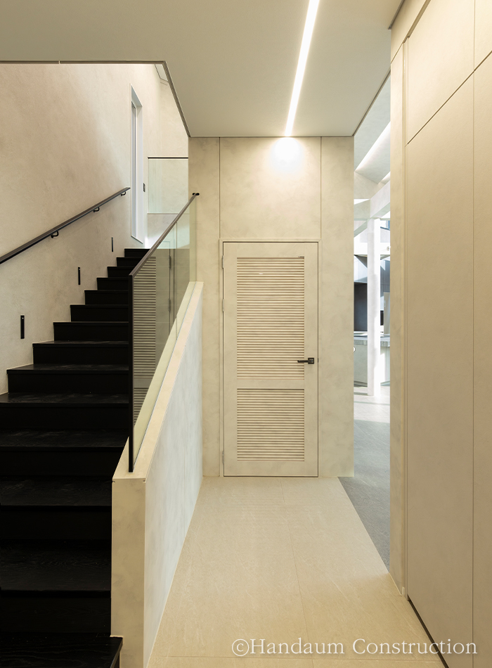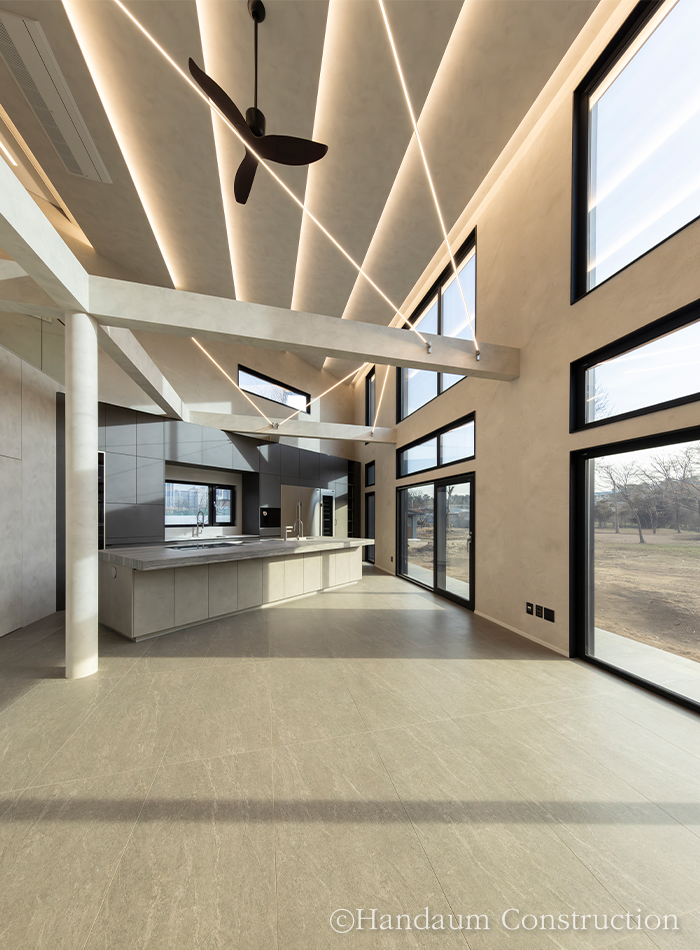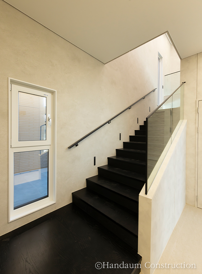 120평 규모의 이번 사례는 가족구성원이 함께 생활하는 공간으로, 아이들의 창의적인 활동과 가족 구성원의 취미를 반영해 설계되었다. 마당 확보를 위해 추가 필지를 매입하여 공간 활용을 극대화했으며, 스킵플로어 형태의 계단참에는 아이들을 위한 놀이 공간을 마련하고, 계단 하부는 해리포터 속 비밀 공간처럼 연출하여 특별한 아지트로 활용했다. 지붕 속 넓은 다락은 아이들이 성장하면서 사용할 수 있도록 계획되었고, 2층 공부방은 천장고를 높여 개방감을 극대화했다. 또한 드럼 연주를 위한 음악실과 자녀들이 동시에 사용할 수 있도록 효율적으로 분리된 욕실 공간도 특징적이다. 건축주 부부의 취미를 반영한 운동실과 노천탕을 배치했으며, 머드룸을 통해 실내로 먼지와 오염을 최소화하며 들어올 수 있도록 동선을 구성했다. 인테리어는 블랙과 그레이 톤을 중심으로 조화롭게 연출되었으며, 조명 역시 은은한 분위기를 위해 낮은 조도를 적용했다. 개방적인 거실 구조와 큰 창을 통해 자연 채광을 극대화하여 밝고 따뜻한 주거 환경을 조성했다. 실용성과 감성이 조화된 이 주택은 단순한 주거 공간을 넘어 가족의 행복과 추억이 쌓이는 특별한 보금자리가 되었다.