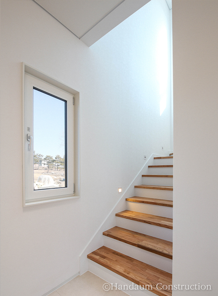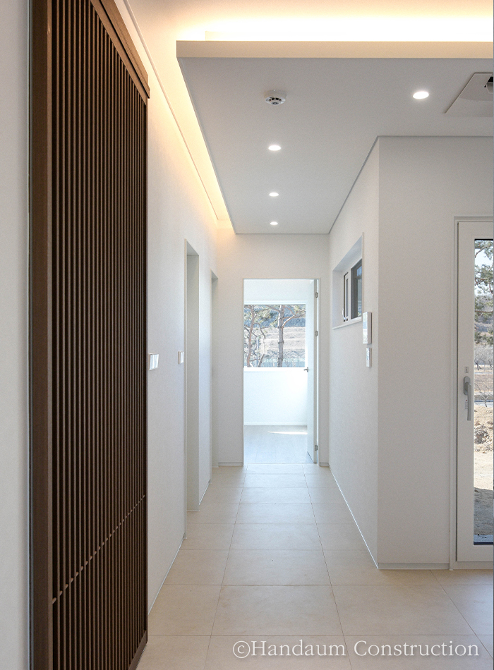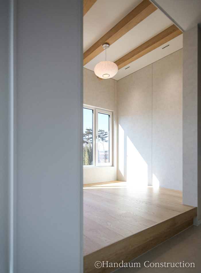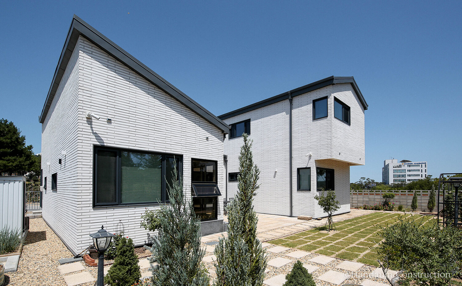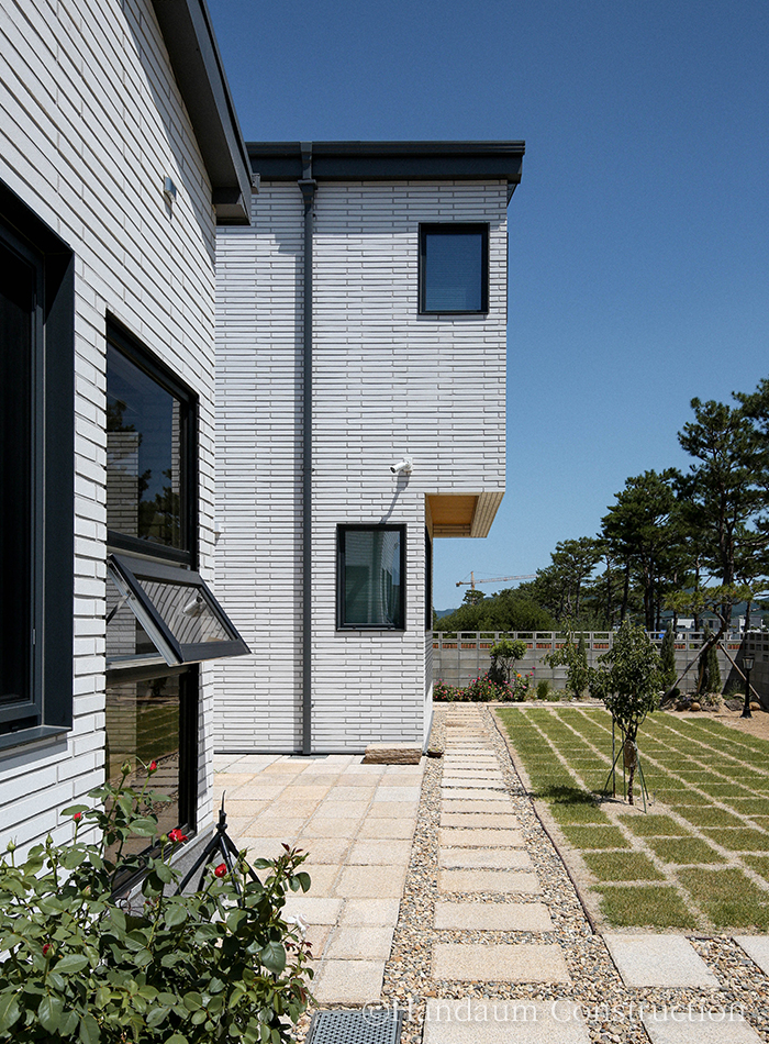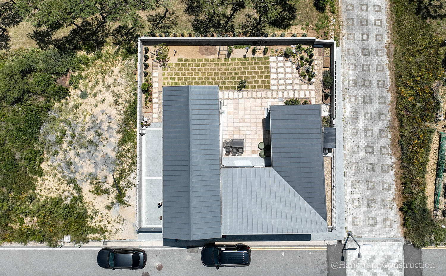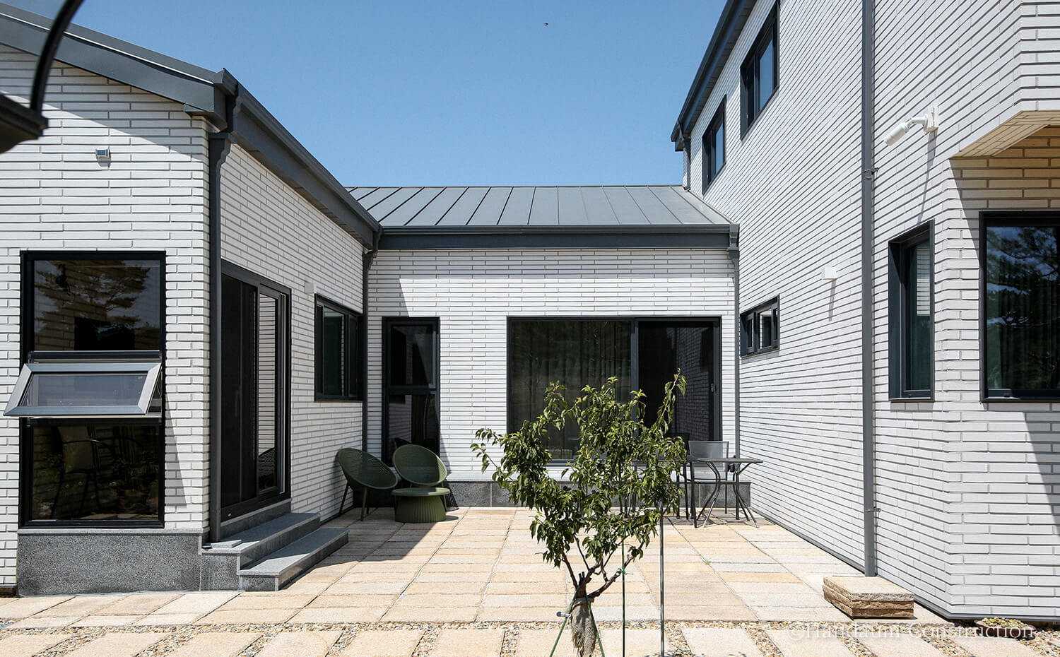 건축주님은 과거 집에서의 프라이버시 문제를 겪으며, 두 번째 집에서는 공간의 독립성과 가족의 안락함을 가장 중요하게 생각하셨다. 첫 미팅부터 구체적인 공간 구상을 갖고 계셨고, 설계는 이를 현실화하는 과정이었다. 이렇게 완성된 안동 중정주택은 ‘ㄷ’자형 평면 구성으로 외부 시선을 차단하고, 거실 앞 중정 마당을 통해 가족만의 프라이빗한 외부 공간을 확보하였다. 오른쪽 매스에 2층을 계획해 구조 자체로 프라이버시를 극대화하였고, 외관은 도로에서 보았을 때 단단하고 웅장한 인상을 주도록 디자인하였다. 지붕은 중정 쪽으로 슬로프를 주어 공간에 개방감과 리듬을 더했으며, 밝은 모노타일과 징크 지붕으로 집 전체에 따뜻하고 화사한 이미지를 담았다. 안동 중정주택은 건축주의 생각과 삶이 구체적으로 녹아든 설계의 결과이다. 한다움건설은 그 생각을 집이라는 형태로 정성스럽게 구현하였다.