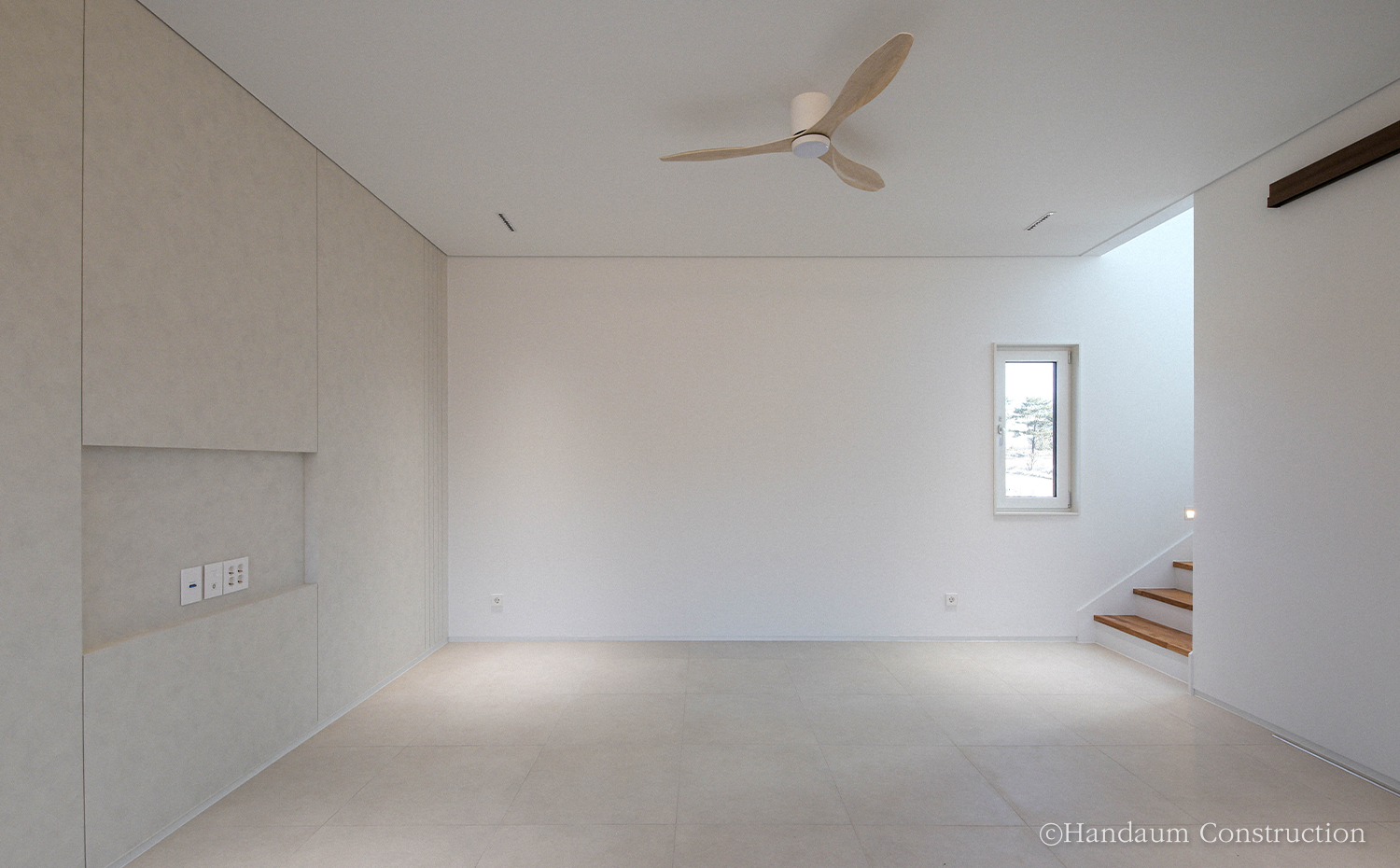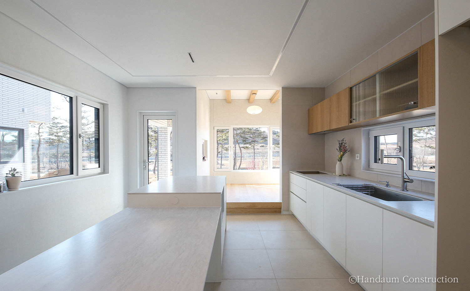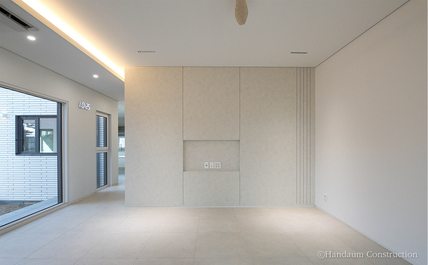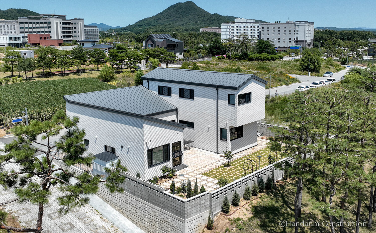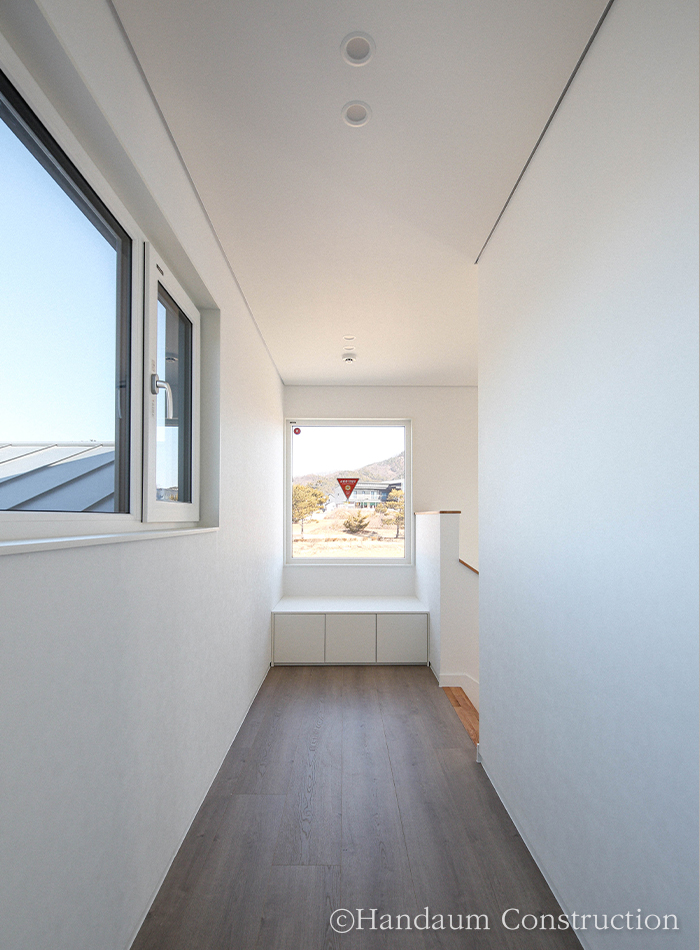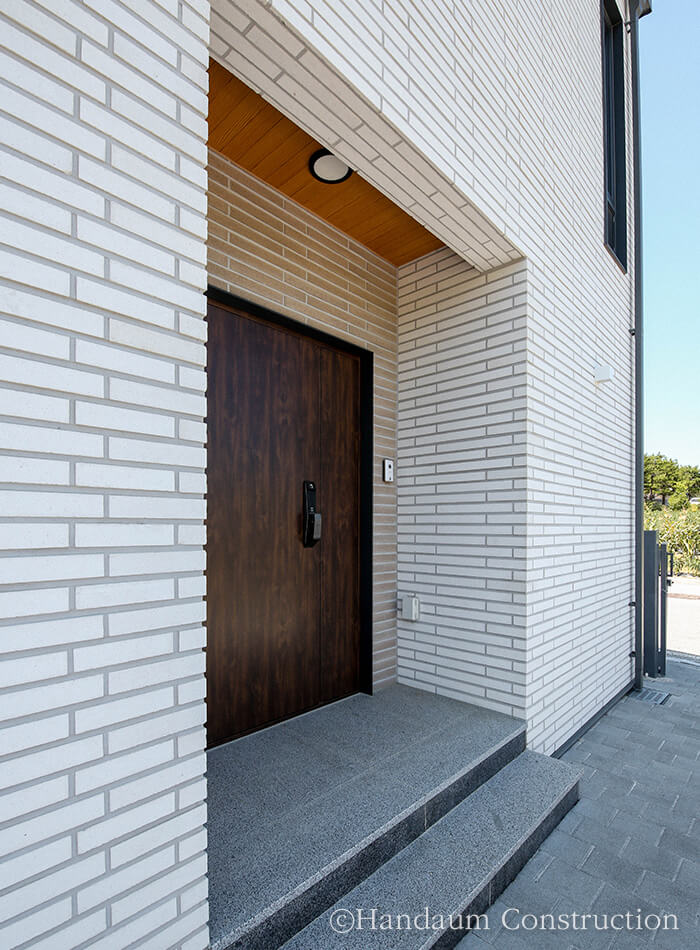 건축주님은 과거 집에서의 프라이버시 문제를 겪으며, 두 번째 집에서는 공간의 독립성과 가족의 안락함을 가장 중요하게 생각하셨다. 첫 미팅부터 구체적인 공간 구상을 갖고 계셨고, 설계는 이를 현실화하는 과정이었다. 이렇게 완성된 안동 중정주택은 ‘ㄷ’자형 평면 구성으로 외부 시선을 차단하고, 거실 앞 중정 마당을 통해 가족만의 프라이빗한 외부 공간을 확보하였다. 오른쪽 매스에 2층을 계획해 구조 자체로 프라이버시를 극대화하였고, 외관은 도로에서 보았을 때 단단하고 웅장한 인상을 주도록 디자인하였다. 지붕은 중정 쪽으로 슬로프를 주어 공간에 개방감과 리듬을 더했으며, 밝은 모노타일과 징크 지붕으로 집 전체에 따뜻하고 화사한 이미지를 담았다. 안동 중정주택은 건축주의 생각과 삶이 구체적으로 녹아든 설계의 결과이다. 한다움건설은 그 생각을 집이라는 형태로 정성스럽게 구현하였다.