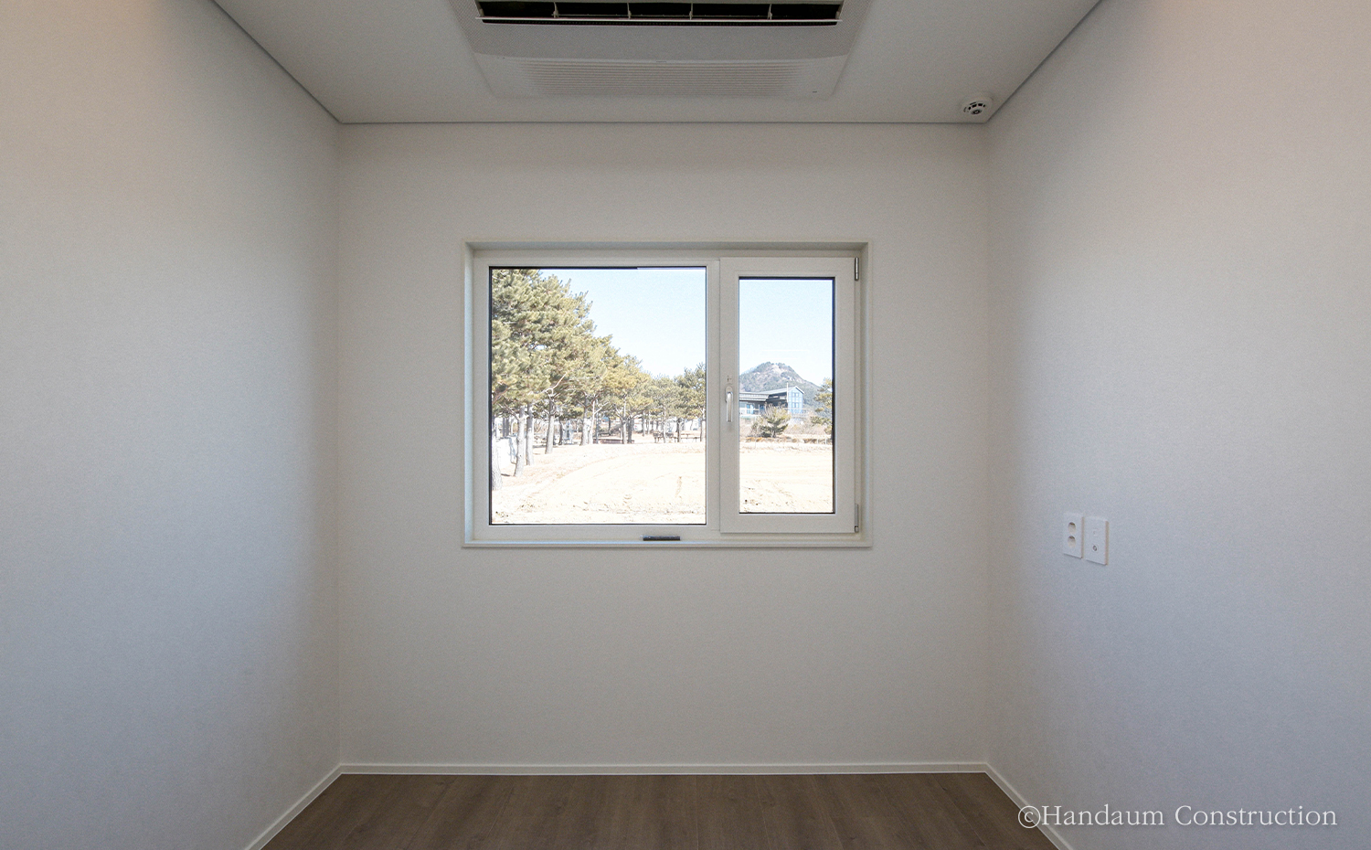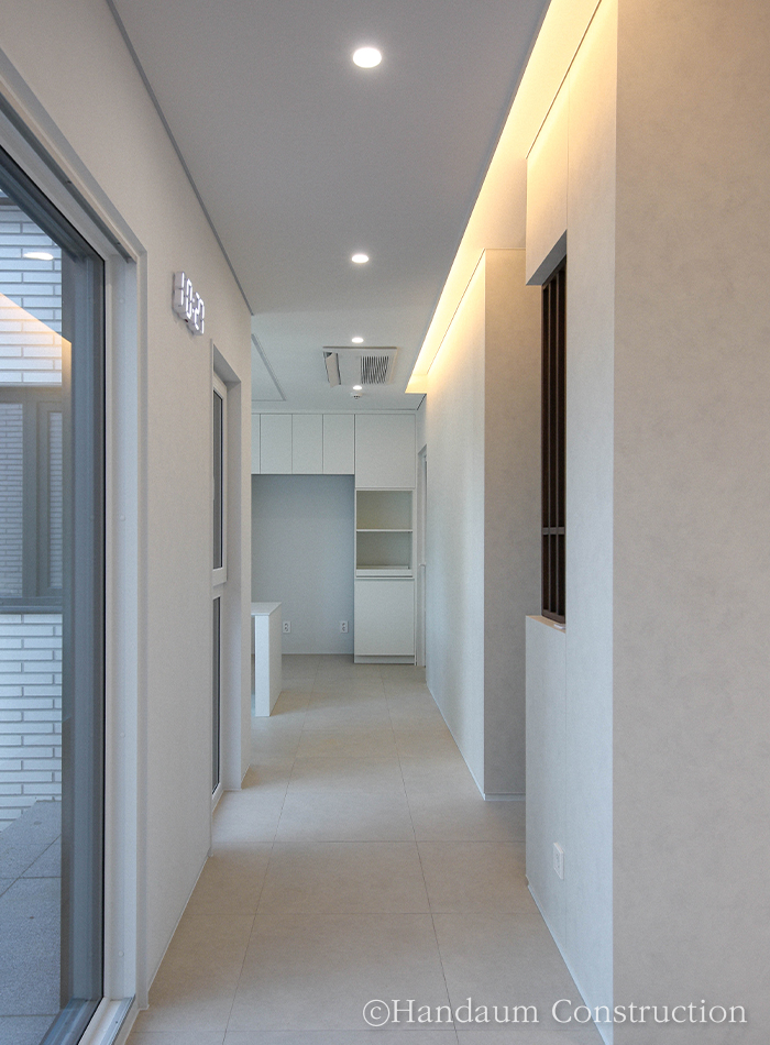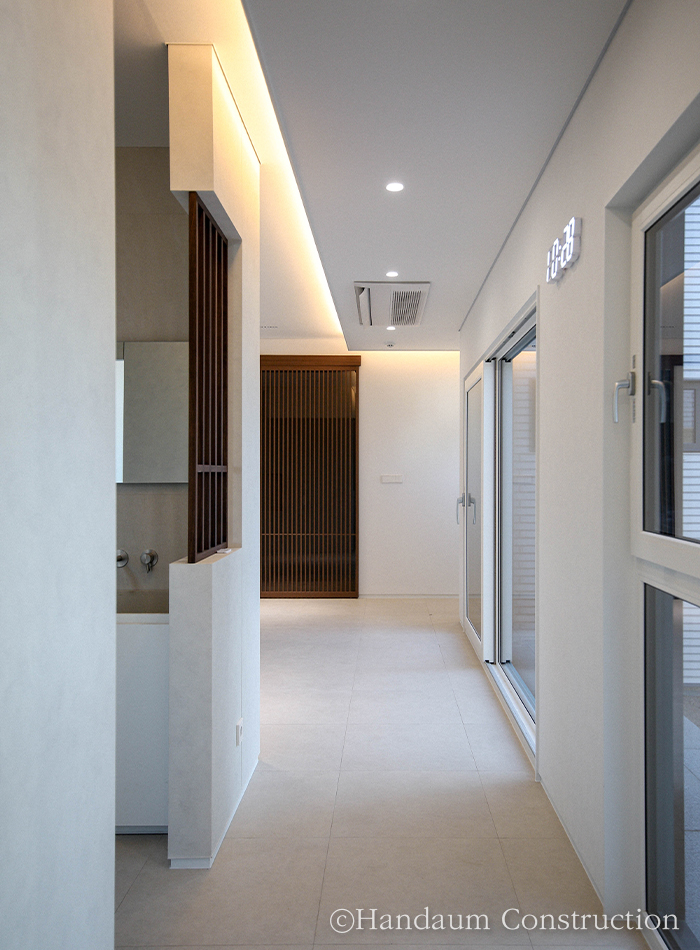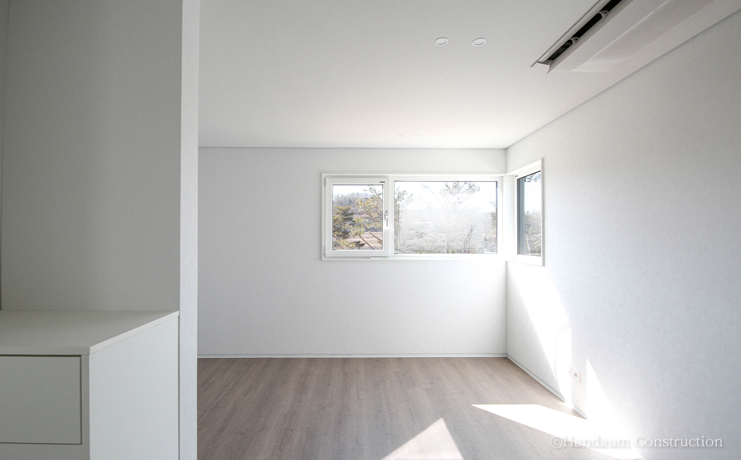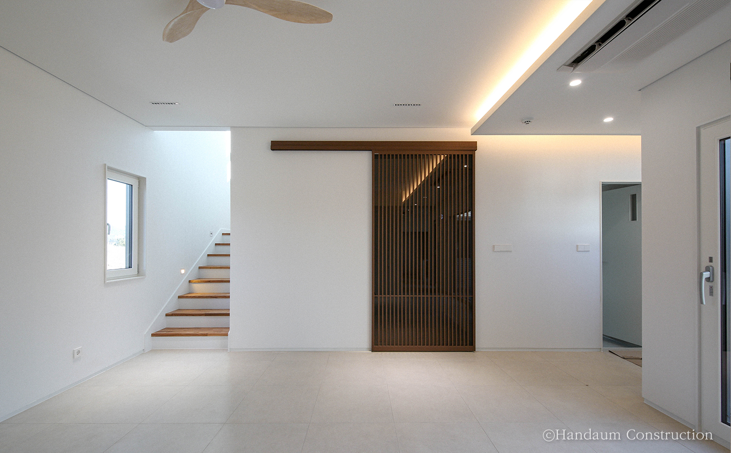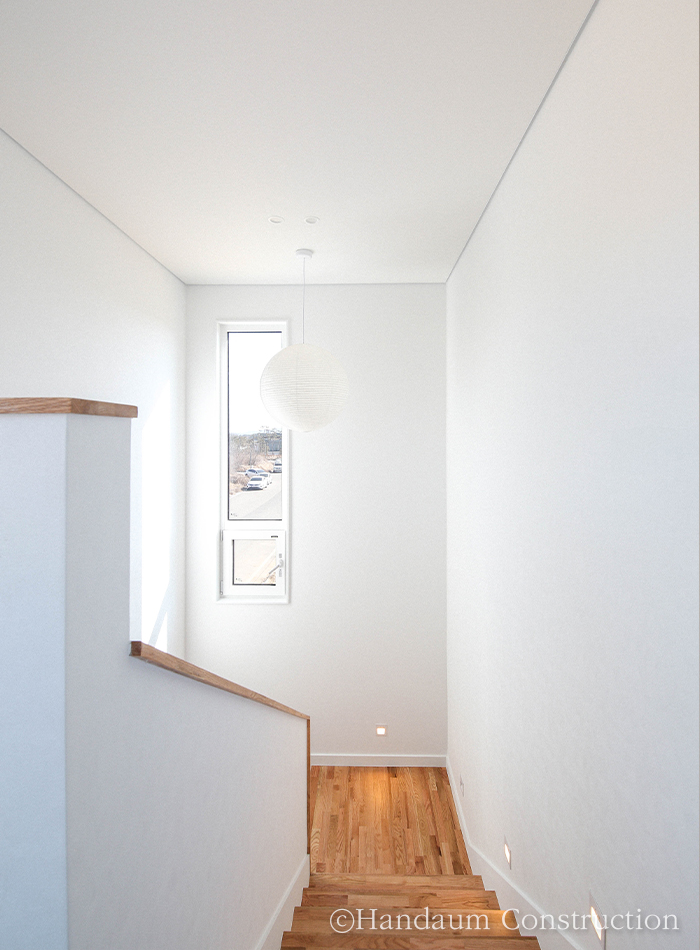 건축주님은 과거 집에서의 프라이버시 문제를 겪으며, 두 번째 집에서는 공간의 독립성과 가족의 안락함을 가장 중요하게 생각하셨다. 첫 미팅부터 구체적인 공간 구상을 갖고 계셨고, 설계는 이를 현실화하는 과정이었다. 이렇게 완성된 안동 중정주택은 ‘ㄷ’자형 평면 구성으로 외부 시선을 차단하고, 거실 앞 중정 마당을 통해 가족만의 프라이빗한 외부 공간을 확보하였다. 오른쪽 매스에 2층을 계획해 구조 자체로 프라이버시를 극대화하였고, 외관은 도로에서 보았을 때 단단하고 웅장한 인상을 주도록 디자인하였다. 지붕은 중정 쪽으로 슬로프를 주어 공간에 개방감과 리듬을 더했으며, 밝은 모노타일과 징크 지붕으로 집 전체에 따뜻하고 화사한 이미지를 담았다. 안동 중정주택은 건축주의 생각과 삶이 구체적으로 녹아든 설계의 결과이다. 한다움건설은 그 생각을 집이라는 형태로 정성스럽게 구현하였다.