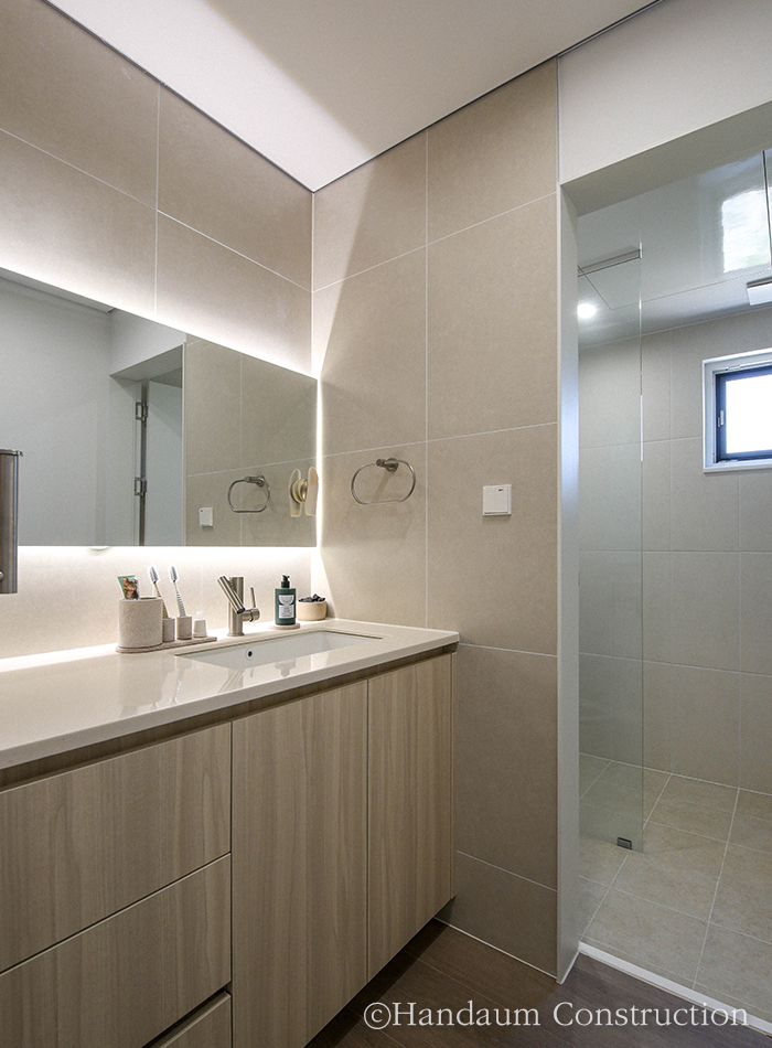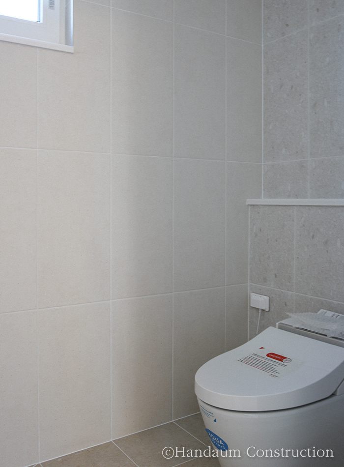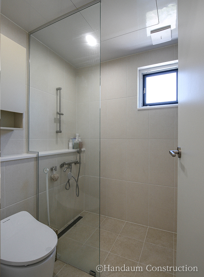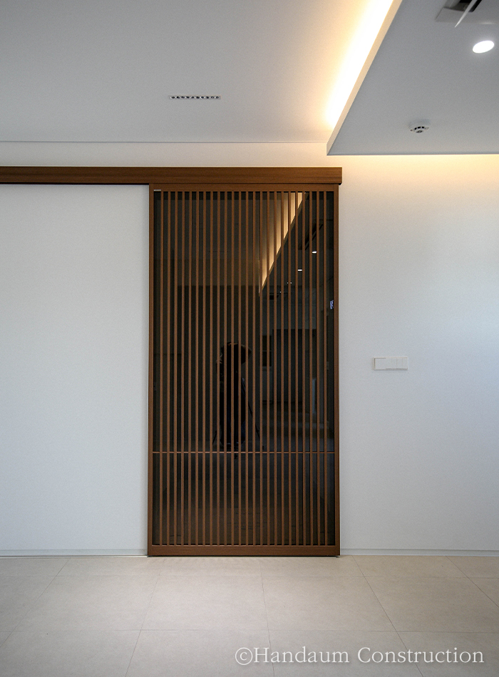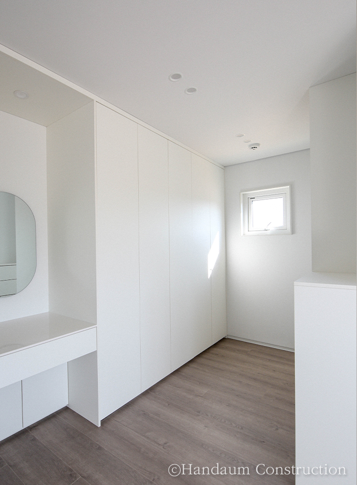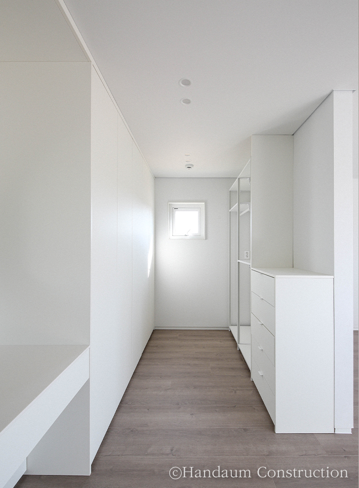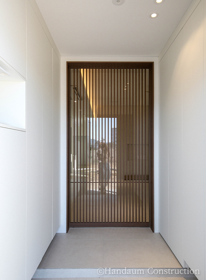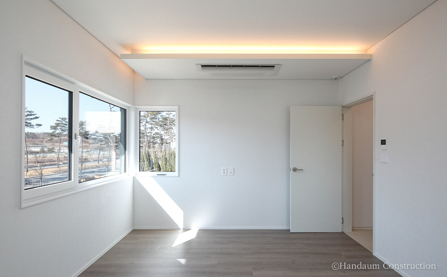건축주님은 과거 집에서의 프라이버시 문제를 겪으며, 두 번째 집에서는 공간의 독립성과 가족의 안락함을 가장 중요하게 생각하셨다. 첫 미팅부터 구체적인 공간 구상을 갖고 계셨고, 설계는 이를 현실화하는 과정이었다. 이렇게 완성된 안동 중정주택은 ‘ㄷ’자형 평면 구성으로 외부 시선을 차단하고, 거실 앞 중정 마당을 통해 가족만의 프라이빗한 외부 공간을 확보하였다. 오른쪽 매스에 2층을 계획해 구조 자체로 프라이버시를 극대화하였고, 외관은 도로에서 보았을 때 단단하고 웅장한 인상을 주도록 디자인하였다. 지붕은 중정 쪽으로 슬로프를 주어 공간에 개방감과 리듬을 더했으며, 밝은 모노타일과 징크 지붕으로 집 전체에 따뜻하고 화사한 이미지를 담았다. 안동 중정주택은 건축주의 생각과 삶이 구체적으로 녹아든 설계의 결과이다. 한다움건설은 그 생각을 집이라는 형태로 정성스럽게 구현하였다.