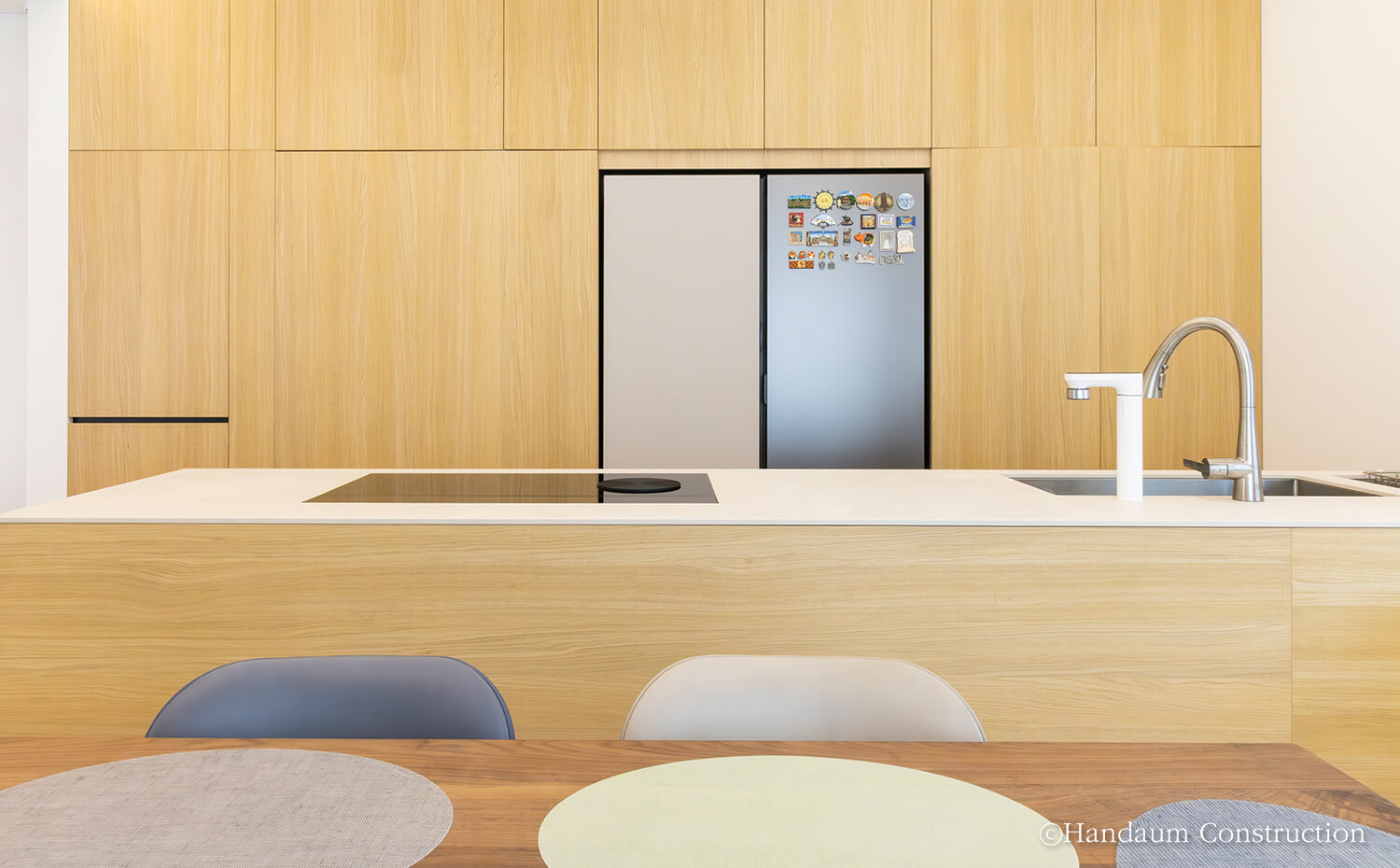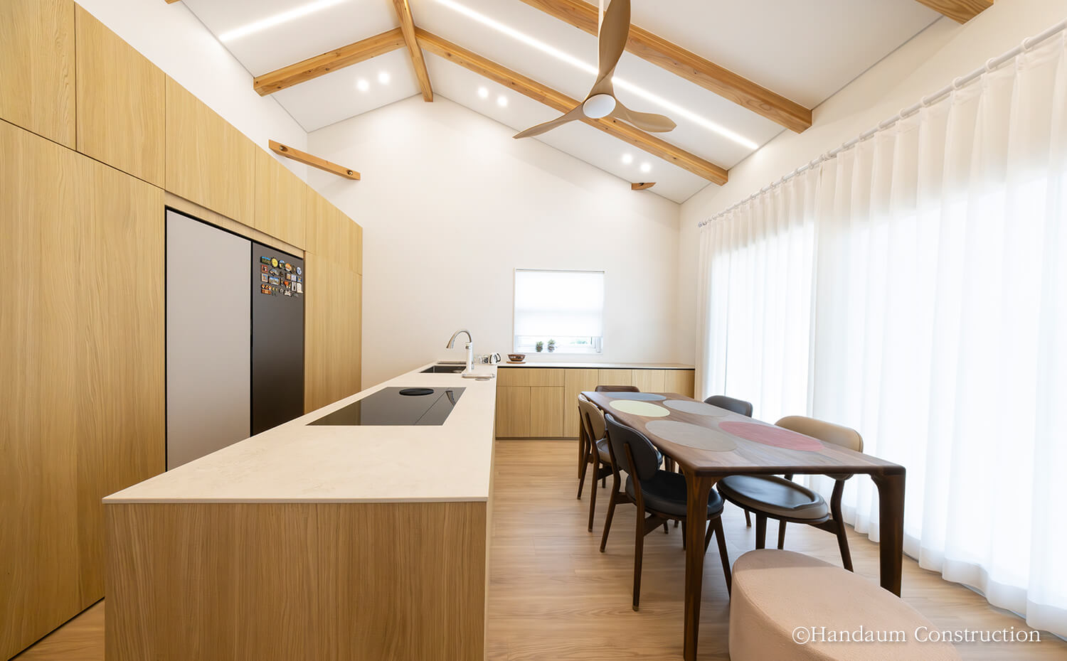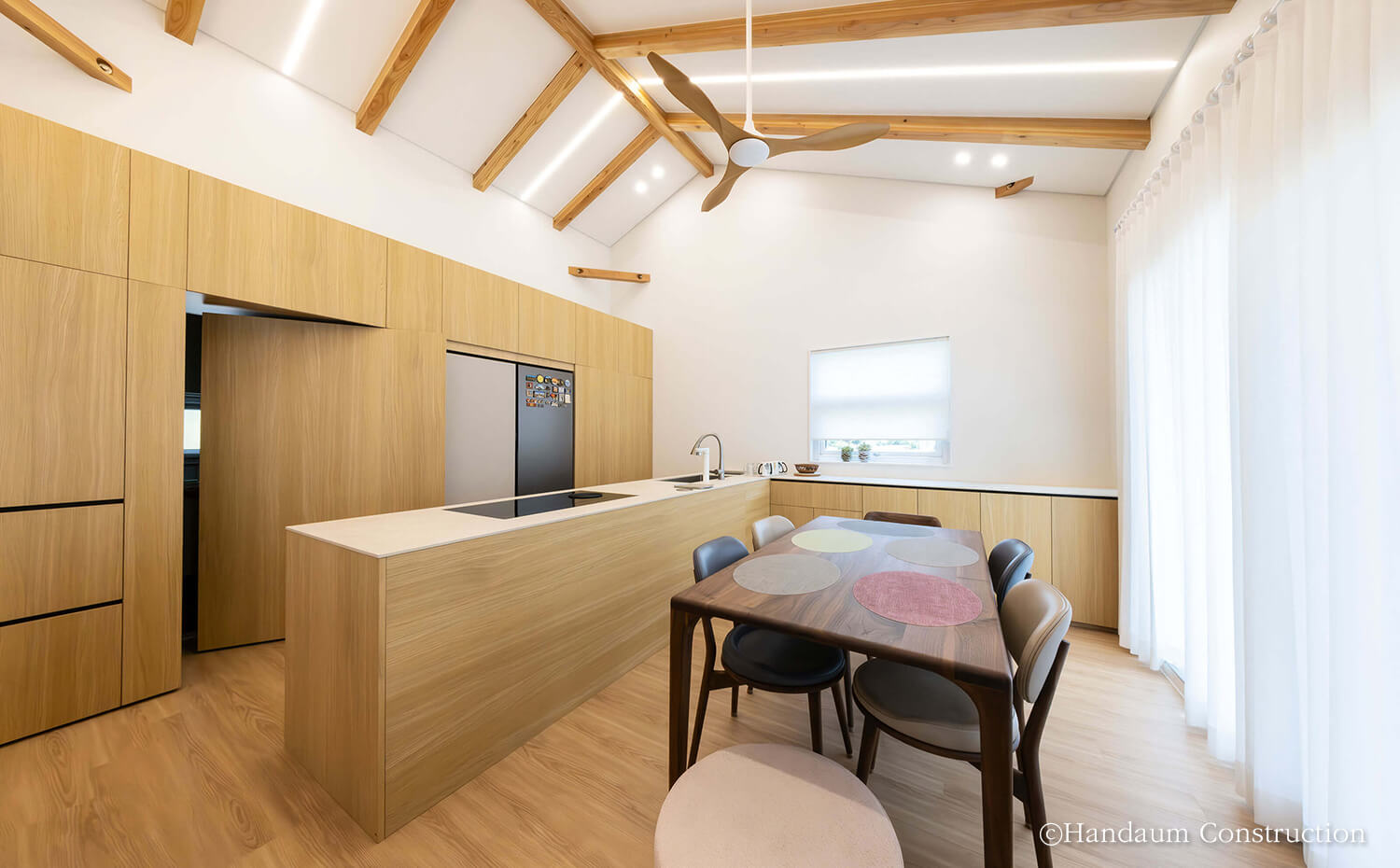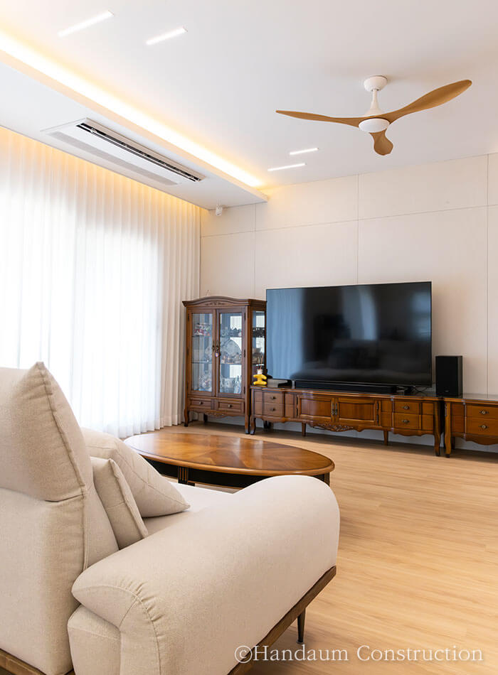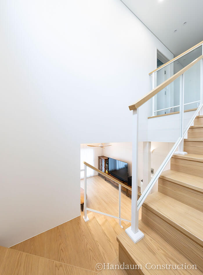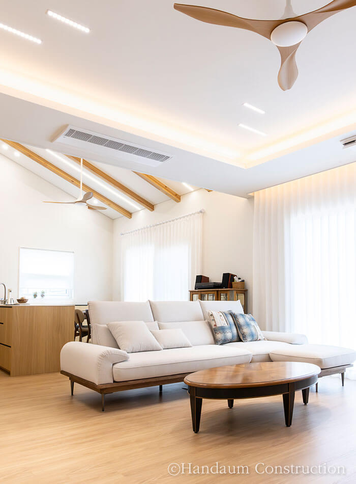 빼곡한 고층 아파트 사이에 자리한 이 단독주택은 건축주 부부의 삶과 자녀들의 휴식을 함께 담았습니다. 대지 여건과 건축주의 요구를 반영해 공간 구성에 집중한 설계를 통해 1층에는 오픈형 거실과 주방, 부부 침실을 배치하고, 2층은 자녀들이 언제든 머무를 수 있는 공간과 취미공간을 담고 있습니다. 특히 거실 대신 주방 상부의 층고를 높이고 중목 보를 노출해 아늑하면서도 개방감 있는 분위기를 느낄 수 있습니다.