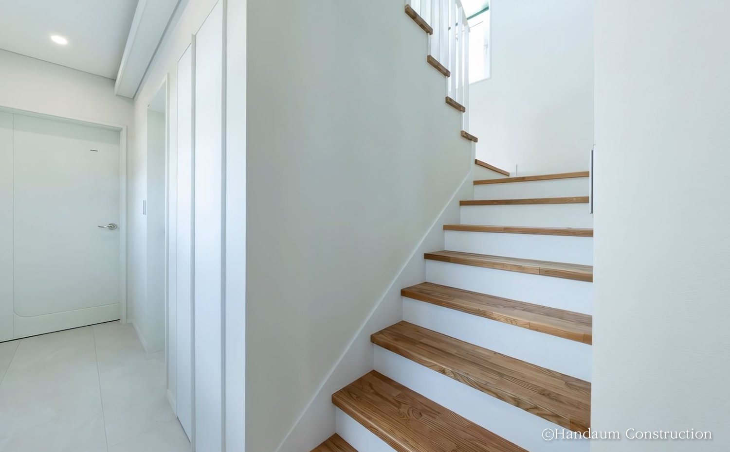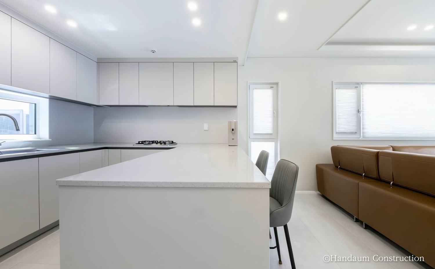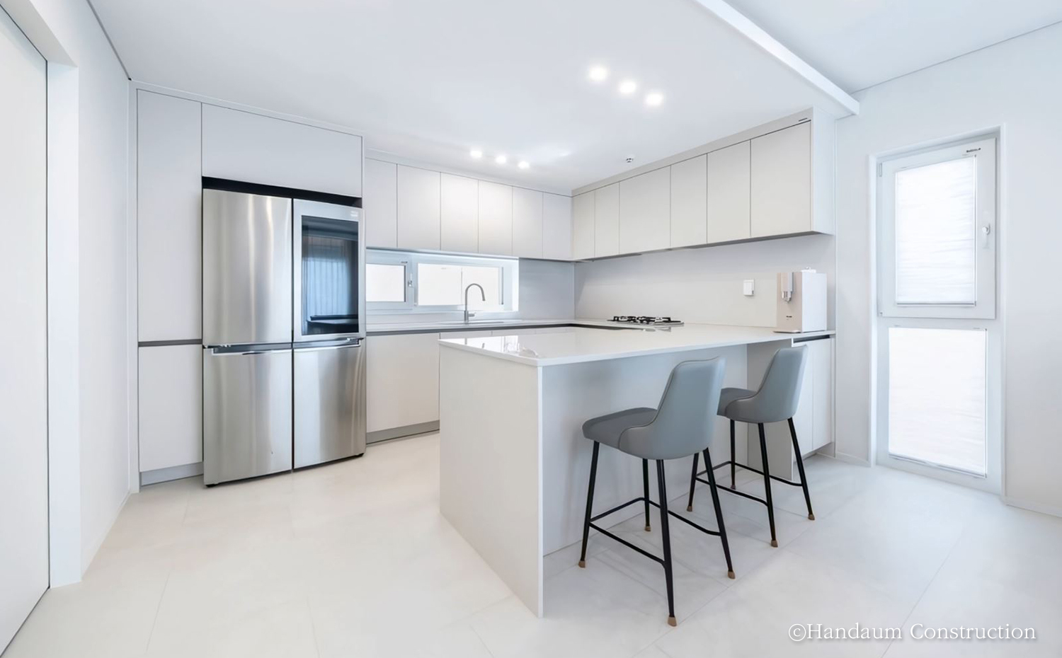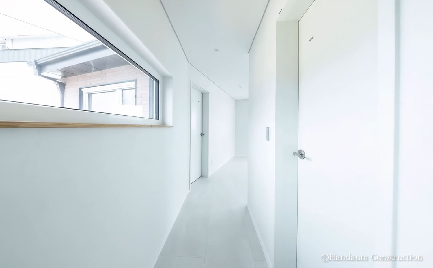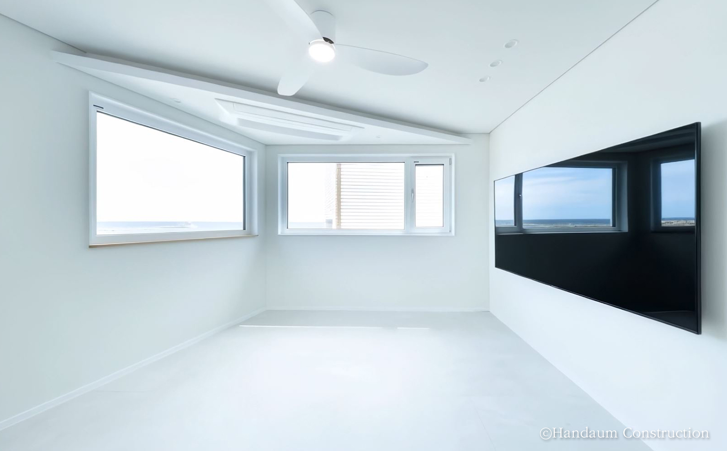 이 집은 노후된 옛집 자리에 새롭게 기억과 시간을 쌓아갈 집이다. 부채꼴 모양의 대지를 따라 펼쳐진 집은 바다를 창 너머 일상으로 끌어들이며, 현관을 중심으로 공용과 개인의 시간을 나누어 각자가 머무는 순간을 존중할 수 있는 공간을 담았다. 각 실은 활용도 높은 동선을 바탕으로 독립적인 성격을 유지할 수 있도록 계획하였으며, 내부는 화이트 톤과 스톤 무늬 바닥재를 적용해 심플하고 깔끔한 분위기를 연출하였다.