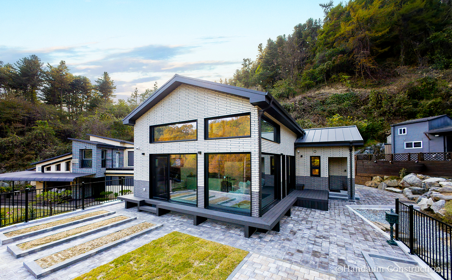 담백한 박공 디자인에 중목 노출보를 더한 30평대 중목구조 주택