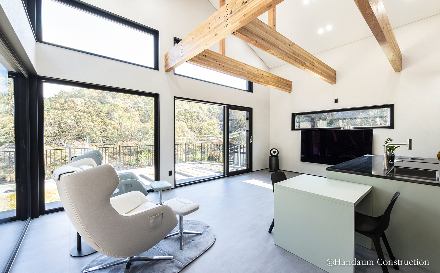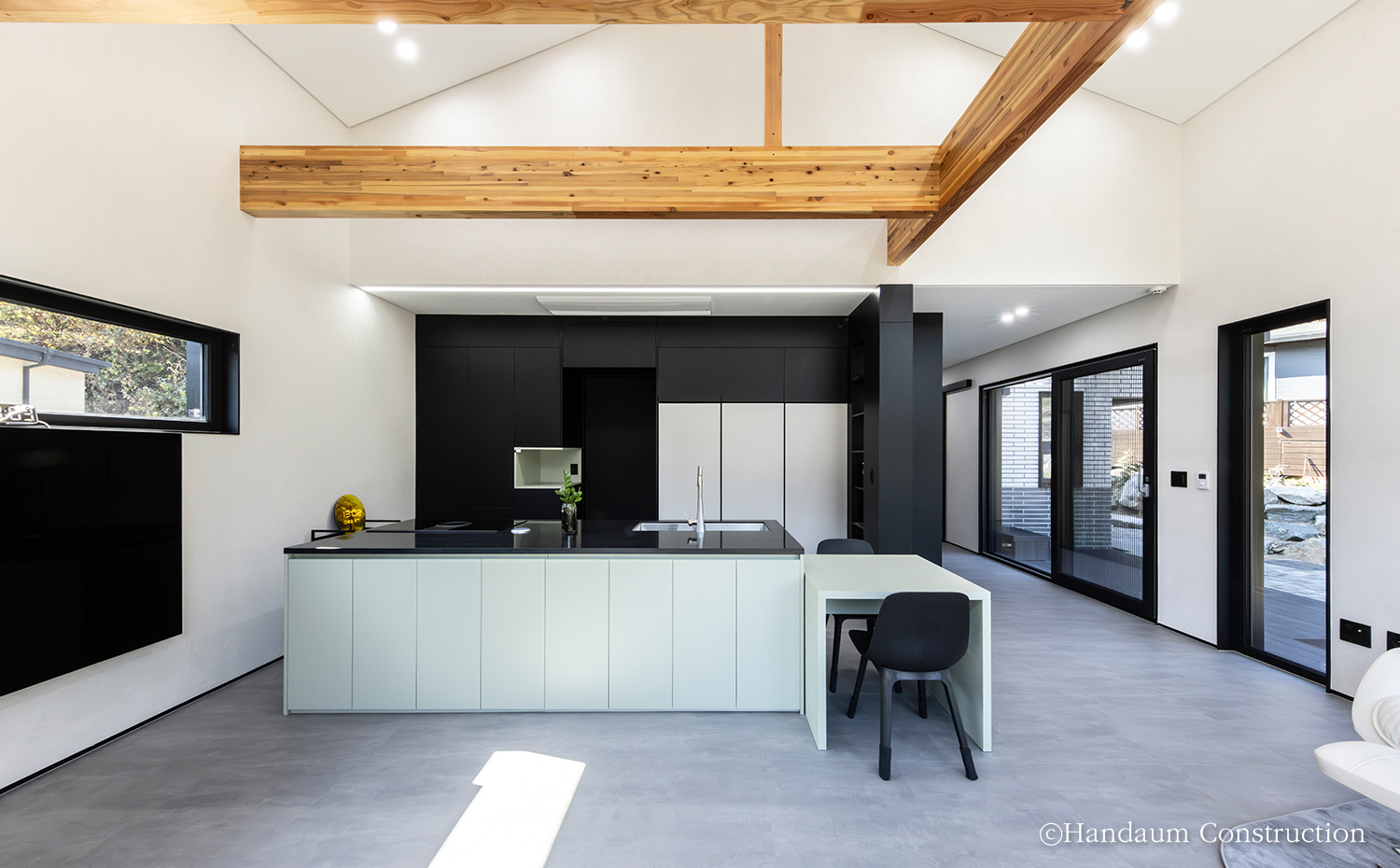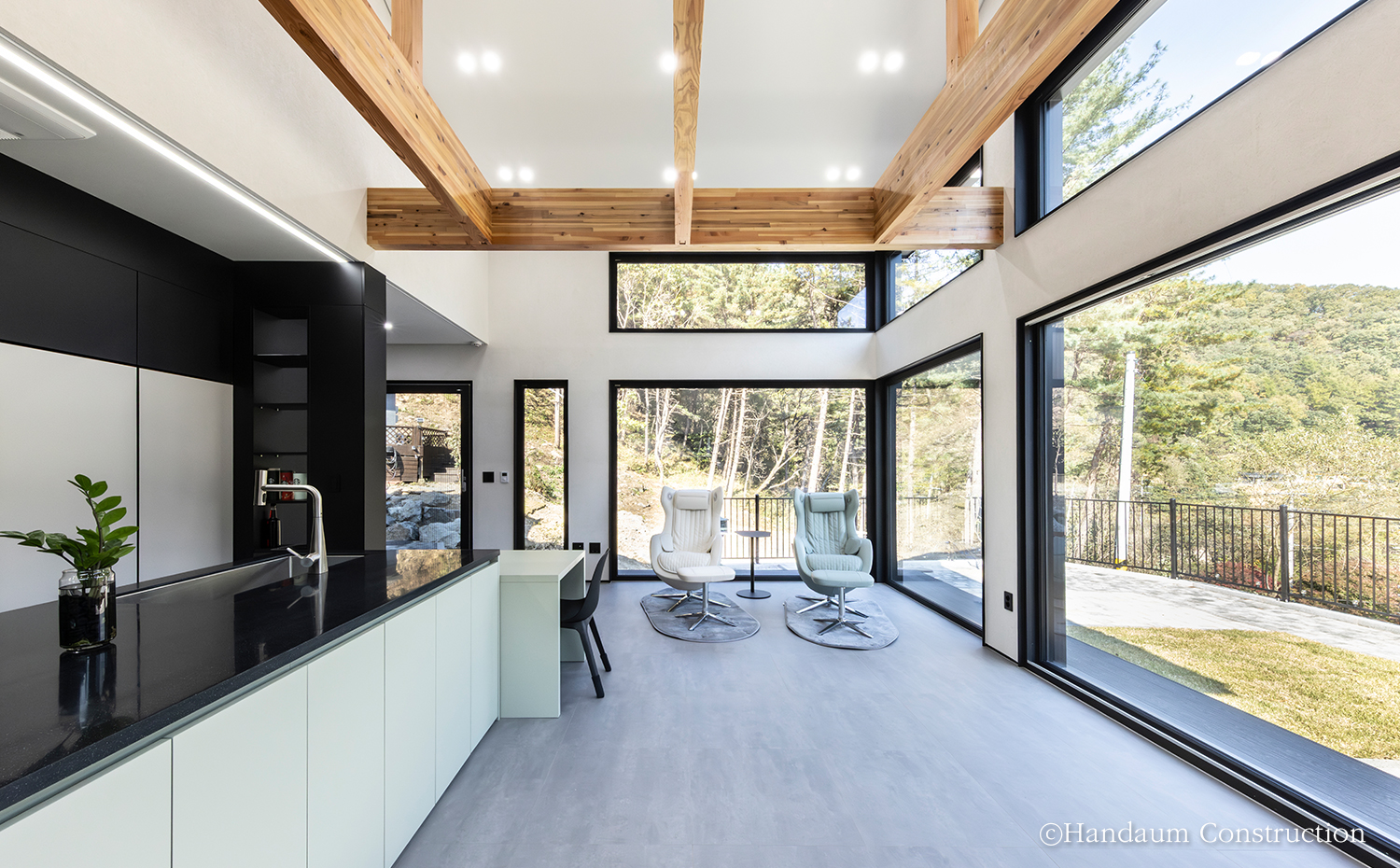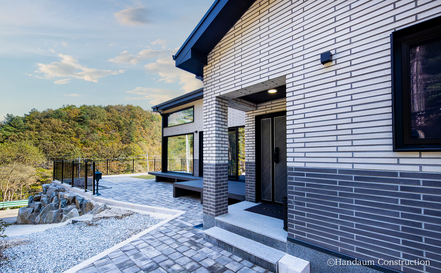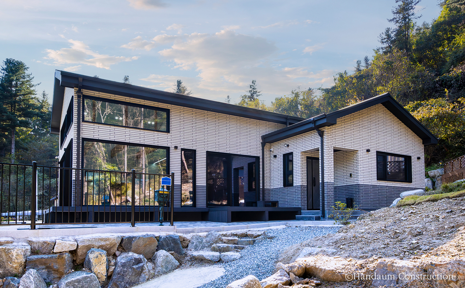 가평의 자연을 담은 이 30평 단층주택은 처음에는 경량목구조로 설계되었지만, 보다 안정감 있는 구조를 원하는 건축주의 요청에 따라 중목구조로 재설계해 완성된 주택이다. 외관은 부부가 원하는 단정하고 차분한 박공 형태를 유지해 시간이 지나도 변치 않는 클래식한 주택의 이미지를 살렸고, 내부는 중목구조만이 표현할 수 있는 웅장한 노출보를 공용 공간에 드러내어 집 안으로 들어서는 순간 확 트이는 개방감과 따뜻한 목재의 질감을 동시에 느낄 수 있도록 하였다. 거실과 주방을 하나로 묶어내는 높은 천장, 빛을 크게 받아들이는 대형 창호, 실용적인 단층 동선까지 살려내었다. 외관은 담백하게, 내부는 구조미를 드러내며 부부의 취향과 중목구조의 장점이 자연스럽게 공존하는 단층주택으로 완성되었다.