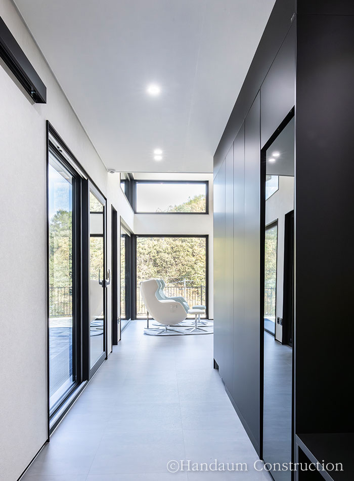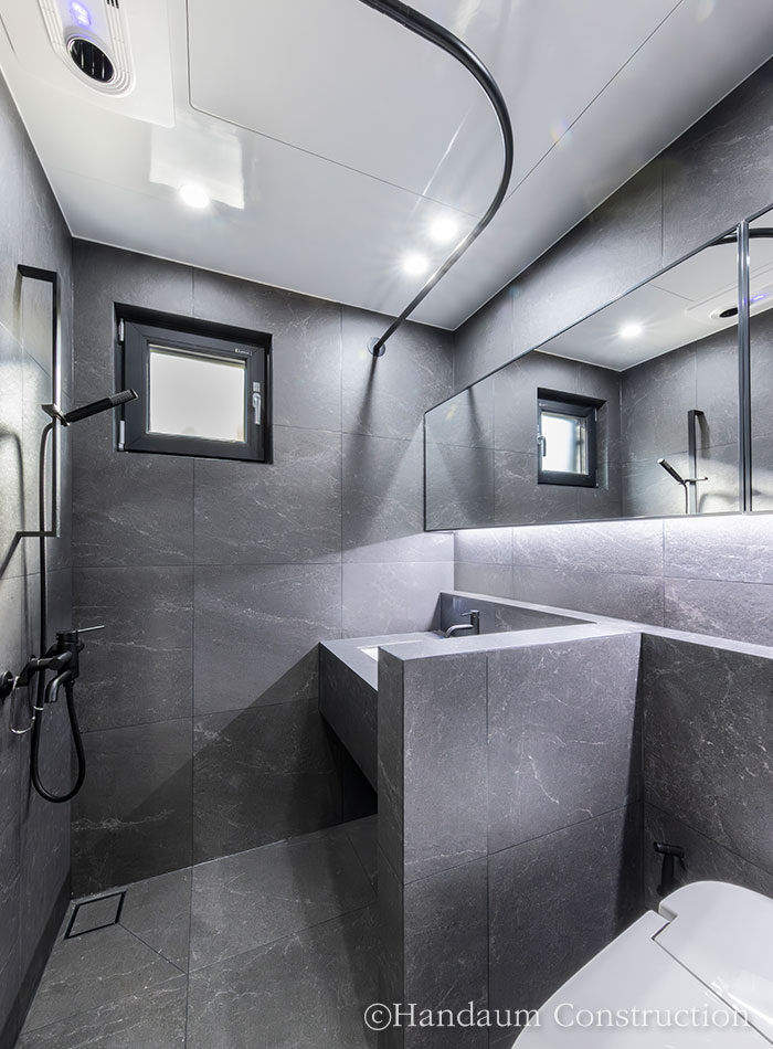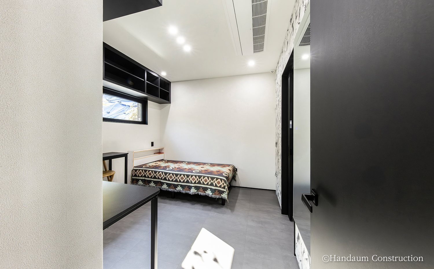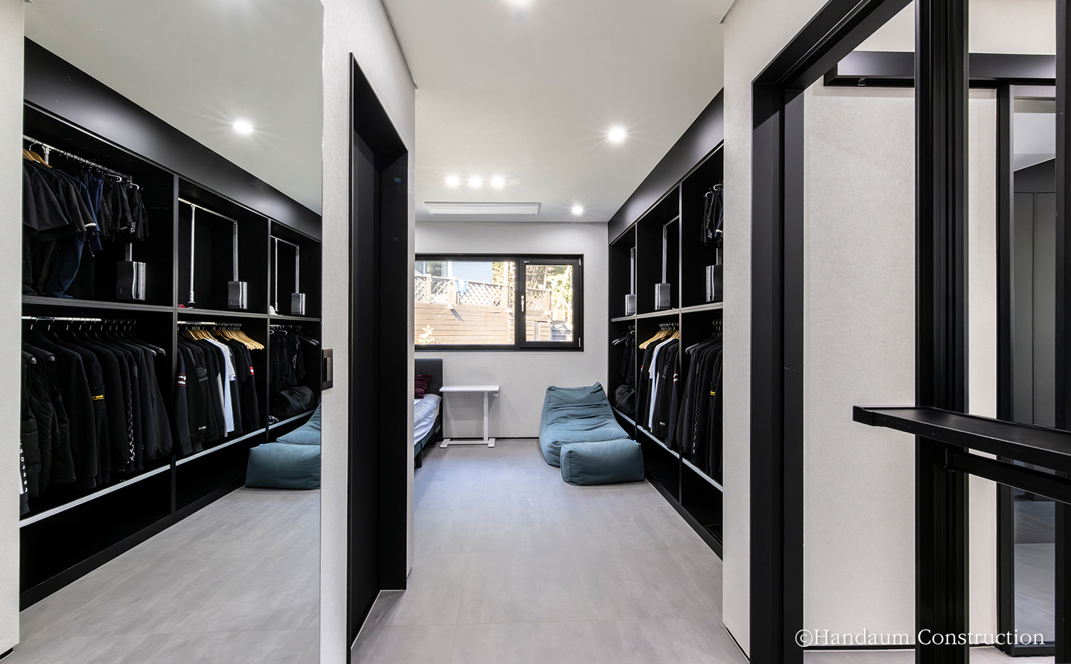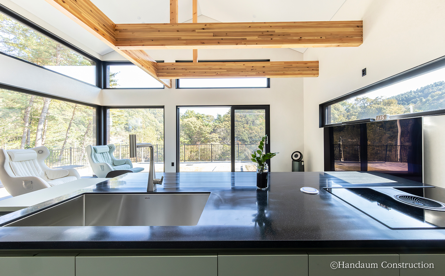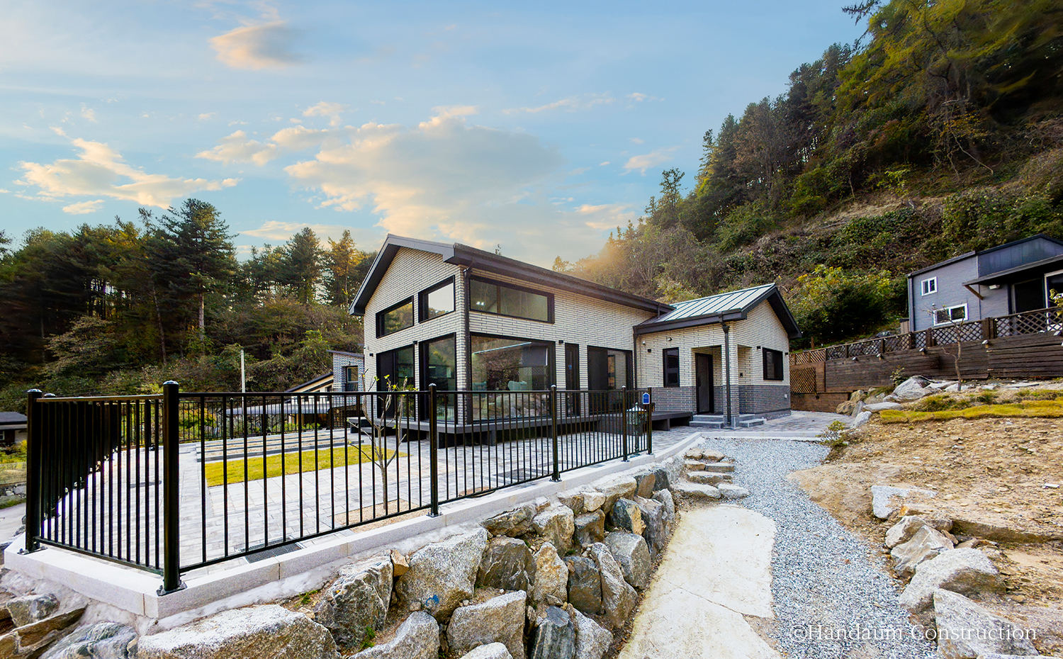 가평의 자연을 담은 이 30평 단층주택은 처음에는 경량목구조로 설계되었지만, 보다 안정감 있는 구조를 원하는 건축주의 요청에 따라 중목구조로 재설계해 완성된 주택이다. 외관은 부부가 원하는 단정하고 차분한 박공 형태를 유지해 시간이 지나도 변치 않는 클래식한 주택의 이미지를 살렸고, 내부는 중목구조만이 표현할 수 있는 웅장한 노출보를 공용 공간에 드러내어 집 안으로 들어서는 순간 확 트이는 개방감과 따뜻한 목재의 질감을 동시에 느낄 수 있도록 하였다. 거실과 주방을 하나로 묶어내는 높은 천장, 빛을 크게 받아들이는 대형 창호, 실용적인 단층 동선까지 살려내었다. 외관은 담백하게, 내부는 구조미를 드러내며 부부의 취향과 중목구조의 장점이 자연스럽게 공존하는 단층주택으로 완성되었다.