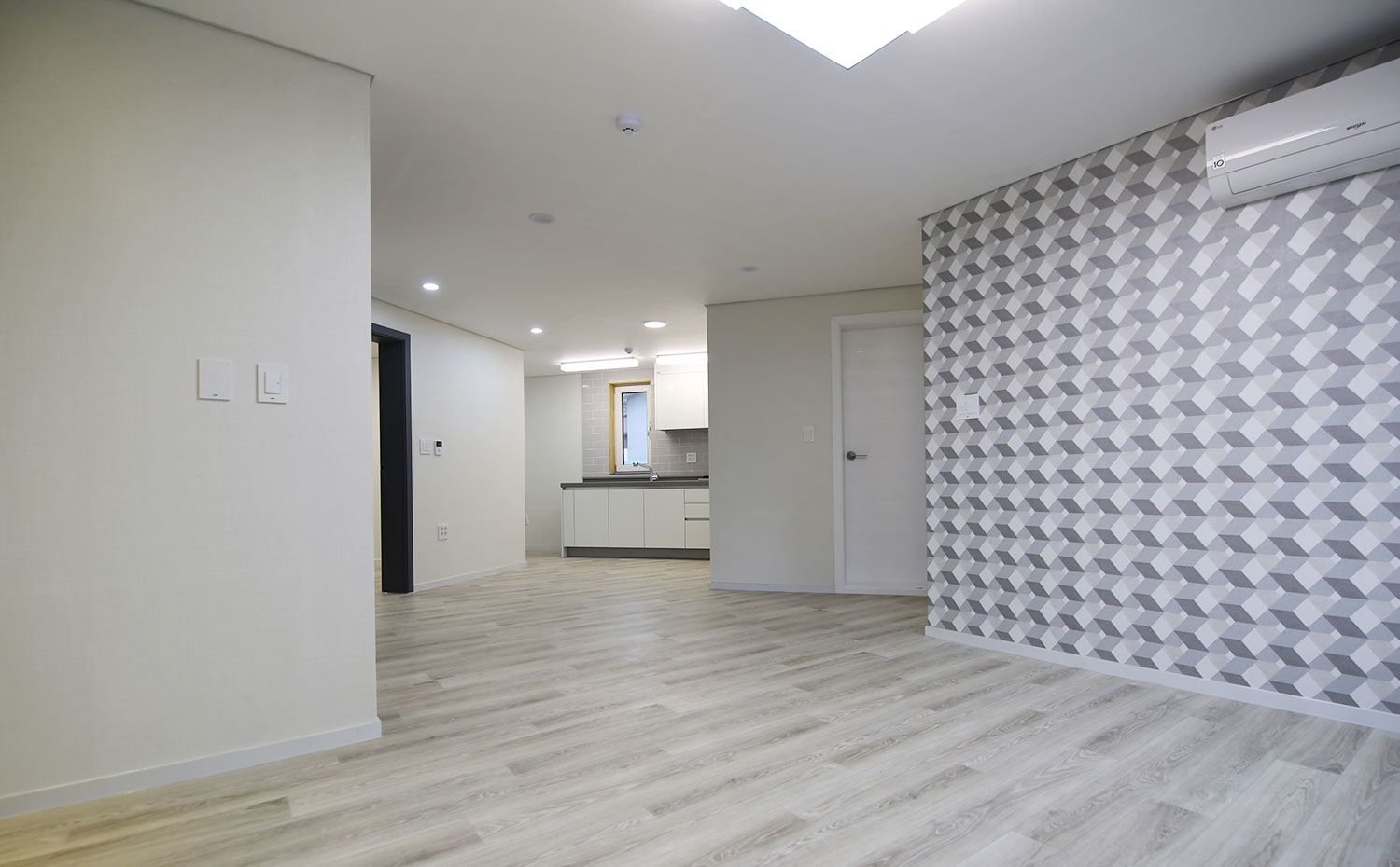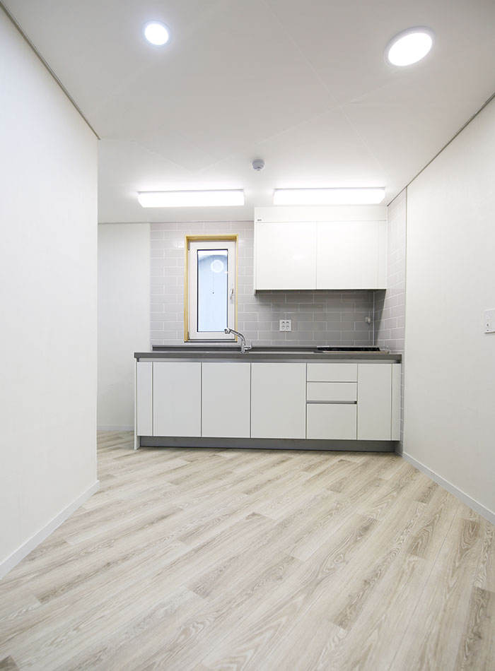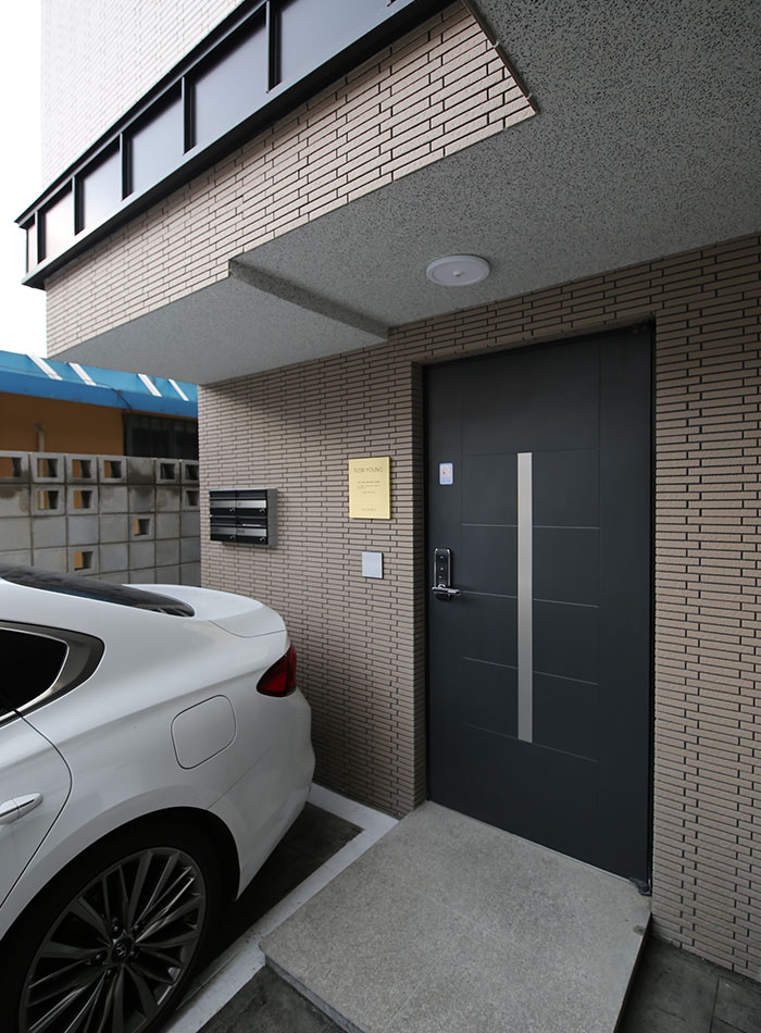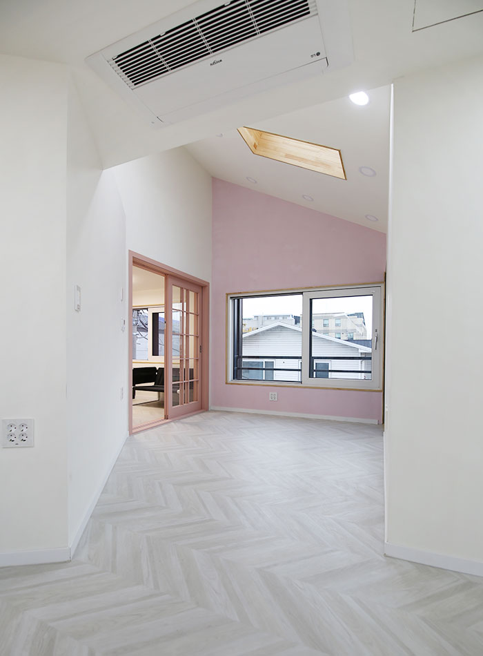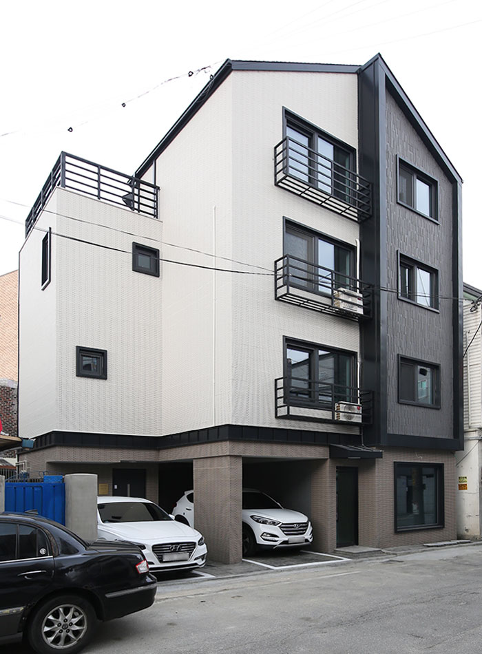 건축물대비 땅값이 비싼 도심지 건설은 최대건축영역을 확보하여 건축주의 경제적 이득을 꾀할 수 있도록 구성하는 것이 기본이다. 최대면적의 일반적인 공식을 따르기에는 땅이 5각형으로 생겨있어 설계구성을 통한 극복이 필요했던 프로젝트이다. 먼저 주차부분을 명확히 나누고, 공용실들을 둔각부분에 배치하여 침실을 직각부분에 배치함으로써 공간효율성을 도모하였다.