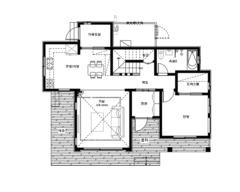 프로방스를 대표하는 것들 중 빠지지않고 꼽히는 것이 바로 뜨거운 태양과 오렌지빛 점토기와, 따스한 색감의 스타코플렉스이다. 전체적인 외관은 웅장함을 살릴 수 있는 박스형 매스를 베이스로 하되 이국적인 느낌을 살릴 수 있는 외장재와 포인트를 적용한 이번 설계는 시각적인 포인트와 조화로운 스타일에 중점을 두고 있다. 내부는 단순하게 공간을 구분해 거주자의 생활에 편의성을 담았다.