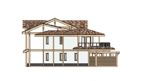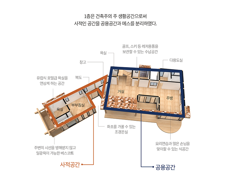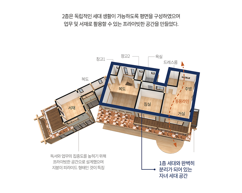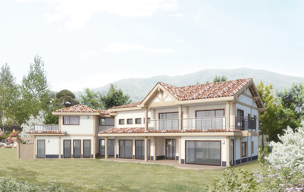 한옥의 느낌을 현대적으로 살린 이 설계는 친환경적인 건축과 지진에 강한 내진구조로 설계하기위해 주요 구조를 더글라스 중목구조(글루램)로 설계되었다. 같은 목구조의 주택이지만 경량목구조의 주택에서 느낄 수 없는 목재가 내/외부에 자연스럽게 노출되어 웅장함과 심미성을 느낄 수 있으며, 나무에서 나오는 산림욕 효과를 볼수 있는 주택이다.