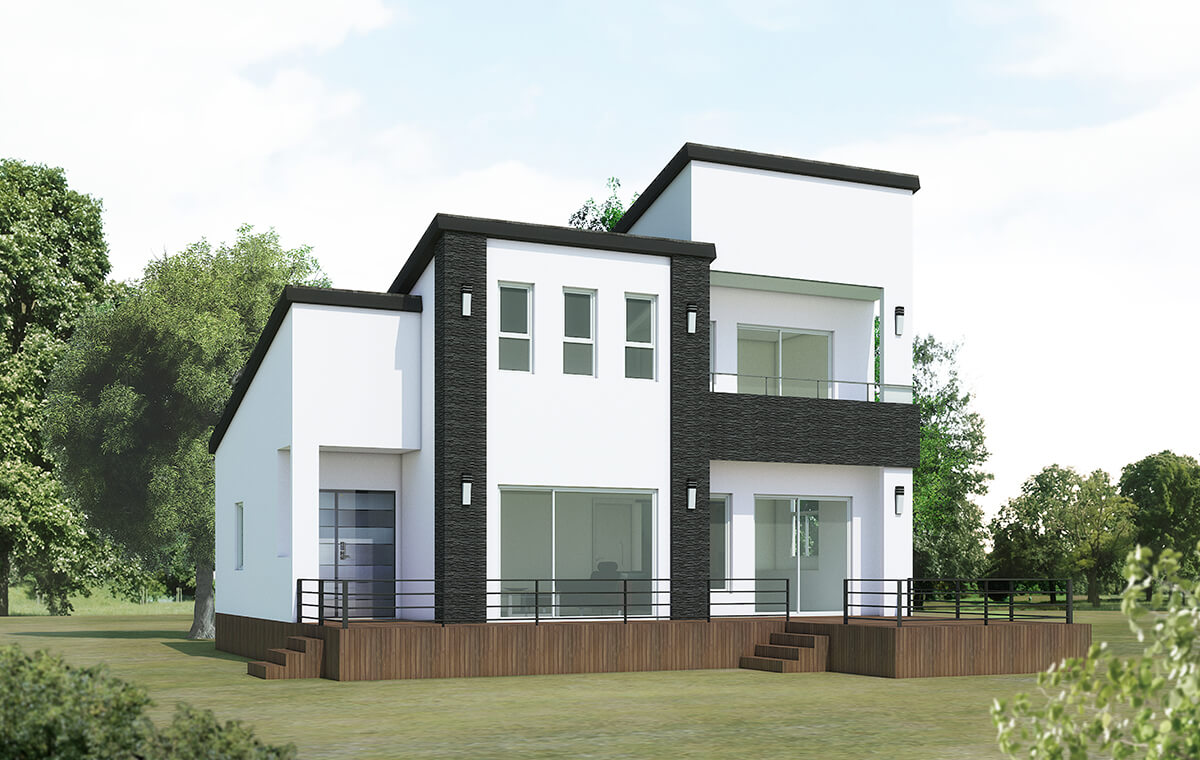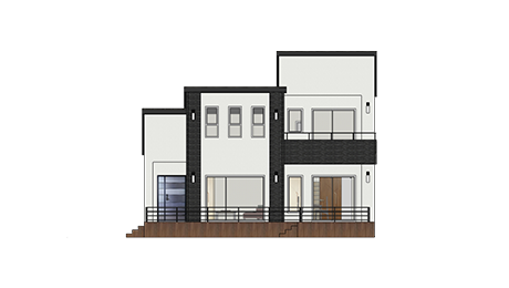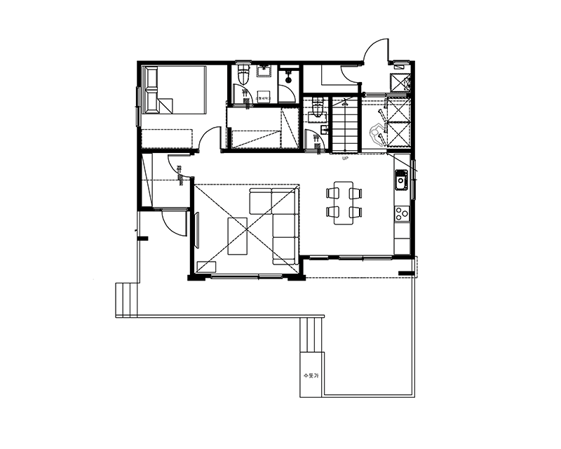 아산에 시공된 설계사례로, 사용자의 실용주의 성향을 평면에 반영하였다. 거실과 주방에는 모두 파티오창을 두어 전면부에 형성된 데크를 자유롭게 드날들 수 있도록 하였고, 데드 스페이스 없는 알찬 구성이 특징이다. 2층으로 올라가는 계단에는 도어를 설치해 1층과 2층 각 공간의 프라이버시를 보호할 수 있도록 하였다.