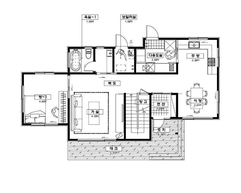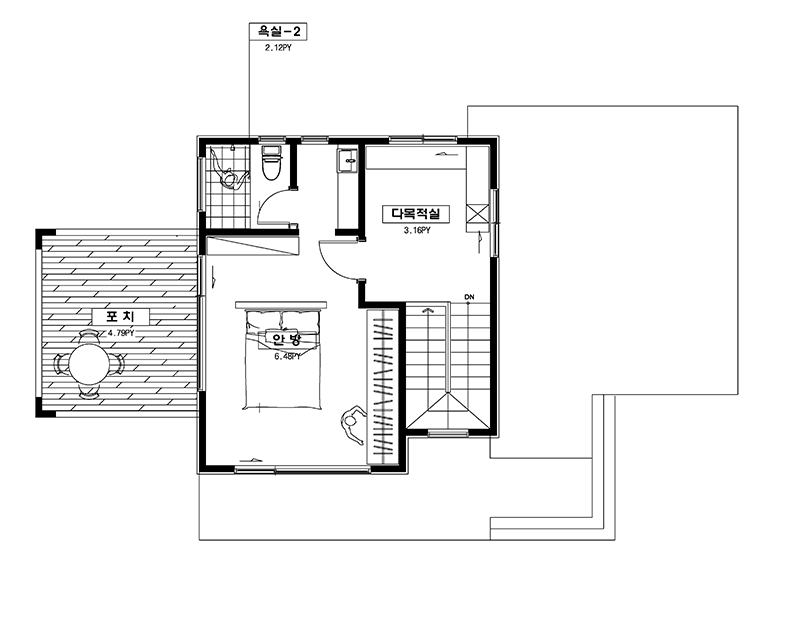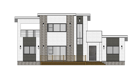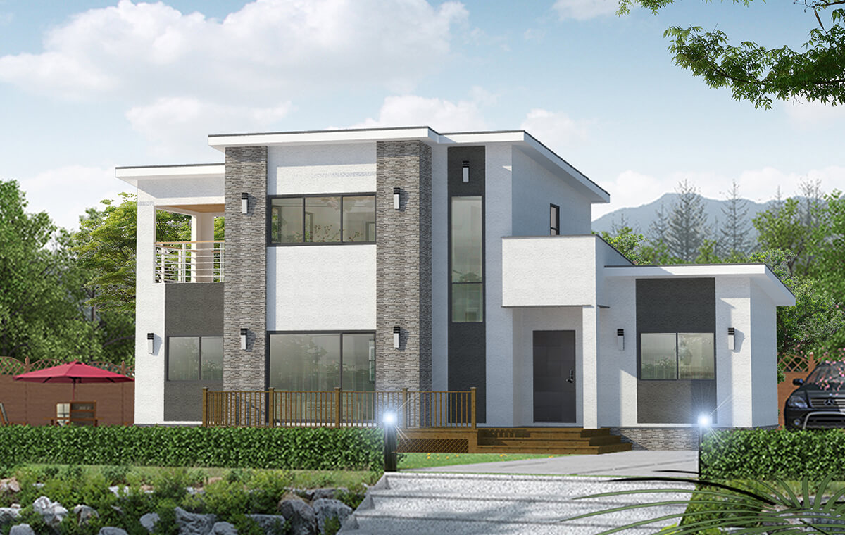 장방형으로 웅장하며 세련된 인상을 주는 주택은 간결한 면과 선의 조합으로 모던함을 살리되 주택 전면에 다양한 창과 2층의 발코니를 두어 단독주택만의 여유로움을 느낄 수 있다. 현관을 중심으로 거실과 주방공간을 분리하였으며, 주방 바로 옆에 다용도실에는 보조 요리공간과 수납공간을 조성하였으며, 2층의 넉넉한 사이즈의 포치는 전원생활의 여유로움을 즐기기에 손색이 없다.