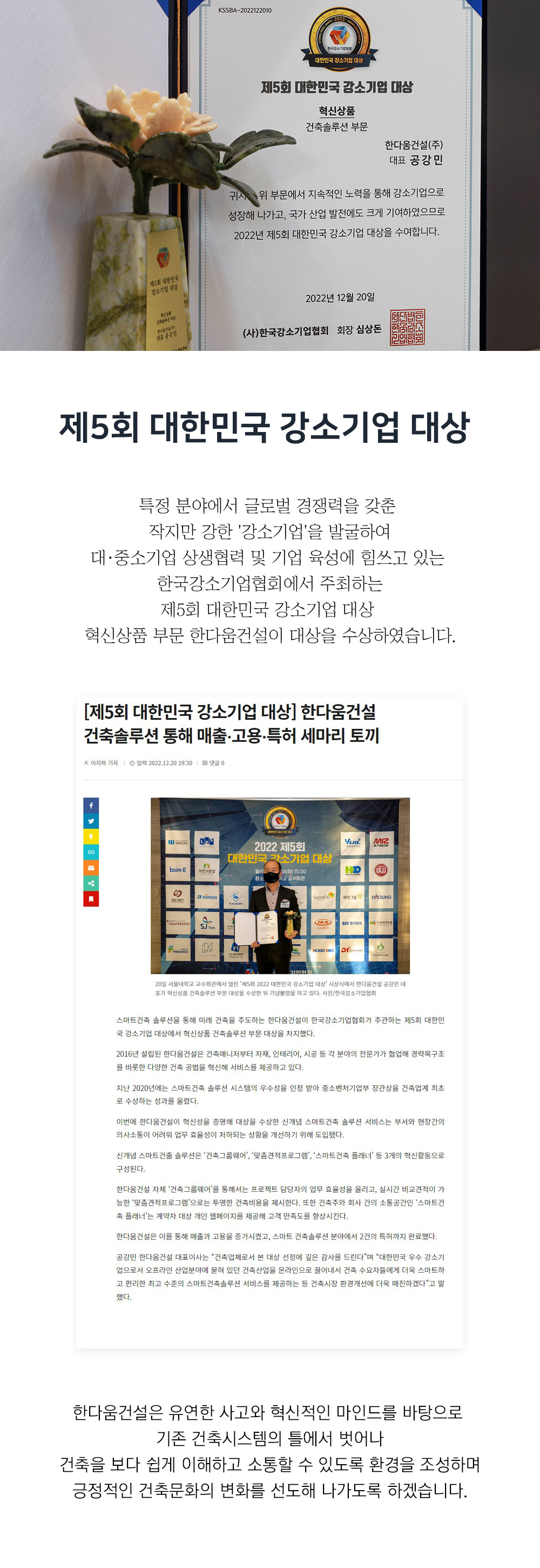 제 5회 대한민국 강소기업 대상 - 한다움건설