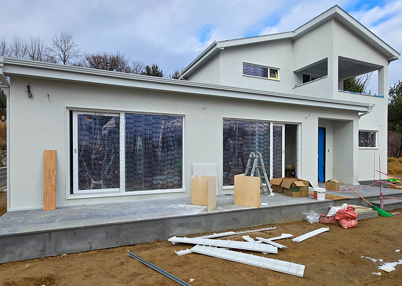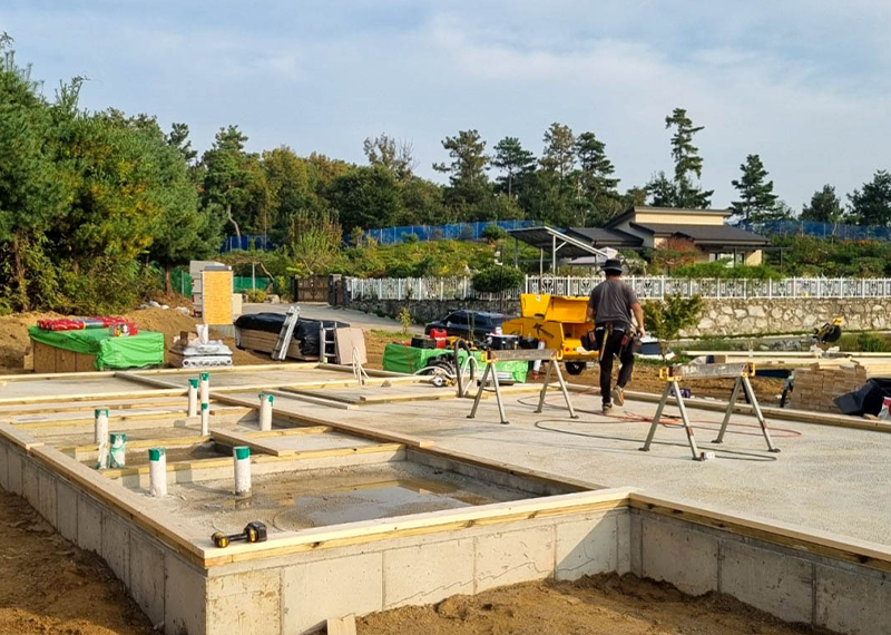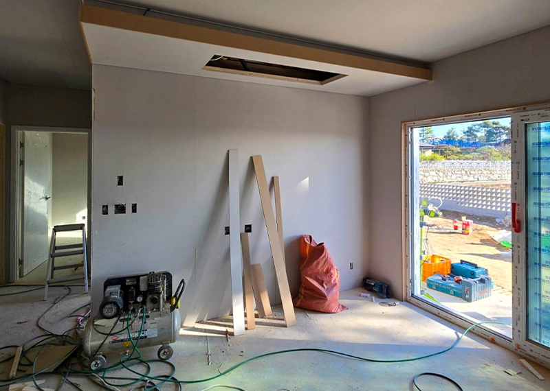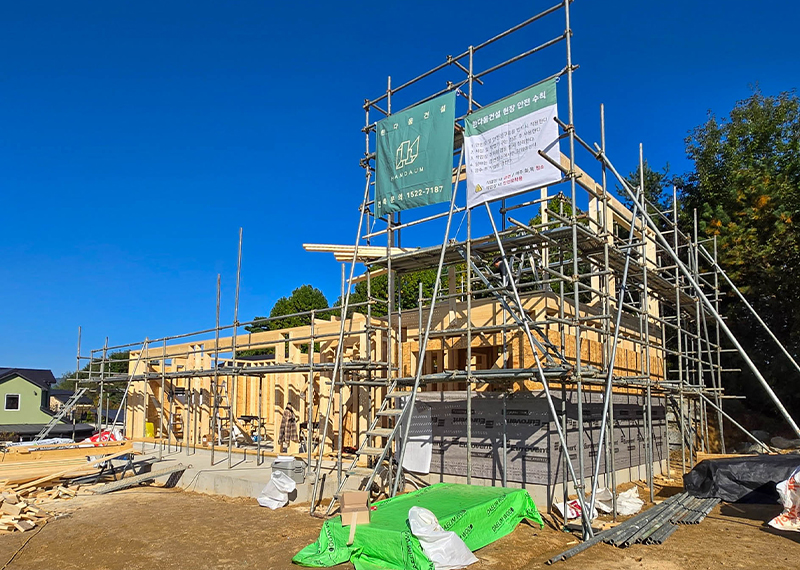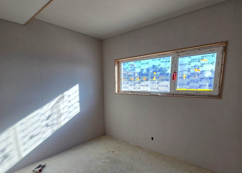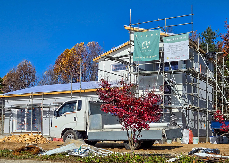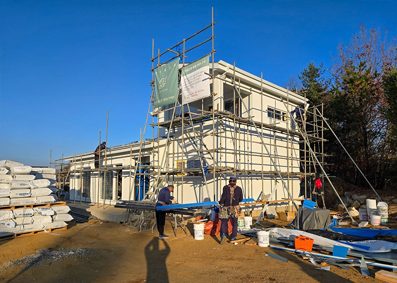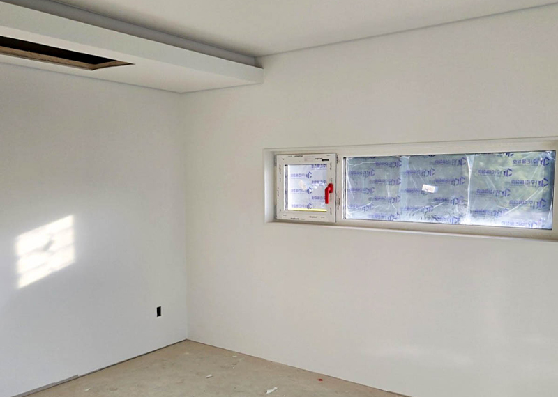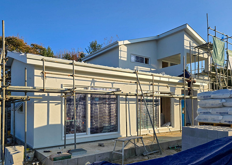 청주 현장의 건축주님은 건강이 좋지 않으신 와이프분을 위해 건축을 결심하게 되셨고 한다움건설과 함께 집짓기를 시작해주셨습니다.. 그 때문에 최대한 빨리 입주를 하고자했던 건축주님의 요청에 따라 최대한 서둘러 프로젝트를 진행하기도 하였는데요. 건축주 두분이 거주할 주택으로 기본적인 30평대 2층주택으로 평면을 구성하였습니다. 또 대형견을 키우고 계셨기에 집 내부에 반려견을 위한 공간 계획을 원하셨습니다. 건물 입면 디자인상 외장재를 화이트톤으로 맞추고자 하는 와이프분의 요청에 따라 외장재, 지붕재, 후레슁까지 전반적으로 화이트 계열의 자재들로 계획을 하였습니다.