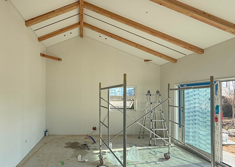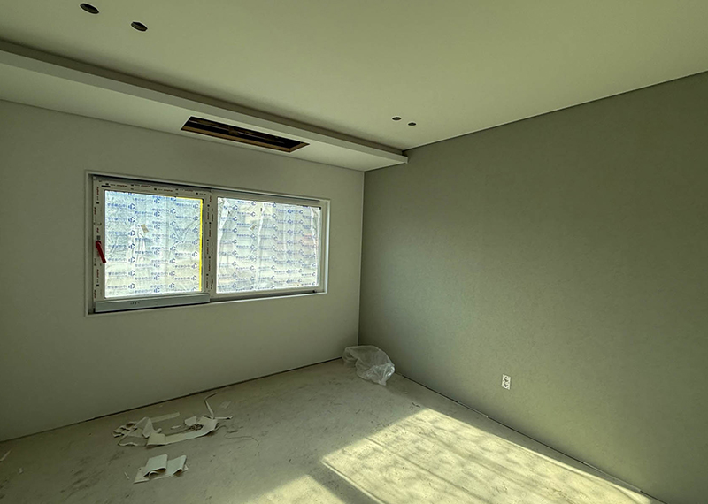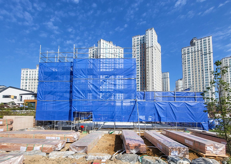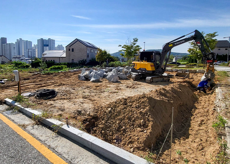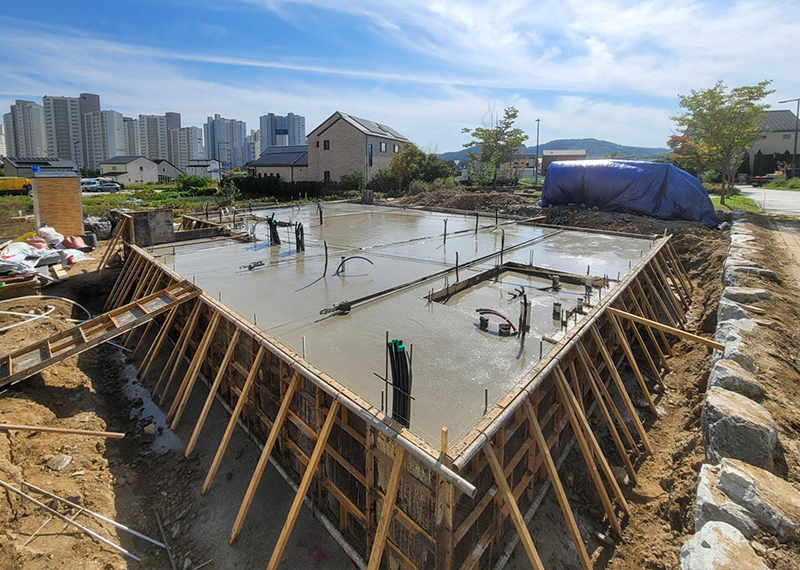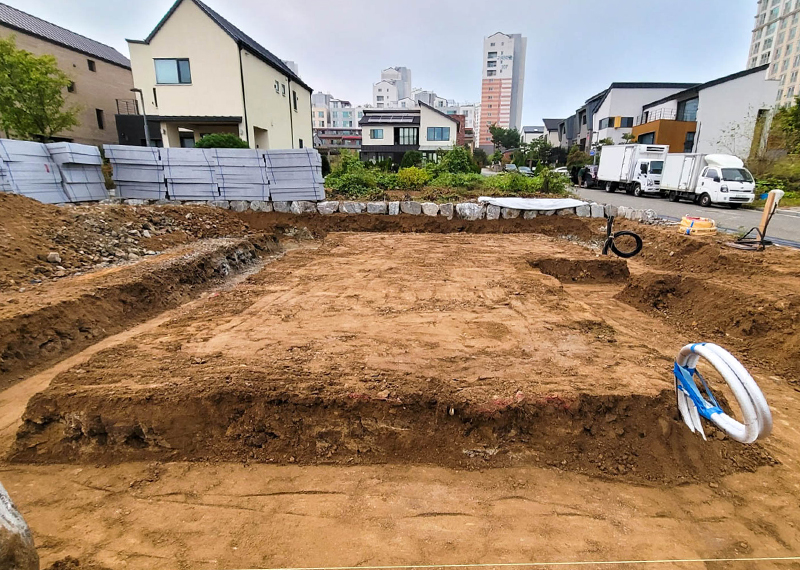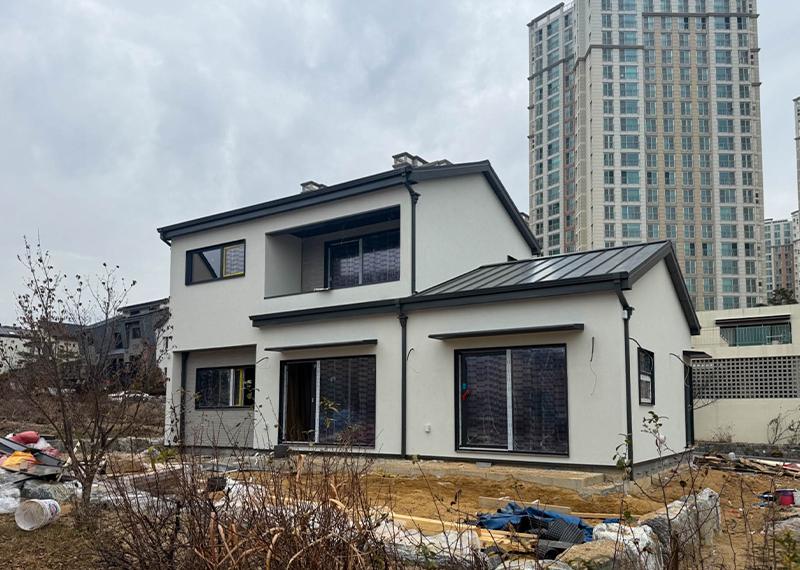 세종특별자치시 프로젝트는 전반적으로 대지 내 고저차가 있는 택지지구이기 때문에 크게 토목 공사 비용이 발생되지 않는 계획으로 진행되었습니다. 규모가 그리 크지 않은 주택이기 때문에 필요한 실구성은 적당한 공간으로 계획하고 거실과 주방 및 식당 공간을 조닝을 연접하였고 두 공간 모두 앞 마당과의 진출입을 원활하게 하고자 하였습니다. 주택 디자인은 스타코플렉스 베이스에 적당한 입면 볼륨을 연출하고자 모노타일로 포인트를 주어 연출하였습니다.
