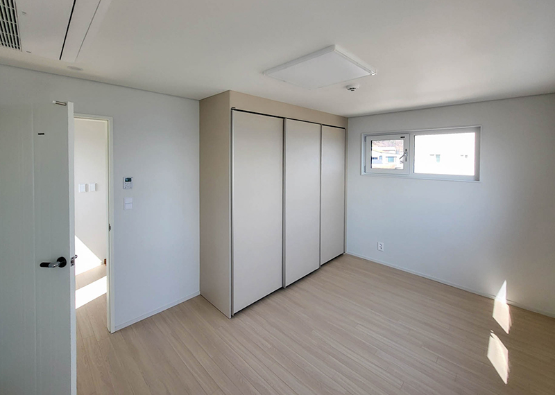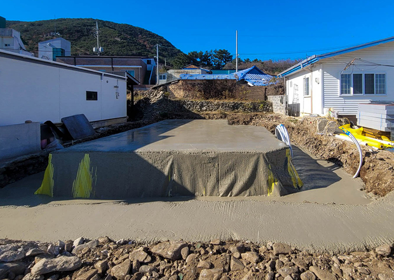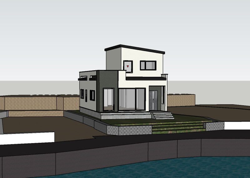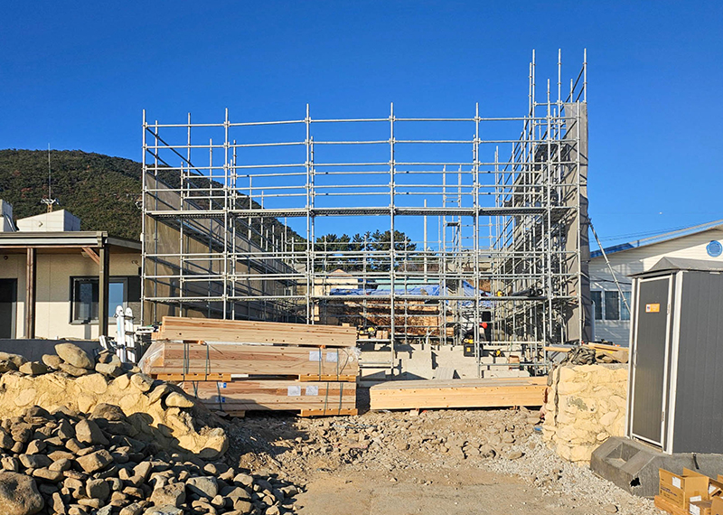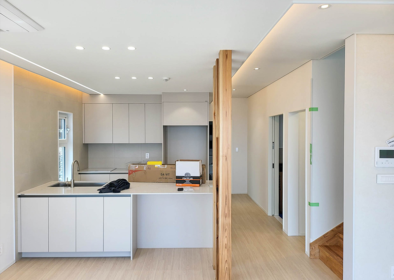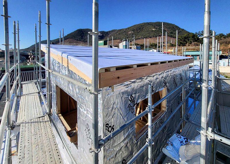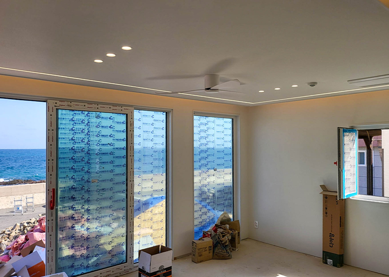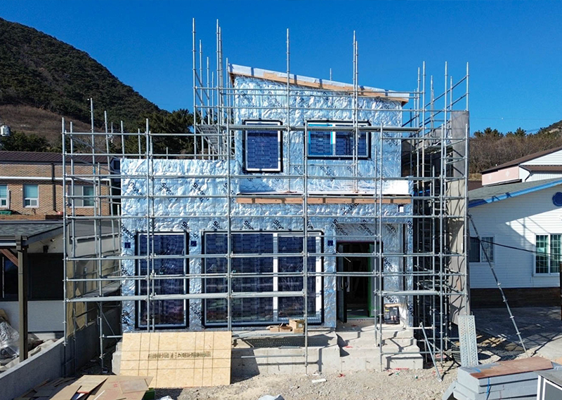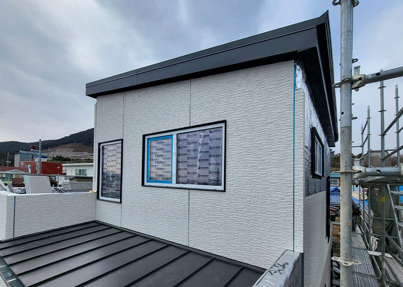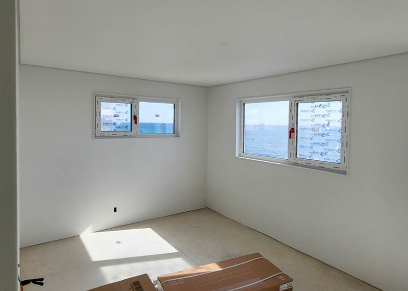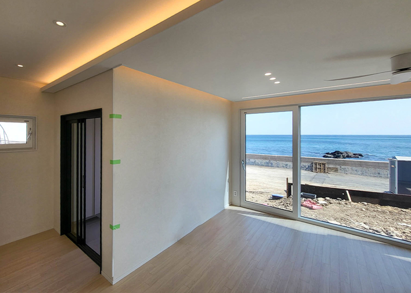 평소 낚시를 즐겨하시는 건축주님은 바다 바로 앞 대지에 건축을 계획하고 계셨습니다. 낚시를 하기도 하고 친인척분들을 모시고 시간을 보낼 수 있는 세컨하우스 용도로 짓고자 하시며, 탁 트인 바다가 바로 보일 수 있길 원하셨습니다. 하지만 땅이 세로로 길기 때문에 모든 실을 바다쪽으로 배치하기엔 한계가 있어 거실, 주방, 안방 순으로 배치하였고 거실-주방을 연결시켜 바다가 보이게 설계하였습니다. 또 바다 근처이기 때문에 자재에 관련해 궁금한 점이 많으셨고, 외장 손상에 크게 영향이 없는 세라믹사이딩을 추천드렸습니다.