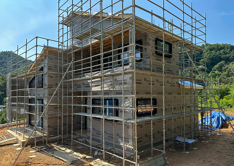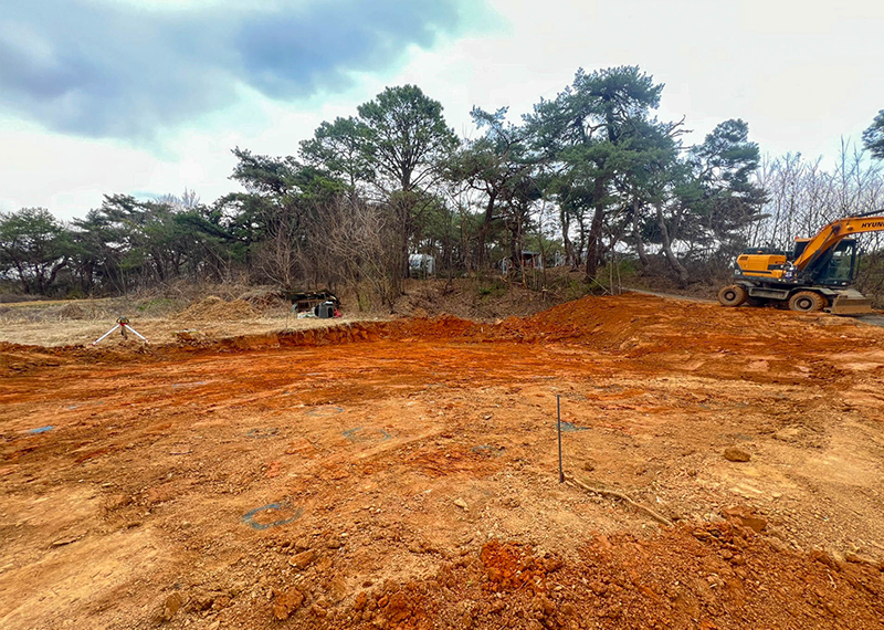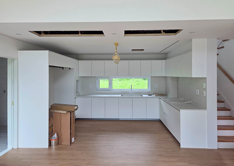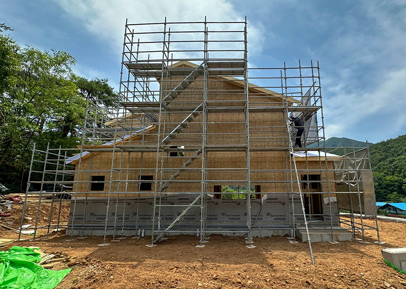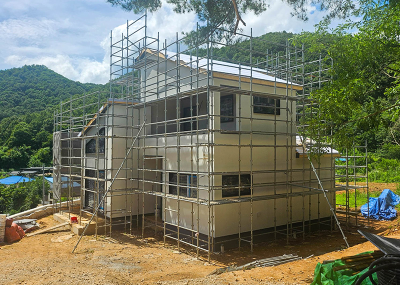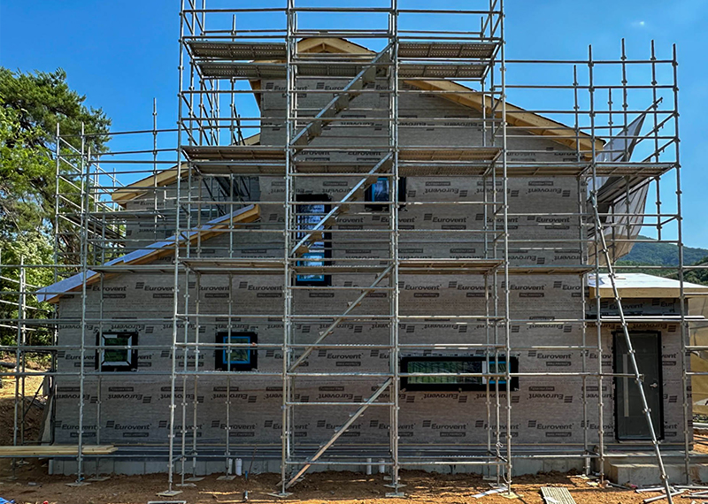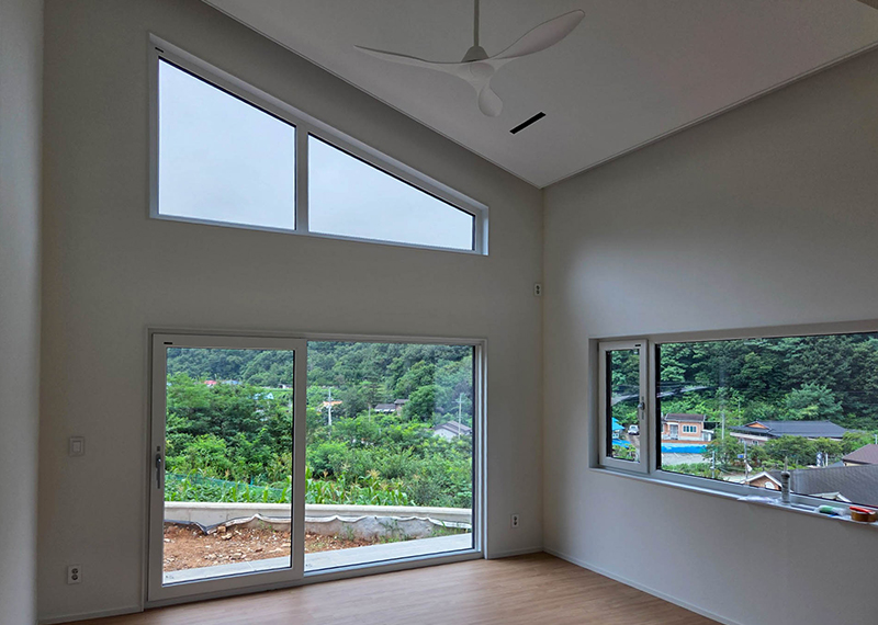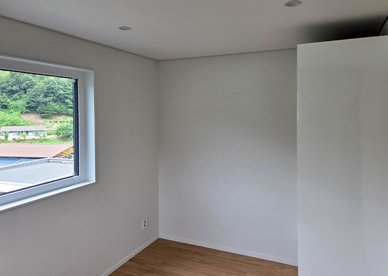 홈페이지를 통해 문의를 주신 건축주님은 여러 업체와 상담을 병행하시던 중, 현장 미팅을 통해 대지의 가장 큰 이점인 탁 트인 경관과 소나무를 살린 설계를 원하셨습니다. 건축주님의 니즈와 라이프스타일을 고려하여 상담을 도와드렸고, 최종적으로 한다움건설과의 상담 후 신뢰를 바탕으로 계약이 진행되었습니다. 설계는 남향의 아름다운 뷰를 고려해 거실과 안방을 배치하고, 거실과 주방은 일자로 연결해 개방감을 살렸습니다. 2층에는 포치를 두어 자연을 더 가까이 즐길 수 있도록 했으며, 외관은 단정한 박공지붕과 스타코 마감에 포인트 타일을 더해 안정감 있게 완성했습니다.