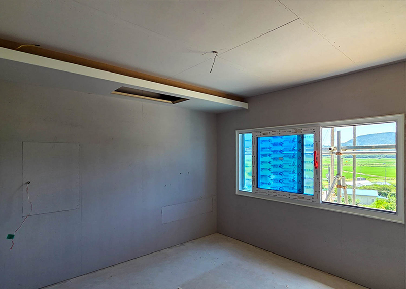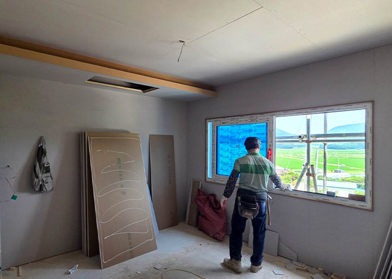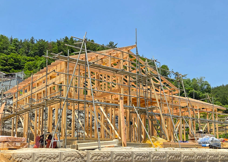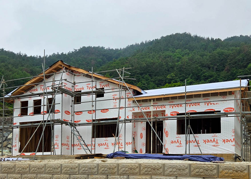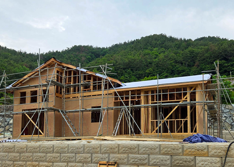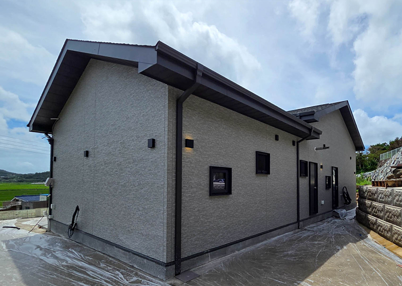 이번 프로젝트는 남동쪽으로 시원하게 열린 전망이 인상적인 대지에 지어지는 단독주택입니다. 처음 이 부지를 마주한 건축주께서는, 대지 너머로 펼쳐지는 광활한 시야와 드넓은 하늘을 보며 이곳에 자신만의 집을 짓고 싶다는 오랜 꿈을 실현할 수 있을 것 같은 기대감을 가지셨습니다. 하지만 대지는 도로와 접해 있음에도 불구하고 가파른 경사 때문에 차량 진입이 쉽지 않은 조건이었습니다. 이러한 현실적인 어려움을 해결하기 위해, 별도의 차량 진입로를 계획하고, 진입 후 건축물 전면을 넓은 마당으로 활용할 수 있도록 전체 배치를 구성하였습니다. 건축주님은 단순한 주거공간이 아닌, 오랜 시간 머릿속에 그려오던 자신만의 로망이 담긴 집을 원하셨습니다. 특히 평소에 꿈꿔오던 다락방 공간은 꼭 포함되길 원하셨고, 이는 실제 설계에 반영되어 작지만 특별한 공간으로 완성되었습니다. 뿐만 아니라 각 실의 구조, 창의 위치, 마감재 선택 등에서도 건축주의 섬세한 취향이 전반적으로 반영되었으며, 이를 위해 수차례의 상담과 조율이 이루어졌습니다.
