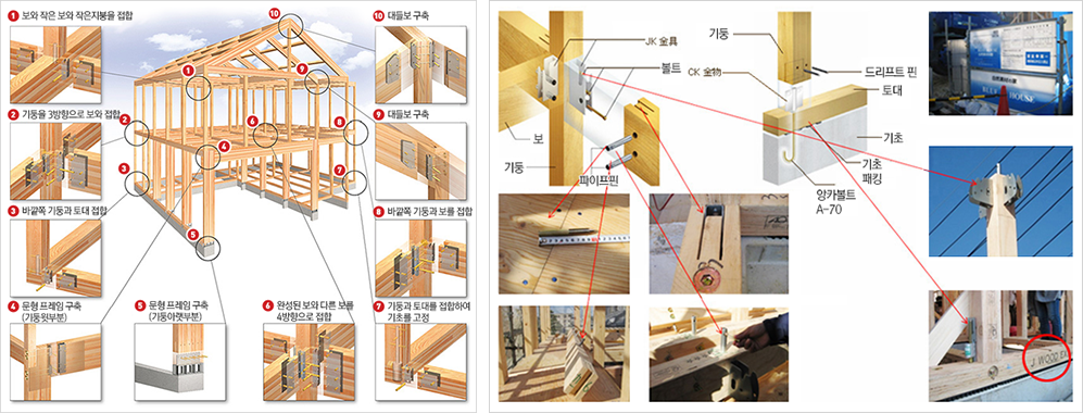 사각이나 원형의 기둥과 각각의 보에 암,수 ,홈가공을 하여 서로 끼워 맞추어 건물의 뼈대를 구상하는 공법인
