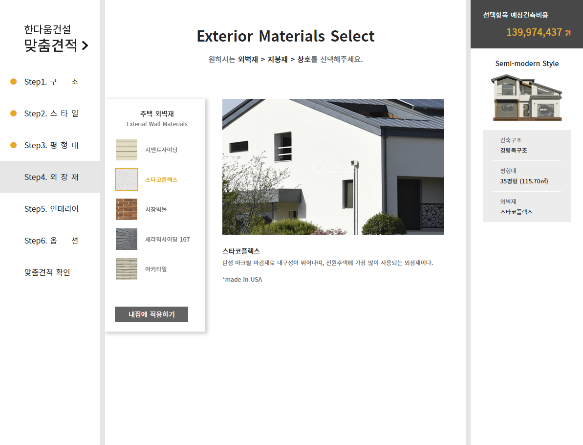 원하시는 외벽재 > 지붕재 > 창호를 선택해주세요.