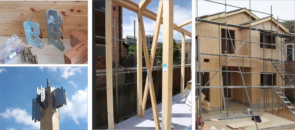 사용하여 7.5도의 지진에도 견딜수 있으며, 횡력에 저항할 수 있는 내력벽(가새, 석고보드, 구조용합판)을 시공하여 더욱더 강한 구조력과 내진성이