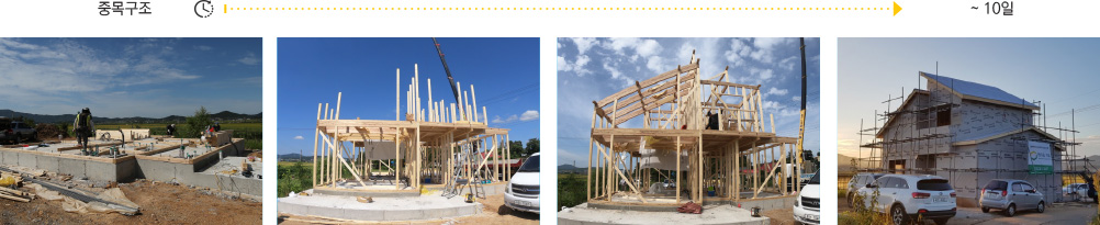 중목구조는 골조작업시 현장에서 목재를 재단없이 프리컷 가공된 부재를 바로 조립하기 때문에 경량목구조에 비해 빠른 시공이 가능하여, 빠른 골조작업과