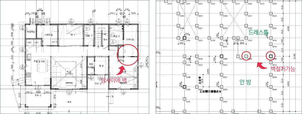 중목구조는 기둥과 보가 집을 지지하기 때문에 벽을 자유로히 철거할 수 있어 리모델링시 공간의 경계를 바꾸기 쉽다.